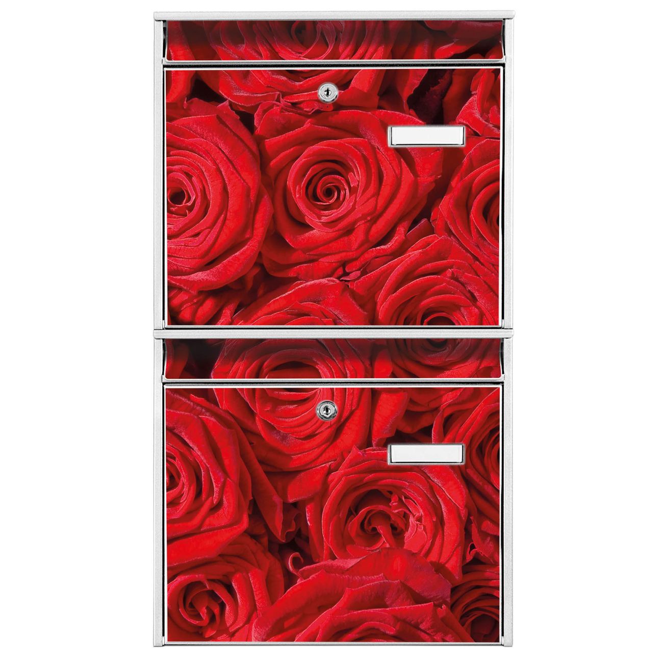 FUNKTION: Die Burg-Wächter Briefkastenanlage mit Motiv Rosenbett bietet Ihnen ausreichend Fassungsvermögen um auch A4 und C4 Sendungen zu empfangen. Das integrierte Namensschild lässt sich individuell beschriften. Wählen Sie aus den Grundfarben weiß, silber und schwarz. DESIGN: Die 2 Briefkästen haben ein ansprechendes und zeitloses Design, ohne dabei auf Funktionalität zu verzichten. Das Material ist sehr stabil, wetterfest und rostfrei. Durch das Motiv Rosenbett werden die Postkästen zu einem Blickfang. DETAILS: Die Postkästen bestehen aus verzinktem Stahl der zusätzlich mit Klarlack versiegelt wurde. Die Kästen sind gesamt 64,5cm hoch, 36,2cm breit und 10cm tief. Das Motiv besteht aus einer wetter- und UV-festen Folie, die Ihren Briefkasten zusätzlich vor Kratzern schützt. Die Postkästen werden mit Montagematerial, je einem Namensschild und je zwei Schlüsseln geliefert. NUTZEN: Das Briefkastenset eignet sich für die Wandmontage, die Größe bietet genügend Platz für Sendungen aller Art. Das zeitlose Design sowie die stabile Bauart bieten Ihnen einen treuen Begleiter für Ihre Post. BANJADO:
