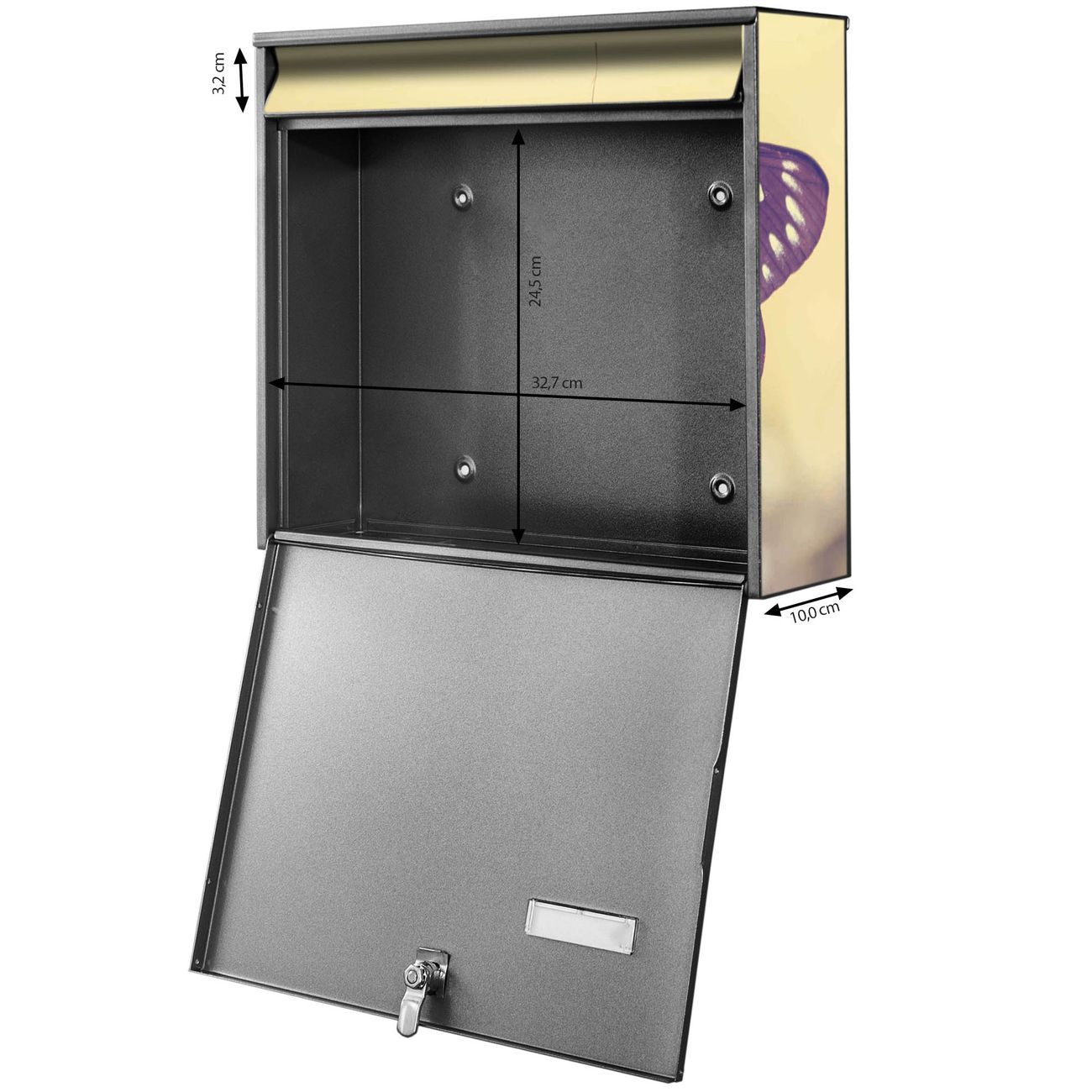 FUNKTION: Die Burg-Wächter Briefkastenanlage mit Motiv Rotgelber Falter bietet Ihnen ausreichend Fassungsvermögen um auch A4 und C4 Sendungen zu empfangen. Das integrierte Namensschild lässt sich individuell beschriften. Wählen Sie aus den Grundfarben weiß, silber und schwarz. DESIGN: Die 2 Briefkästen haben ein ansprechendes und zeitloses Design, ohne dabei auf Funktionalität zu verzichten. Das Material ist sehr stabil, wetterfest und rostfrei. Durch das Motiv Rotgelber Falter werden die Postkästen zu einem Blickfang. DETAILS: Die Postkästen bestehen aus verzinktem Stahl der zusätzlich mit Klarlack versiegelt wurde. Die Kästen sind gesamt 64,5cm hoch, 36,2cm breit und 10cm tief. Das Motiv besteht aus einer wetter- und UV-festen Folie, die Ihren Briefkasten zusätzlich vor Kratzern schützt. Die Postkästen werden mit Montagematerial, je einem Namensschild und je zwei Schlüsseln geliefert. NUTZEN: Das Briefkastenset eignet sich für die Wandmontage, die Größe bietet genügend Platz für Sendungen aller Art. Das zeitlose Design sowie die stabile Bauart bieten Ihnen einen treuen Begleiter für Ihre Post. BANJADO: