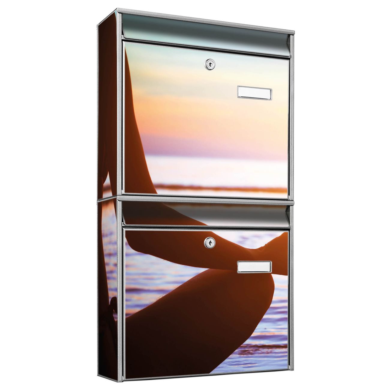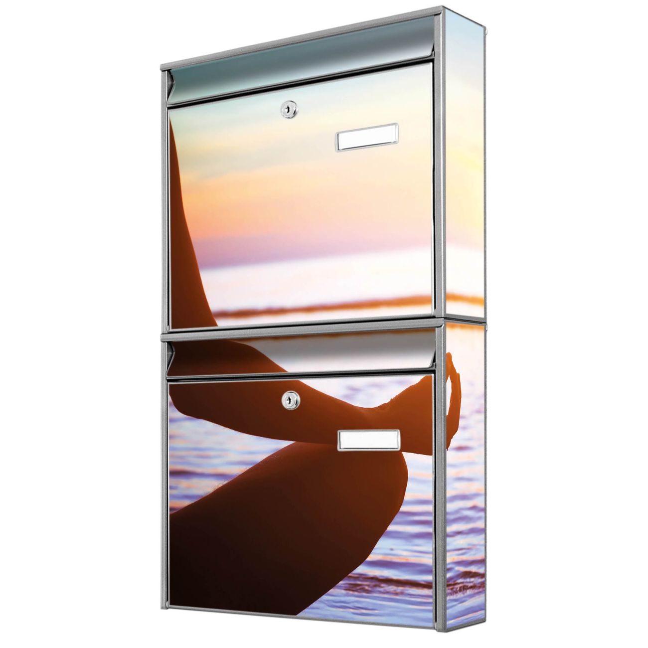 FUNKTION: Die Burg-Wächter Briefkastenanlage mit Motiv Ruhe bietet Ihnen ausreichend Fassungsvermögen um auch A4 und C4 Sendungen zu empfangen. Das integrierte Namensschild lässt sich individuell beschriften. Wählen Sie aus den Grundfarben weiß, silber und schwarz. DESIGN: Die 2 Briefkästen haben ein ansprechendes und zeitloses Design, ohne dabei auf Funktionalität zu verzichten. Das Material ist sehr stabil, wetterfest und rostfrei. Durch das Motiv Ruhe werden die Postkästen zu einem Blickfang. DETAILS: Die Postkästen bestehen aus verzinktem Stahl der zusätzlich mit Klarlack versiegelt wurde. Die Kästen sind gesamt 64,5cm hoch, 36,2cm breit und 10cm tief. Das Motiv besteht aus einer wetter- und UV-festen Folie, die Ihren Briefkasten zusätzlich vor Kratzern schützt. Die Postkästen werden mit Montagematerial, je einem Namensschild und je zwei Schlüsseln geliefert. NUTZEN: Das Briefkastenset eignet sich für die Wandmontage, die Größe bietet genügend Platz für Sendungen aller Art. Das zeitlose Design sowie die stabile Bauart bieten Ihnen einen treuen Begleiter für Ihre Post. BANJADO: