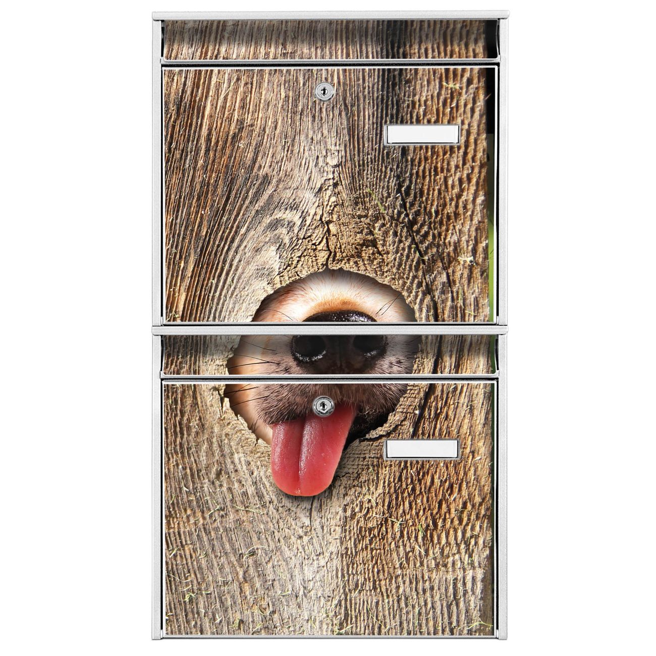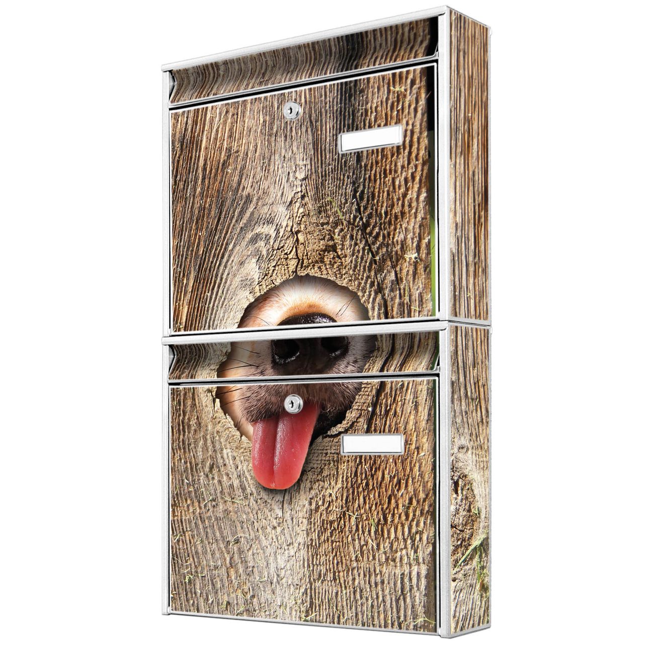 FUNKTION: Die Burg-Wächter Briefkastenanlage mit Motiv Rumschnüffeln bietet Ihnen ausreichend Fassungsvermögen um auch A4 und C4 Sendungen zu empfangen. Das integrierte Namensschild lässt sich individuell beschriften. Wählen Sie aus den Grundfarben weiß, silber und schwarz. DESIGN: Die 2 Briefkästen haben ein ansprechendes und zeitloses Design, ohne dabei auf Funktionalität zu verzichten. Das Material ist sehr stabil, wetterfest und rostfrei. Durch das Motiv Rumschnüffeln werden die Postkästen zu einem Blickfang. DETAILS: Die Postkästen bestehen aus verzinktem Stahl der zusätzlich mit Klarlack versiegelt wurde. Die Kästen sind gesamt 64,5cm hoch, 36,2cm breit und 10cm tief. Das Motiv besteht aus einer wetter- und UV-festen Folie, die Ihren Briefkasten zusätzlich vor Kratzern schützt. Die Postkästen werden mit Montagematerial, je einem Namensschild und je zwei Schlüsseln geliefert. NUTZEN: Das Briefkastenset eignet sich für die Wandmontage, die Größe bietet genügend Platz für Sendungen aller Art. Das zeitlose Design sowie die stabile Bauart bieten Ihnen einen treuen Begleiter für Ihre Post. BANJADO: