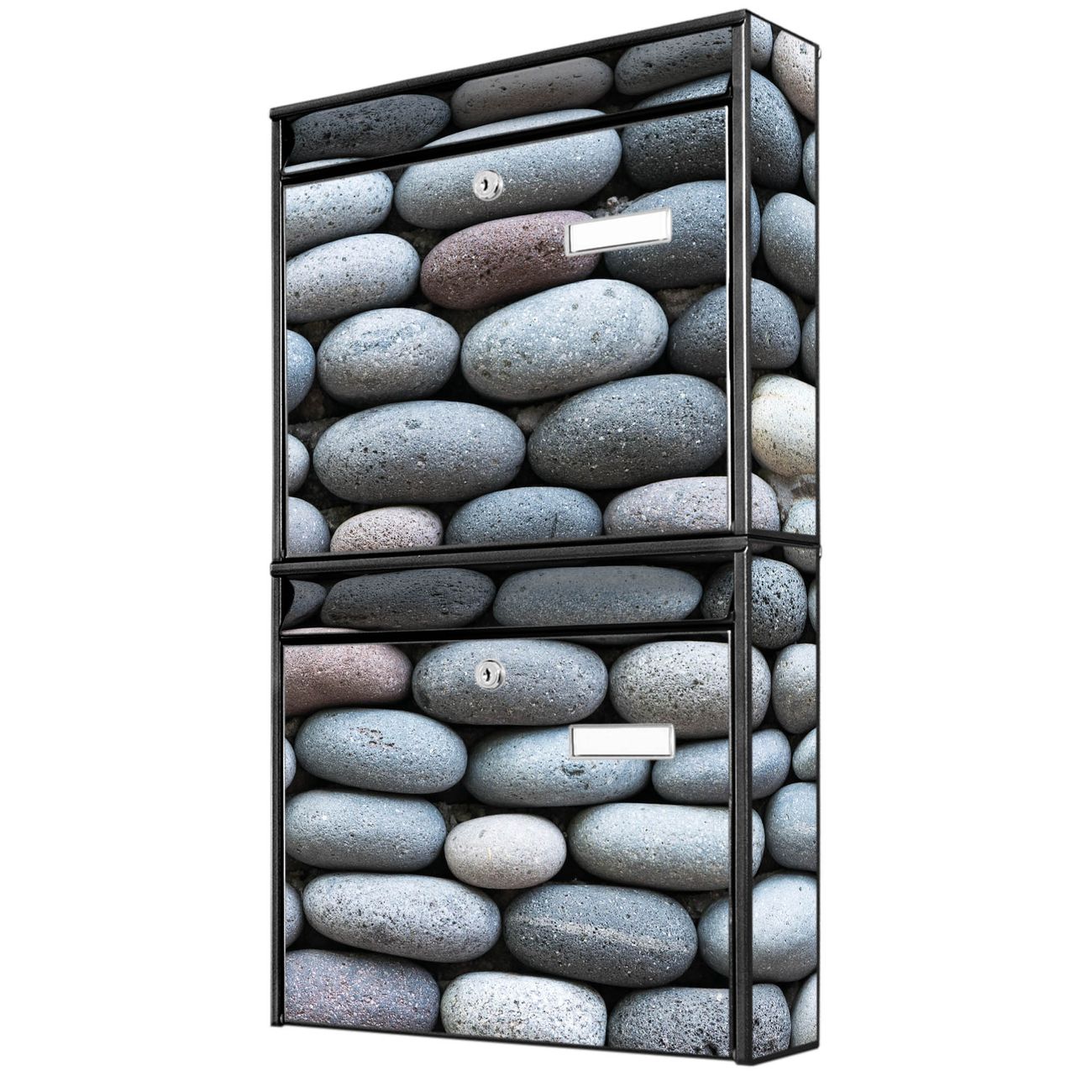 FUNKTION: Die Burg-Wächter Briefkastenanlage mit Motiv Runde Steine bietet Ihnen ausreichend Fassungsvermögen um auch A4 und C4 Sendungen zu empfangen. Das integrierte Namensschild lässt sich individuell beschriften. Wählen Sie aus den Grundfarben weiß, silber und schwarz. DESIGN: Die 2 Briefkästen haben ein ansprechendes und zeitloses Design, ohne dabei auf Funktionalität zu verzichten. Das Material ist sehr stabil, wetterfest und rostfrei. Durch das Motiv Runde Steine werden die Postkästen zu einem Blickfang. DETAILS: Die Postkästen bestehen aus verzinktem Stahl der zusätzlich mit Klarlack versiegelt wurde. Die Kästen sind gesamt 64,5cm hoch, 36,2cm breit und 10cm tief. Das Motiv besteht aus einer wetter- und UV-festen Folie, die Ihren Briefkasten zusätzlich vor Kratzern schützt. Die Postkästen werden mit Montagematerial, je einem Namensschild und je zwei Schlüsseln geliefert. NUTZEN: Das Briefkastenset eignet sich für die Wandmontage, die Größe bietet genügend Platz für Sendungen aller Art. Das zeitlose Design sowie die stabile Bauart bieten Ihnen einen treuen Begleiter für Ihre Post. BANJADO: