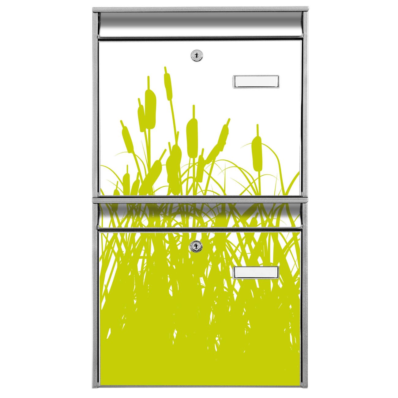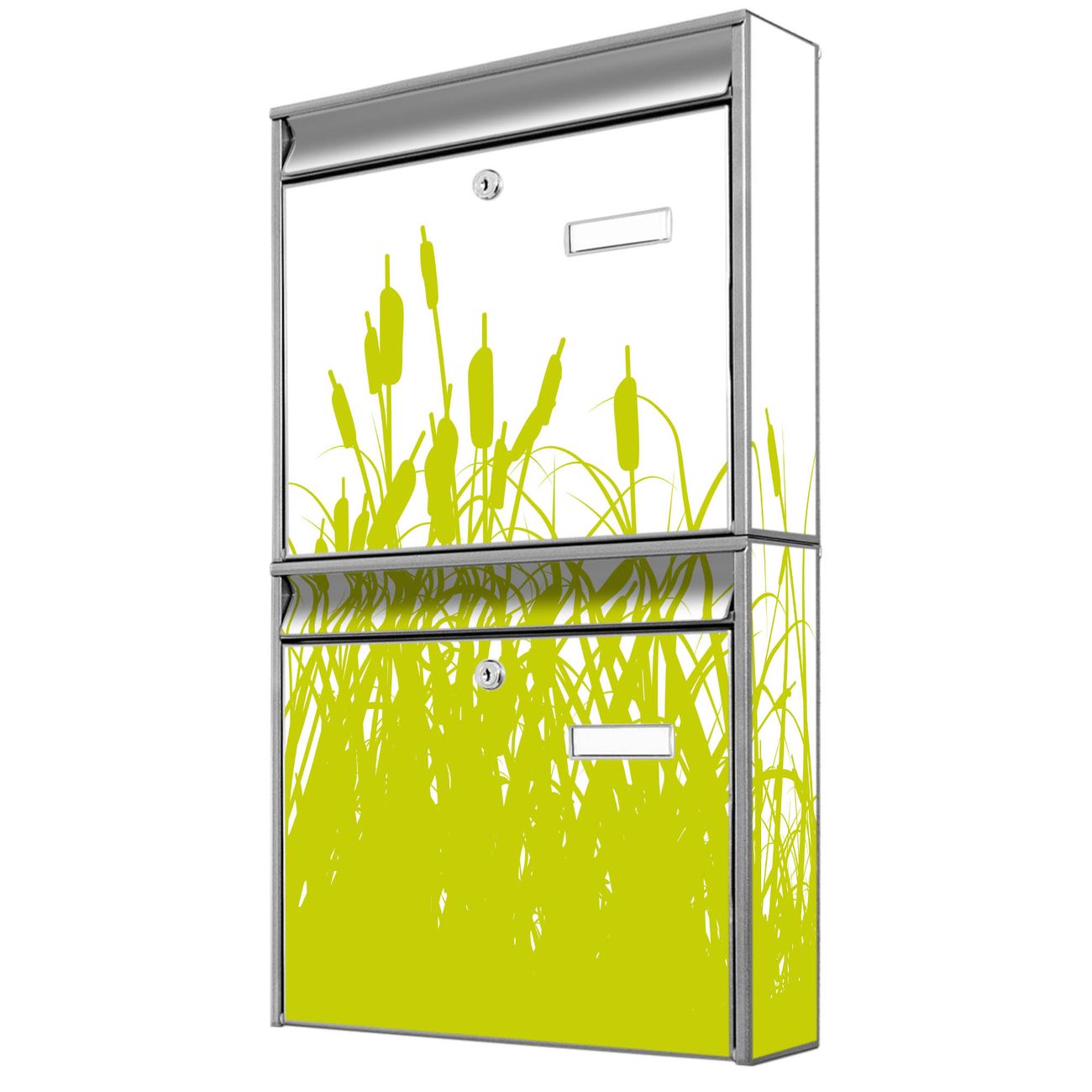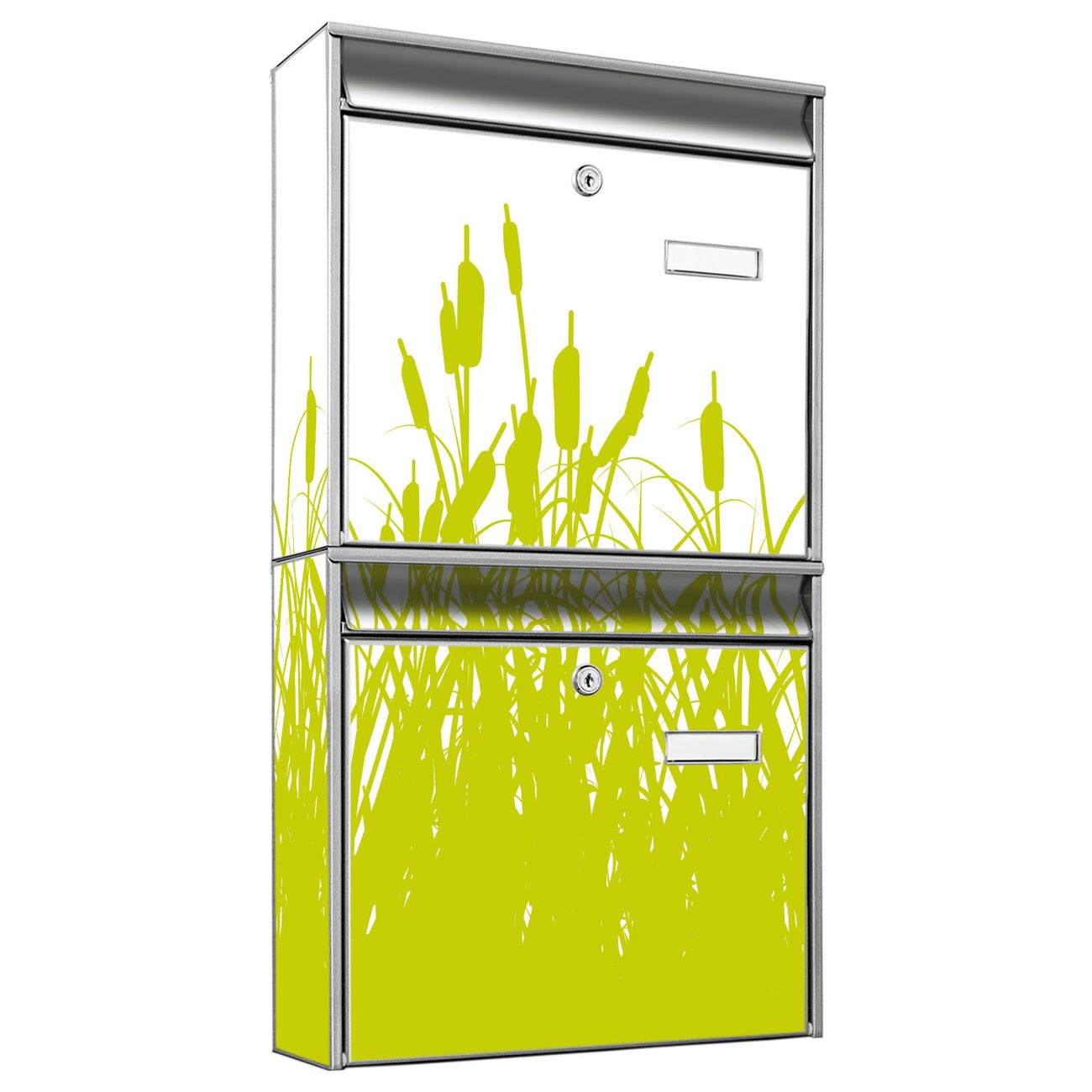FUNKTION: Die Burg-Wächter Briefkastenanlage mit Motiv Schilf bietet Ihnen ausreichend Fassungsvermögen um auch A4 und C4 Sendungen zu empfangen. Das integrierte Namensschild lässt sich individuell beschriften. Wählen Sie aus den Grundfarben weiß, silber und schwarz. DESIGN: Die 2 Briefkästen haben ein ansprechendes und zeitloses Design, ohne dabei auf Funktionalität zu verzichten. Das Material ist sehr stabil, wetterfest und rostfrei. Durch das Motiv Schilf werden die Postkästen zu einem Blickfang. DETAILS: Die Postkästen bestehen aus verzinktem Stahl der zusätzlich mit Klarlack versiegelt wurde. Die Kästen sind gesamt 64,5cm hoch, 36,2cm breit und 10cm tief. Das Motiv besteht aus einer wetter- und UV-festen Folie, die Ihren Briefkasten zusätzlich vor Kratzern schützt. Die Postkästen werden mit Montagematerial, je einem Namensschild und je zwei Schlüsseln geliefert. NUTZEN: Das Briefkastenset eignet sich für die Wandmontage, die Größe bietet genügend Platz für Sendungen aller Art. Das zeitlose Design sowie die stabile Bauart bieten Ihnen einen treuen Begleiter für Ihre Post. BANJADO: