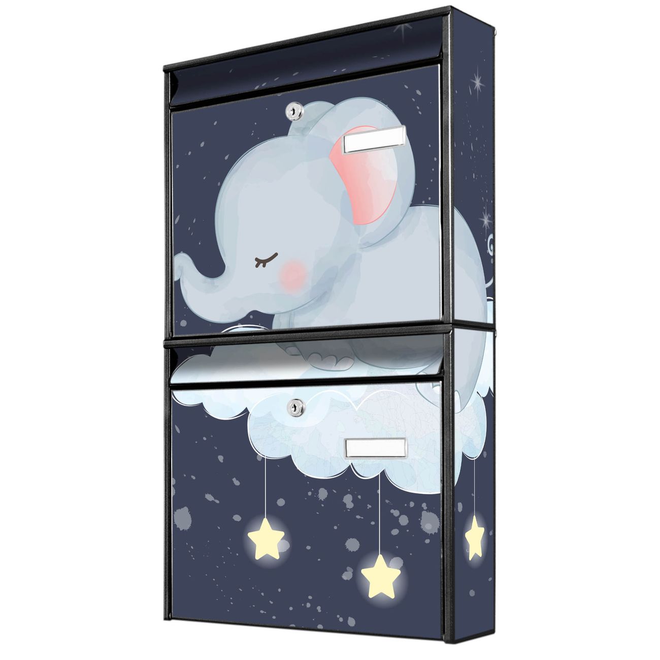 FUNKTION: Die Burg-Wächter Briefkastenanlage mit Motiv schlafender Elefant bietet Ihnen ausreichend Fassungsvermögen um auch A4 und C4 Sendungen zu empfangen. Das integrierte Namensschild lässt sich individuell beschriften. Wählen Sie aus den Grundfarben weiß, silber und schwarz. DESIGN: Die 2 Briefkästen haben ein ansprechendes und zeitloses Design, ohne dabei auf Funktionalität zu verzichten. Das Material ist sehr stabil, wetterfest und rostfrei. Durch das Motiv schlafender Elefant werden die Postkästen zu einem Blickfang. DETAILS: Die Postkästen bestehen aus verzinktem Stahl der zusätzlich mit Klarlack versiegelt wurde. Die Kästen sind gesamt 64,5cm hoch, 36,2cm breit und 10cm tief. Das Motiv besteht aus einer wetter- und UV-festen Folie, die Ihren Briefkasten zusätzlich vor Kratzern schützt. Die Postkästen werden mit Montagematerial, je einem Namensschild und je zwei Schlüsseln geliefert. NUTZEN: Das Briefkastenset eignet sich für die Wandmontage, die Größe bietet genügend Platz für Sendungen aller Art. Das zeitlose Design sowie die stabile Bauart bieten Ihnen einen treuen Begleiter für Ihre Post. BANJADO: