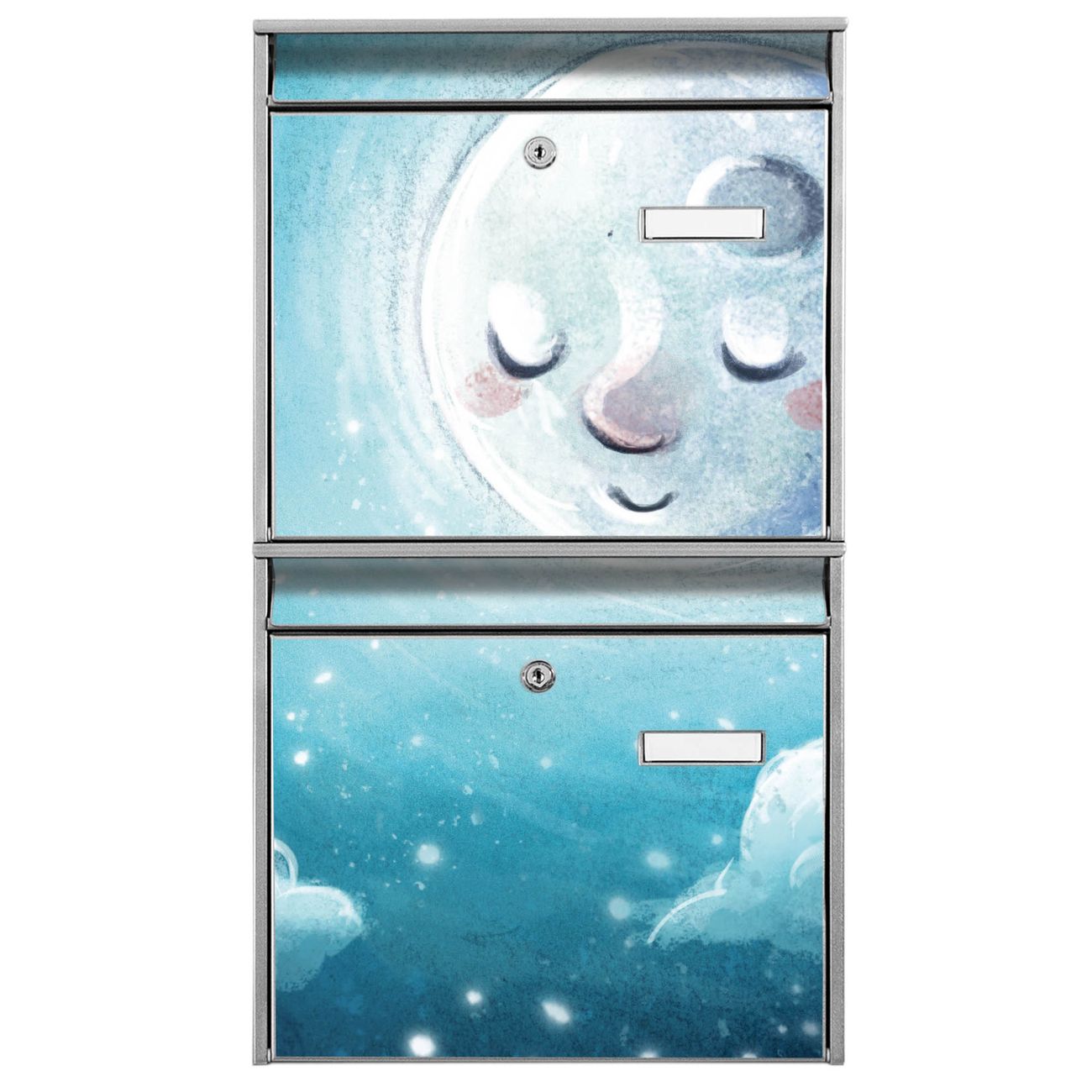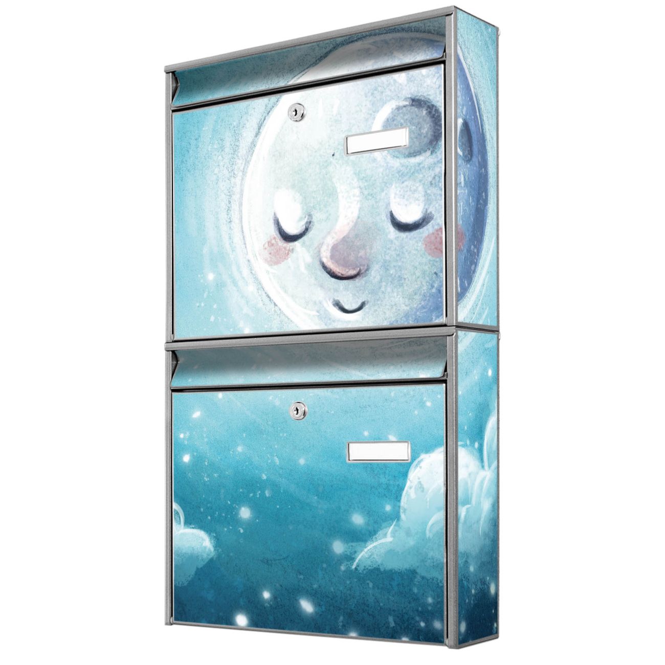 FUNKTION: Die Burg-Wächter Briefkastenanlage mit Motiv schlafender Mond bietet Ihnen ausreichend Fassungsvermögen um auch A4 und C4 Sendungen zu empfangen. Das integrierte Namensschild lässt sich individuell beschriften. Wählen Sie aus den Grundfarben weiß, silber und schwarz. DESIGN: Die 2 Briefkästen haben ein ansprechendes und zeitloses Design, ohne dabei auf Funktionalität zu verzichten. Das Material ist sehr stabil, wetterfest und rostfrei. Durch das Motiv schlafender Mond werden die Postkästen zu einem Blickfang. DETAILS: Die Postkästen bestehen aus verzinktem Stahl der zusätzlich mit Klarlack versiegelt wurde. Die Kästen sind gesamt 64,5cm hoch, 36,2cm breit und 10cm tief. Das Motiv besteht aus einer wetter- und UV-festen Folie, die Ihren Briefkasten zusätzlich vor Kratzern schützt. Die Postkästen werden mit Montagematerial, je einem Namensschild und je zwei Schlüsseln geliefert. NUTZEN: Das Briefkastenset eignet sich für die Wandmontage, die Größe bietet genügend Platz für Sendungen aller Art. Das zeitlose Design sowie die stabile Bauart bieten Ihnen einen treuen Begleiter für Ihre Post. BANJADO: