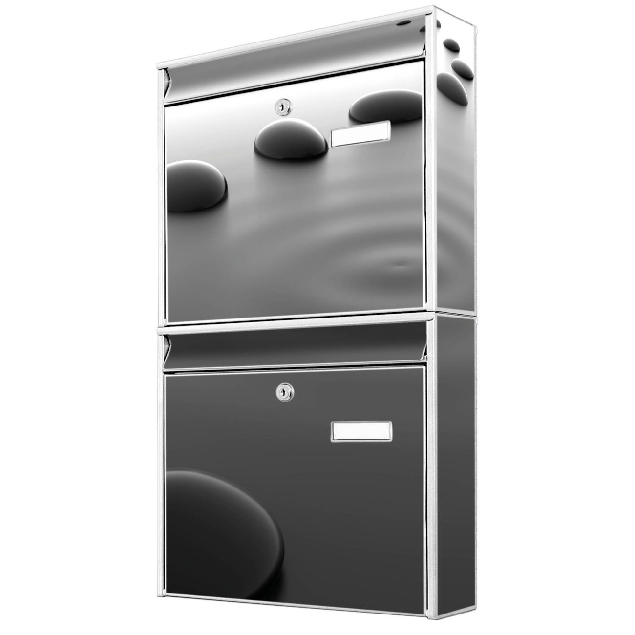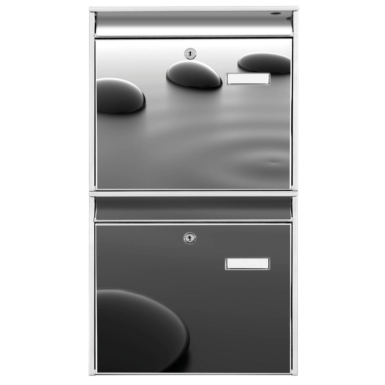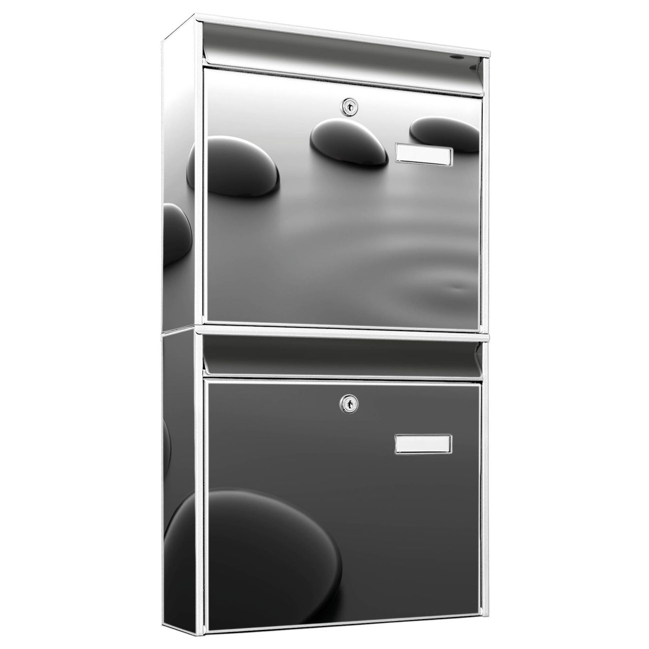 FUNKTION: Die Burg-Wächter Briefkastenanlage mit Motiv Schwarze Steine bietet Ihnen ausreichend Fassungsvermögen um auch A4 und C4 Sendungen zu empfangen. Das integrierte Namensschild lässt sich individuell beschriften. Wählen Sie aus den Grundfarben weiß, silber und schwarz. DESIGN: Die 2 Briefkästen haben ein ansprechendes und zeitloses Design, ohne dabei auf Funktionalität zu verzichten. Das Material ist sehr stabil, wetterfest und rostfrei. Durch das Motiv Schwarze Steine werden die Postkästen zu einem Blickfang. DETAILS: Die Postkästen bestehen aus verzinktem Stahl der zusätzlich mit Klarlack versiegelt wurde. Die Kästen sind gesamt 64,5cm hoch, 36,2cm breit und 10cm tief. Das Motiv besteht aus einer wetter- und UV-festen Folie, die Ihren Briefkasten zusätzlich vor Kratzern schützt. Die Postkästen werden mit Montagematerial, je einem Namensschild und je zwei Schlüsseln geliefert. NUTZEN: Das Briefkastenset eignet sich für die Wandmontage, die Größe bietet genügend Platz für Sendungen aller Art. Das zeitlose Design sowie die stabile Bauart bieten Ihnen einen treuen Begleiter für Ihre Post. BANJADO: