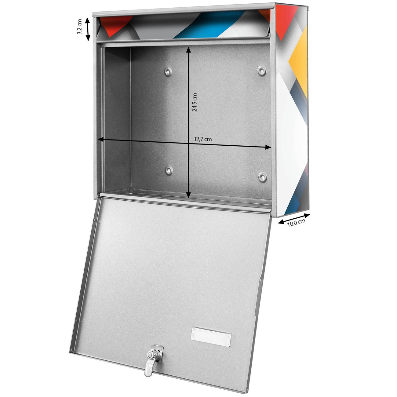 FUNKTION: Die Burg-Wächter Briefkastenanlage mit Motiv Schwebende Quadrate bietet Ihnen ausreichend Fassungsvermögen um auch A4 und C4 Sendungen zu empfangen. Das integrierte Namensschild lässt sich individuell beschriften. Wählen Sie aus den Grundfarben weiß, silber und schwarz. DESIGN: Die 2 Briefkästen haben ein ansprechendes und zeitloses Design, ohne dabei auf Funktionalität zu verzichten. Das Material ist sehr stabil, wetterfest und rostfrei. Durch das Motiv Schwebende Quadrate werden die Postkästen zu einem Blickfang. DETAILS: Die Postkästen bestehen aus verzinktem Stahl der zusätzlich mit Klarlack versiegelt wurde. Die Kästen sind gesamt 64,5cm hoch, 36,2cm breit und 10cm tief. Das Motiv besteht aus einer wetter- und UV-festen Folie, die Ihren Briefkasten zusätzlich vor Kratzern schützt. Die Postkästen werden mit Montagematerial, je einem Namensschild und je zwei Schlüsseln geliefert. NUTZEN: Das Briefkastenset eignet sich für die Wandmontage, die Größe bietet genügend Platz für Sendungen aller Art. Das zeitlose Design sowie die stabile Bauart bieten Ihnen einen treuen Begleiter für Ihre Post. BANJADO: