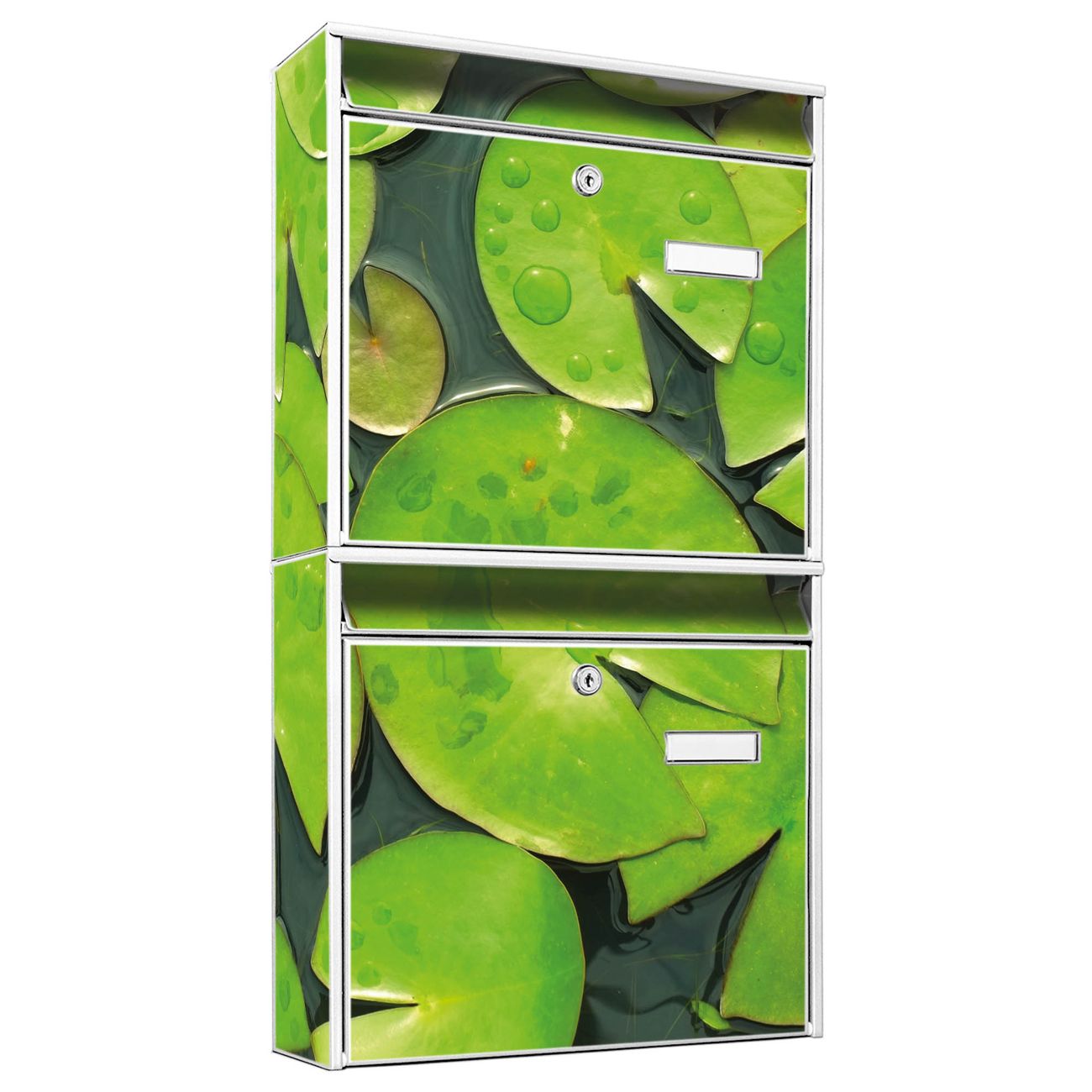 FUNKTION: Die Burg-Wächter Briefkastenanlage mit Motiv Seerosenblätter bietet Ihnen ausreichend Fassungsvermögen um auch A4 und C4 Sendungen zu empfangen. Das integrierte Namensschild lässt sich individuell beschriften. Wählen Sie aus den Grundfarben weiß, silber und schwarz. DESIGN: Die 2 Briefkästen haben ein ansprechendes und zeitloses Design, ohne dabei auf Funktionalität zu verzichten. Das Material ist sehr stabil, wetterfest und rostfrei. Durch das Motiv Seerosenblätter werden die Postkästen zu einem Blickfang. DETAILS: Die Postkästen bestehen aus verzinktem Stahl der zusätzlich mit Klarlack versiegelt wurde. Die Kästen sind gesamt 64,5cm hoch, 36,2cm breit und 10cm tief. Das Motiv besteht aus einer wetter- und UV-festen Folie, die Ihren Briefkasten zusätzlich vor Kratzern schützt. Die Postkästen werden mit Montagematerial, je einem Namensschild und je zwei Schlüsseln geliefert. NUTZEN: Das Briefkastenset eignet sich für die Wandmontage, die Größe bietet genügend Platz für Sendungen aller Art. Das zeitlose Design sowie die stabile Bauart bieten Ihnen einen treuen Begleiter für Ihre Post. BANJADO: