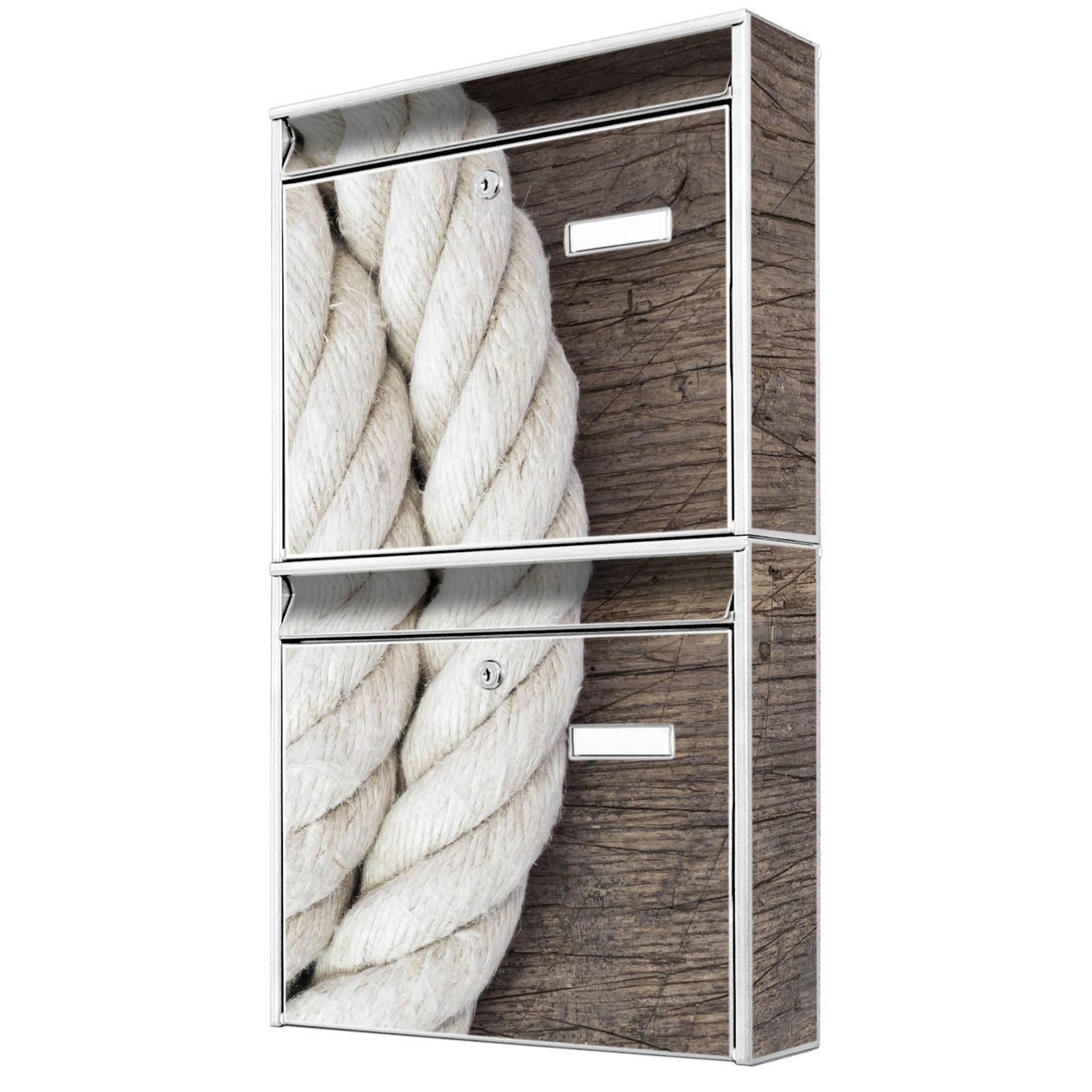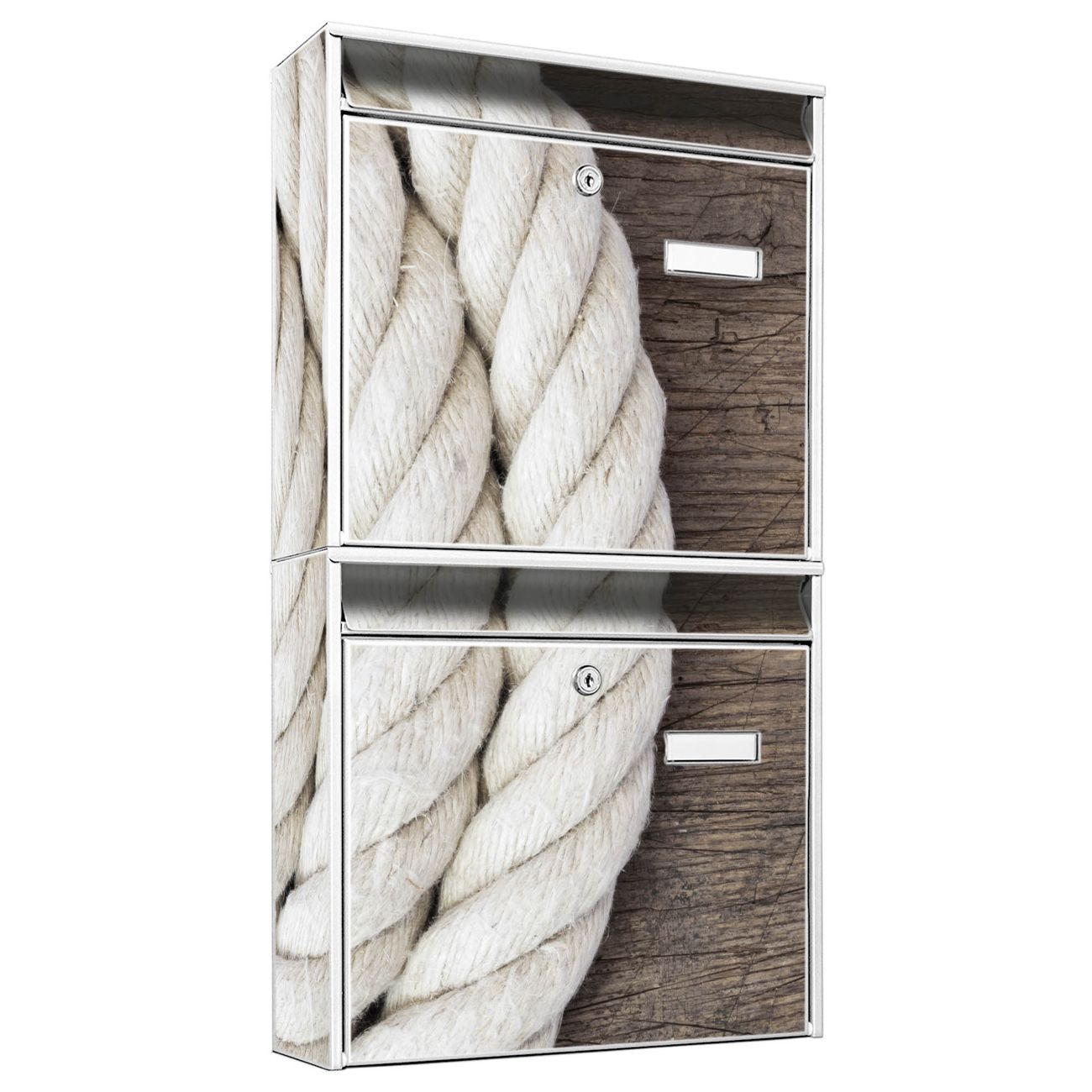 FUNKTION: Die Burg-Wächter Briefkastenanlage mit Motiv Seil bietet Ihnen ausreichend Fassungsvermögen um auch A4 und C4 Sendungen zu empfangen. Das integrierte Namensschild lässt sich individuell beschriften. Wählen Sie aus den Grundfarben weiß, silber und schwarz. DESIGN: Die 2 Briefkästen haben ein ansprechendes und zeitloses Design, ohne dabei auf Funktionalität zu verzichten. Das Material ist sehr stabil, wetterfest und rostfrei. Durch das Motiv Seil werden die Postkästen zu einem Blickfang. DETAILS: Die Postkästen bestehen aus verzinktem Stahl der zusätzlich mit Klarlack versiegelt wurde. Die Kästen sind gesamt 64,5cm hoch, 36,2cm breit und 10cm tief. Das Motiv besteht aus einer wetter- und UV-festen Folie, die Ihren Briefkasten zusätzlich vor Kratzern schützt. Die Postkästen werden mit Montagematerial, je einem Namensschild und je zwei Schlüsseln geliefert. NUTZEN: Das Briefkastenset eignet sich für die Wandmontage, die Größe bietet genügend Platz für Sendungen aller Art. Das zeitlose Design sowie die stabile Bauart bieten Ihnen einen treuen Begleiter für Ihre Post. BANJADO: