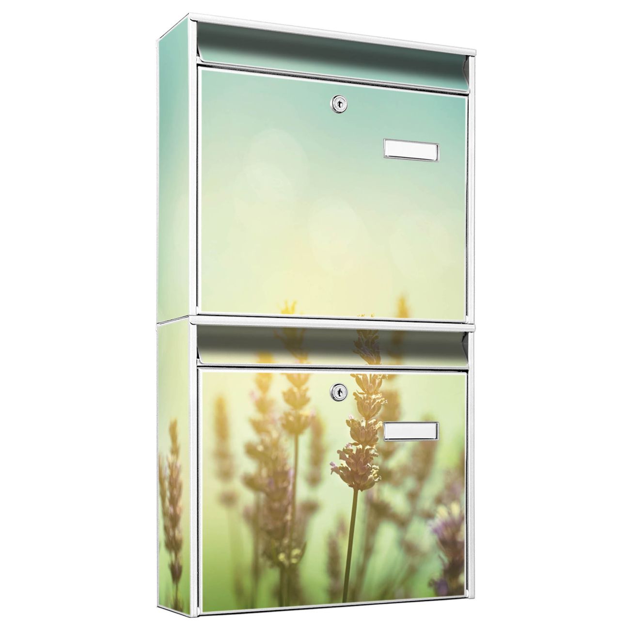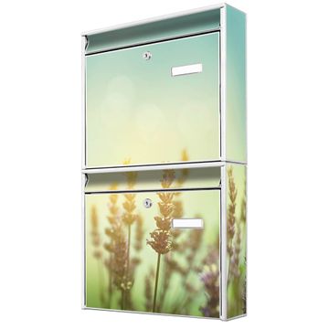 FUNKTION: Die Burg-Wächter Briefkastenanlage mit Motiv Sonnenlavendel bietet Ihnen ausreichend Fassungsvermögen um auch A4 und C4 Sendungen zu empfangen. Das integrierte Namensschild lässt sich individuell beschriften. Wählen Sie aus den Grundfarben weiß, silber und schwarz. DESIGN: Die 2 Briefkästen haben ein ansprechendes und zeitloses Design, ohne dabei auf Funktionalität zu verzichten. Das Material ist sehr stabil, wetterfest und rostfrei. Durch das Motiv Sonnenlavendel werden die Postkästen zu einem Blickfang. DETAILS: Die Postkästen bestehen aus verzinktem Stahl der zusätzlich mit Klarlack versiegelt wurde. Die Kästen sind gesamt 64,5cm hoch, 36,2cm breit und 10cm tief. Das Motiv besteht aus einer wetter- und UV-festen Folie, die Ihren Briefkasten zusätzlich vor Kratzern schützt. Die Postkästen werden mit Montagematerial, je einem Namensschild und je zwei Schlüsseln geliefert. NUTZEN: Das Briefkastenset eignet sich für die Wandmontage, die Größe bietet genügend Platz für Sendungen aller Art. Das zeitlose Design sowie die stabile Bauart bieten Ihnen einen treuen Begleiter für Ihre Post. BANJADO: