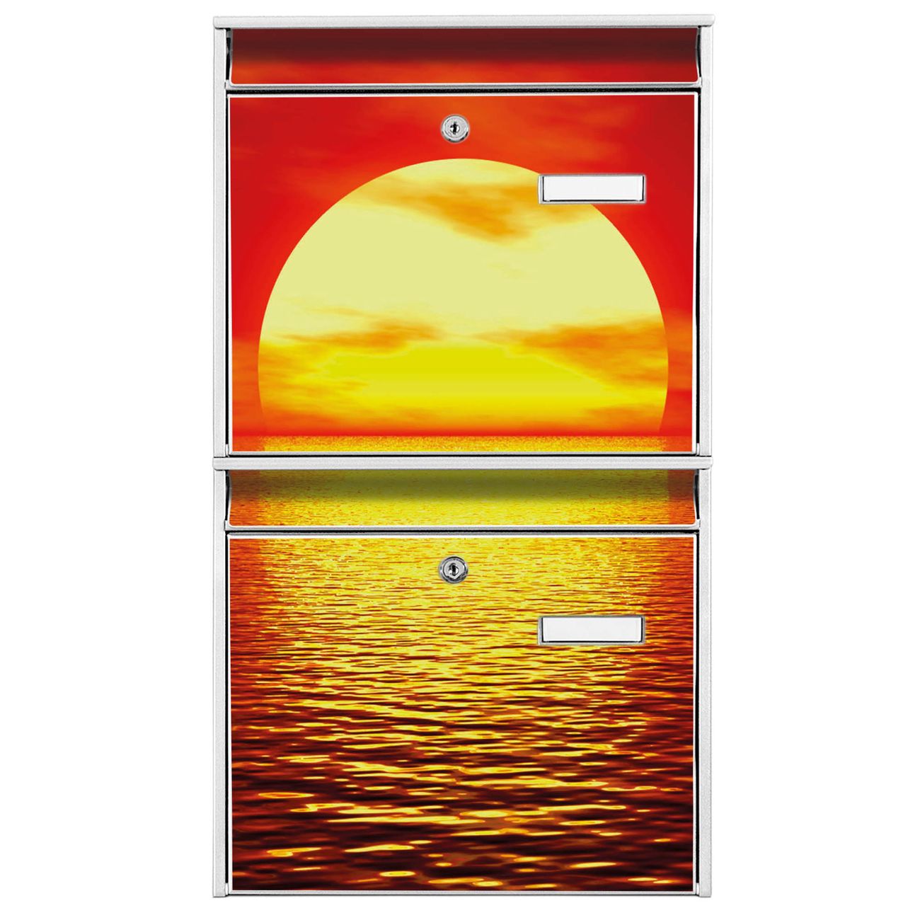 FUNKTION: Die Burg-Wächter Briefkastenanlage mit Motiv Sonnenuntergang bietet Ihnen ausreichend Fassungsvermögen um auch A4 und C4 Sendungen zu empfangen. Das integrierte Namensschild lässt sich individuell beschriften. Wählen Sie aus den Grundfarben weiß, silber und schwarz. DESIGN: Die 2 Briefkästen haben ein ansprechendes und zeitloses Design, ohne dabei auf Funktionalität zu verzichten. Das Material ist sehr stabil, wetterfest und rostfrei. Durch das Motiv Sonnenuntergang werden die Postkästen zu einem Blickfang. DETAILS: Die Postkästen bestehen aus verzinktem Stahl der zusätzlich mit Klarlack versiegelt wurde. Die Kästen sind gesamt 64,5cm hoch, 36,2cm breit und 10cm tief. Das Motiv besteht aus einer wetter- und UV-festen Folie, die Ihren Briefkasten zusätzlich vor Kratzern schützt. Die Postkästen werden mit Montagematerial, je einem Namensschild und je zwei Schlüsseln geliefert. NUTZEN: Das Briefkastenset eignet sich für die Wandmontage, die Größe bietet genügend Platz für Sendungen aller Art. Das zeitlose Design sowie die stabile Bauart bieten Ihnen einen treuen Begleiter für Ihre Post. BANJADO: