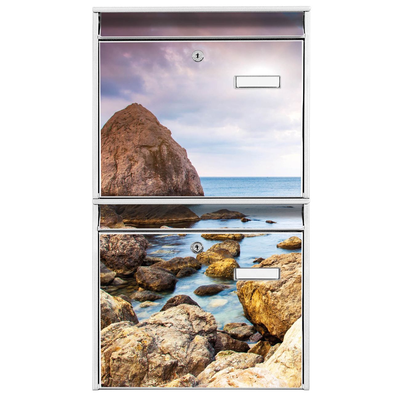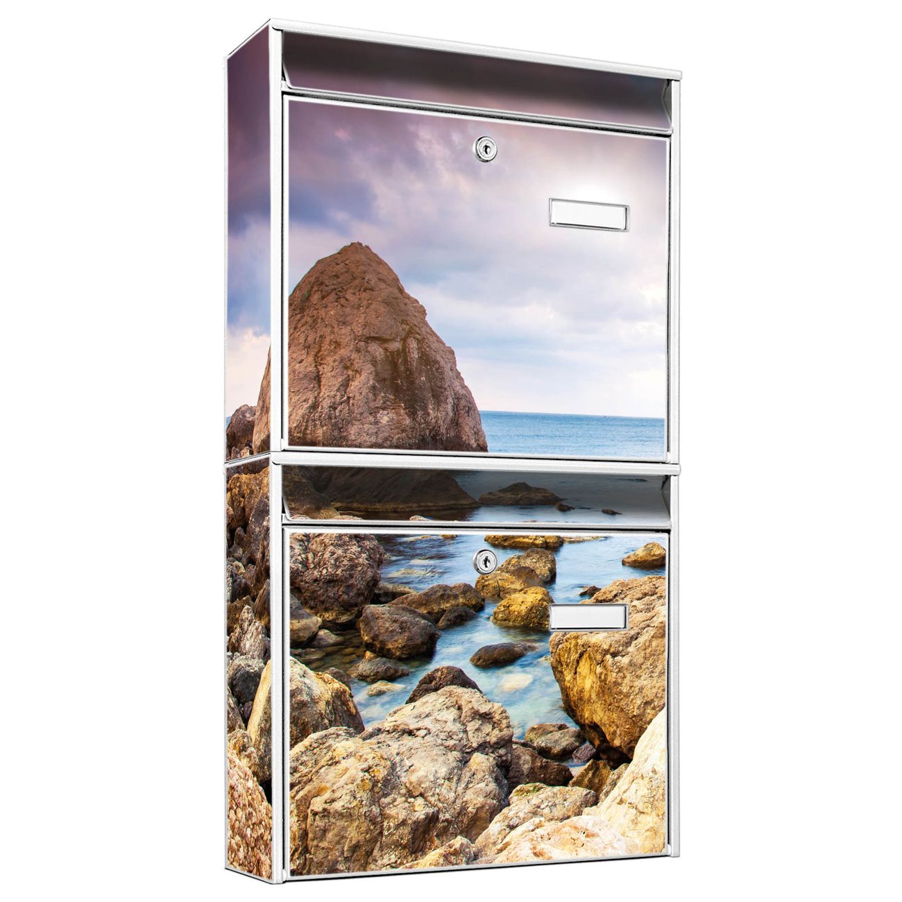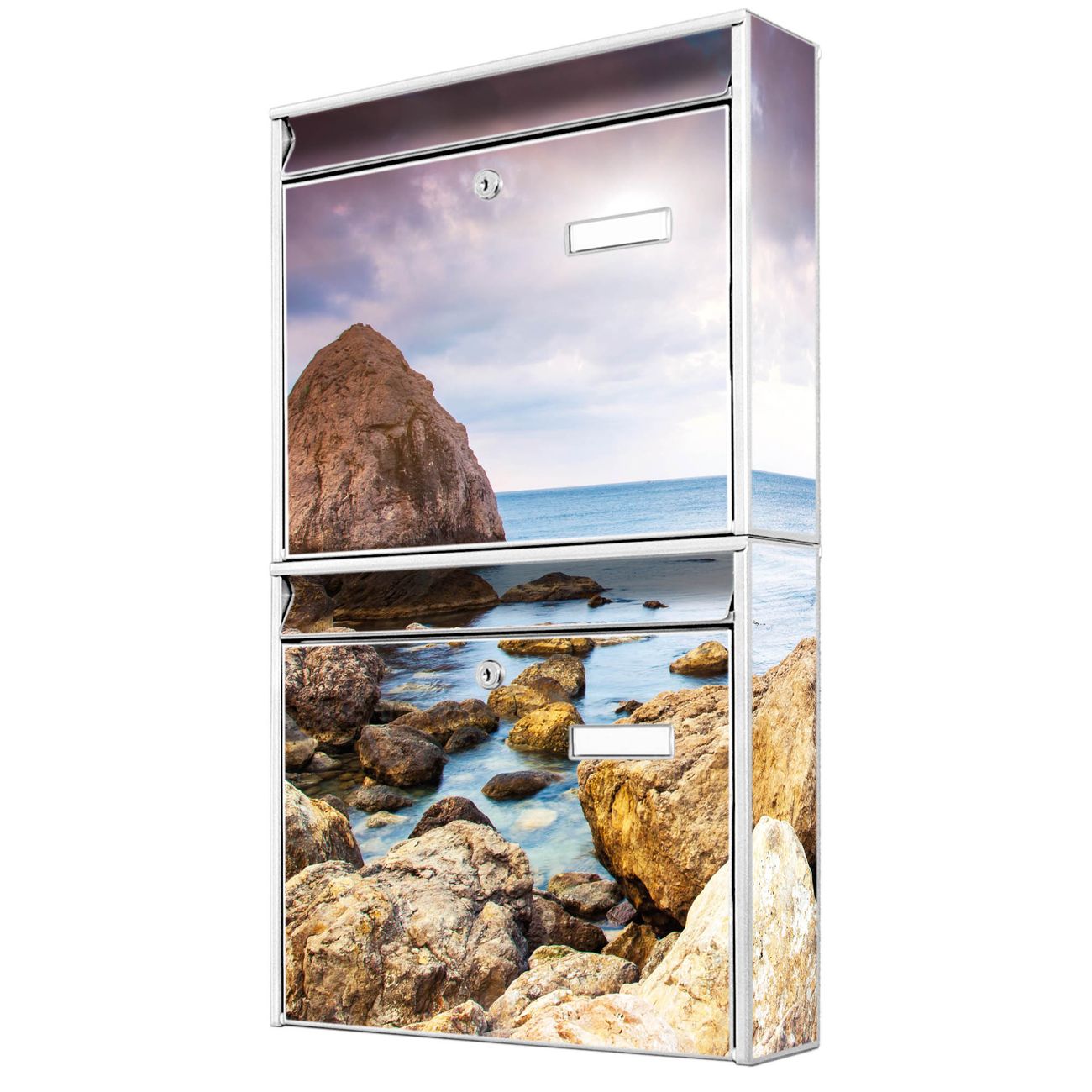 FUNKTION: Die Burg-Wächter Briefkastenanlage mit Motiv Steinbucht bietet Ihnen ausreichend Fassungsvermögen um auch A4 und C4 Sendungen zu empfangen. Das integrierte Namensschild lässt sich individuell beschriften. Wählen Sie aus den Grundfarben weiß, silber und schwarz. DESIGN: Die 2 Briefkästen haben ein ansprechendes und zeitloses Design, ohne dabei auf Funktionalität zu verzichten. Das Material ist sehr stabil, wetterfest und rostfrei. Durch das Motiv Steinbucht werden die Postkästen zu einem Blickfang. DETAILS: Die Postkästen bestehen aus verzinktem Stahl der zusätzlich mit Klarlack versiegelt wurde. Die Kästen sind gesamt 64,5cm hoch, 36,2cm breit und 10cm tief. Das Motiv besteht aus einer wetter- und UV-festen Folie, die Ihren Briefkasten zusätzlich vor Kratzern schützt. Die Postkästen werden mit Montagematerial, je einem Namensschild und je zwei Schlüsseln geliefert. NUTZEN: Das Briefkastenset eignet sich für die Wandmontage, die Größe bietet genügend Platz für Sendungen aller Art. Das zeitlose Design sowie die stabile Bauart bieten Ihnen einen treuen Begleiter für Ihre Post. BANJADO:
