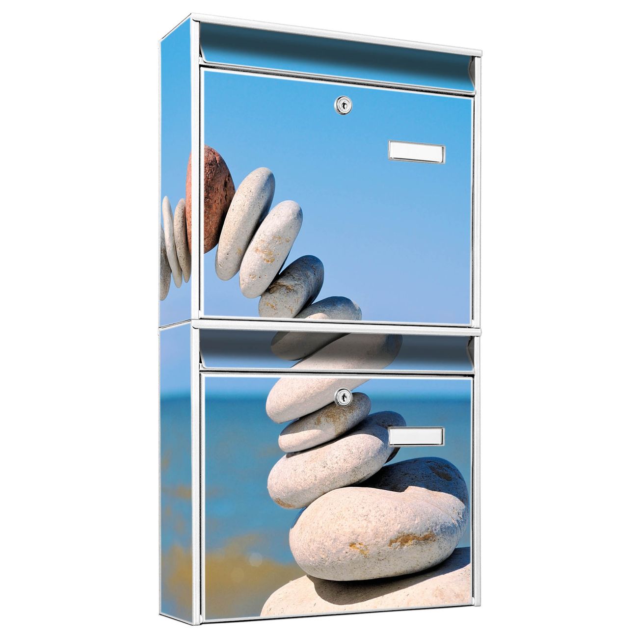 FUNKTION: Die Burg-Wächter Briefkastenanlage mit Motiv Steine&Meer bietet Ihnen ausreichend Fassungsvermögen um auch A4 und C4 Sendungen zu empfangen. Das integrierte Namensschild lässt sich individuell beschriften. Wählen Sie aus den Grundfarben weiß, silber und schwarz. DESIGN: Die 2 Briefkästen haben ein ansprechendes und zeitloses Design, ohne dabei auf Funktionalität zu verzichten. Das Material ist sehr stabil, wetterfest und rostfrei. Durch das Motiv Steine&Meer werden die Postkästen zu einem Blickfang. DETAILS: Die Postkästen bestehen aus verzinktem Stahl der zusätzlich mit Klarlack versiegelt wurde. Die Kästen sind gesamt 64,5cm hoch, 36,2cm breit und 10cm tief. Das Motiv besteht aus einer wetter- und UV-festen Folie, die Ihren Briefkasten zusätzlich vor Kratzern schützt. Die Postkästen werden mit Montagematerial, je einem Namensschild und je zwei Schlüsseln geliefert. NUTZEN: Das Briefkastenset eignet sich für die Wandmontage, die Größe bietet genügend Platz für Sendungen aller Art. Das zeitlose Design sowie die stabile Bauart bieten Ihnen einen treuen Begleiter für Ihre Post. BANJADO: