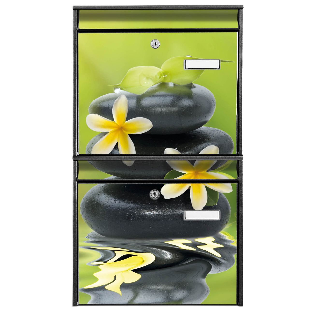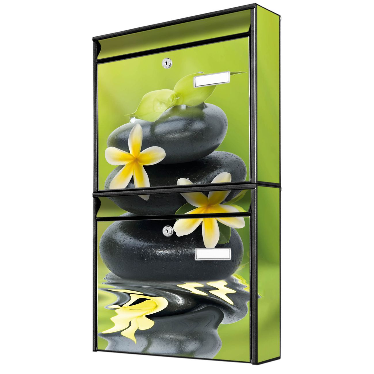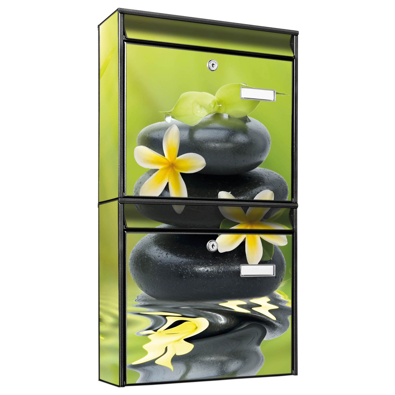 FUNKTION: Die Burg-Wächter Briefkastenanlage mit Motiv Steine & Relax 4 bietet Ihnen ausreichend Fassungsvermögen um auch A4 und C4 Sendungen zu empfangen. Das integrierte Namensschild lässt sich individuell beschriften. Wählen Sie aus den Grundfarben weiß, silber und schwarz. DESIGN: Die 2 Briefkästen haben ein ansprechendes und zeitloses Design, ohne dabei auf Funktionalität zu verzichten. Das Material ist sehr stabil, wetterfest und rostfrei. Durch das Motiv Steine & Relax 4 werden die Postkästen zu einem Blickfang. DETAILS: Die Postkästen bestehen aus verzinktem Stahl der zusätzlich mit Klarlack versiegelt wurde. Die Kästen sind gesamt 64,5cm hoch, 36,2cm breit und 10cm tief. Das Motiv besteht aus einer wetter- und UV-festen Folie, die Ihren Briefkasten zusätzlich vor Kratzern schützt. Die Postkästen werden mit Montagematerial, je einem Namensschild und je zwei Schlüsseln geliefert. NUTZEN: Das Briefkastenset eignet sich für die Wandmontage, die Größe bietet genügend Platz für Sendungen aller Art. Das zeitlose Design sowie die stabile Bauart bieten Ihnen einen treuen Begleiter für Ihre Post. BANJADO: