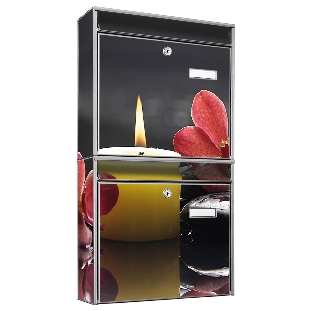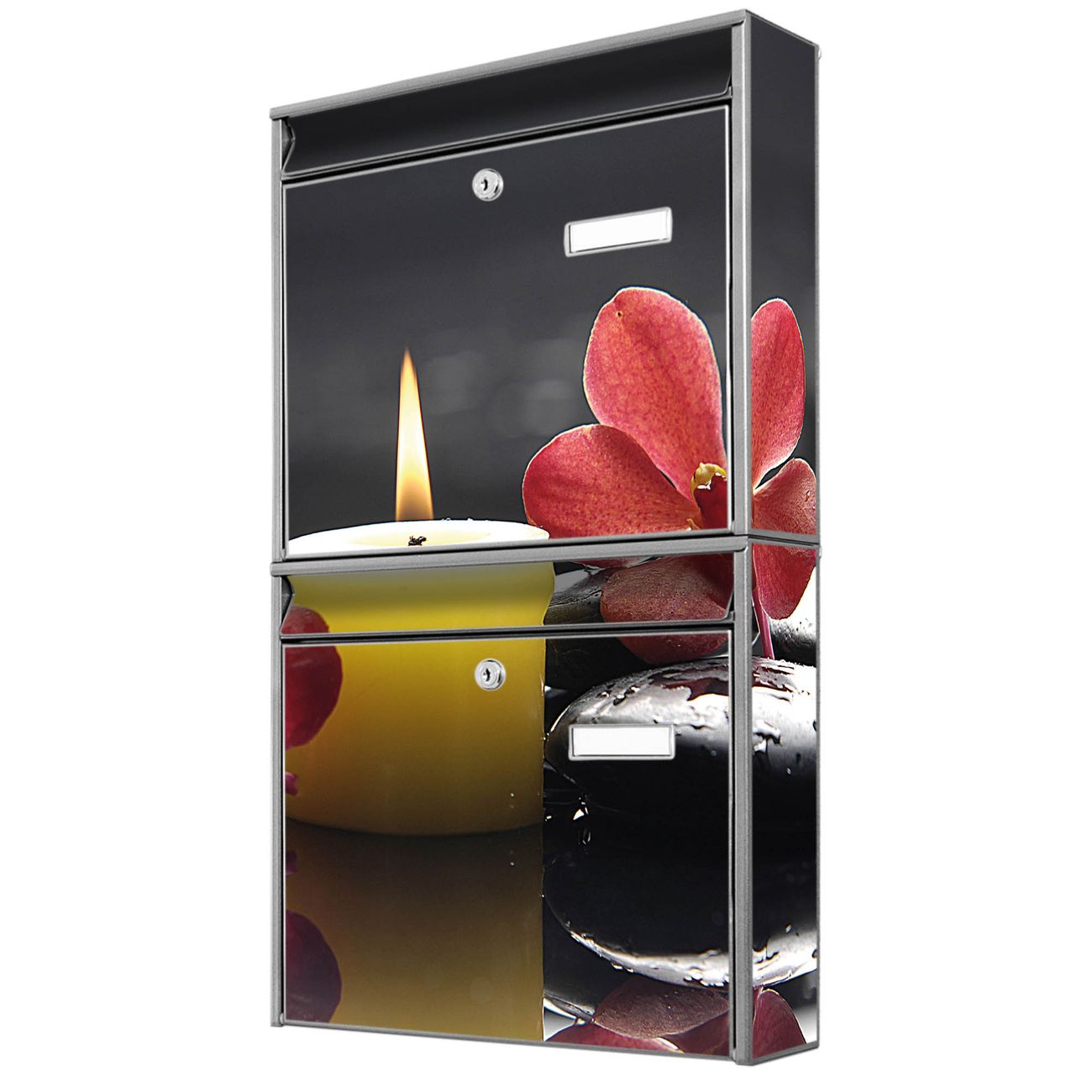 FUNKTION: Die Burg-Wächter Briefkastenanlage mit Motiv Steine & Relax 5 bietet Ihnen ausreichend Fassungsvermögen um auch A4 und C4 Sendungen zu empfangen. Das integrierte Namensschild lässt sich individuell beschriften. Wählen Sie aus den Grundfarben weiß, silber und schwarz. DESIGN: Die 2 Briefkästen haben ein ansprechendes und zeitloses Design, ohne dabei auf Funktionalität zu verzichten. Das Material ist sehr stabil, wetterfest und rostfrei. Durch das Motiv Steine & Relax 5 werden die Postkästen zu einem Blickfang. DETAILS: Die Postkästen bestehen aus verzinktem Stahl der zusätzlich mit Klarlack versiegelt wurde. Die Kästen sind gesamt 64,5cm hoch, 36,2cm breit und 10cm tief. Das Motiv besteht aus einer wetter- und UV-festen Folie, die Ihren Briefkasten zusätzlich vor Kratzern schützt. Die Postkästen werden mit Montagematerial, je einem Namensschild und je zwei Schlüsseln geliefert. NUTZEN: Das Briefkastenset eignet sich für die Wandmontage, die Größe bietet genügend Platz für Sendungen aller Art. Das zeitlose Design sowie die stabile Bauart bieten Ihnen einen treuen Begleiter für Ihre Post. BANJADO:
