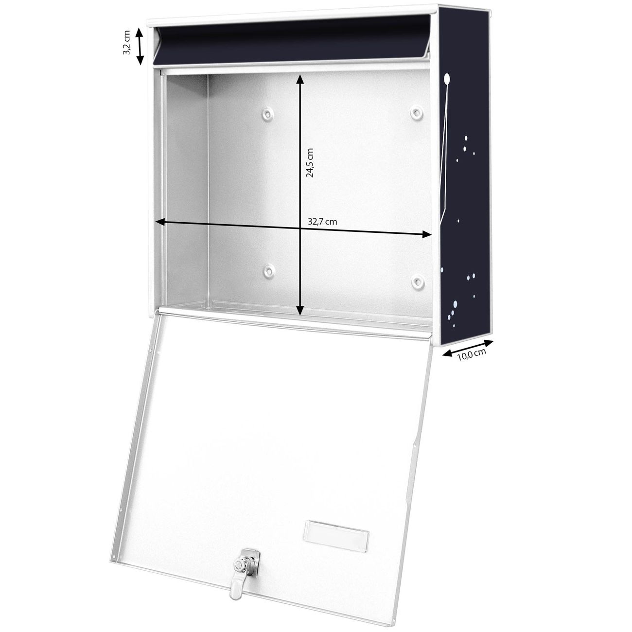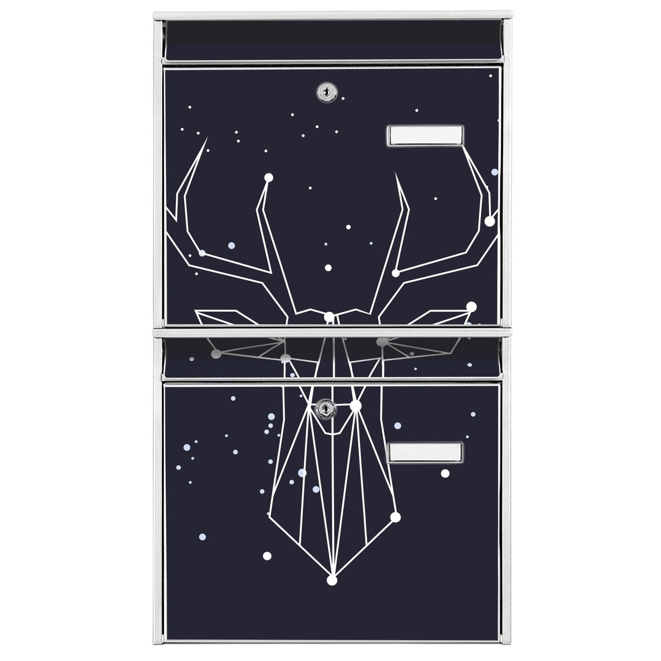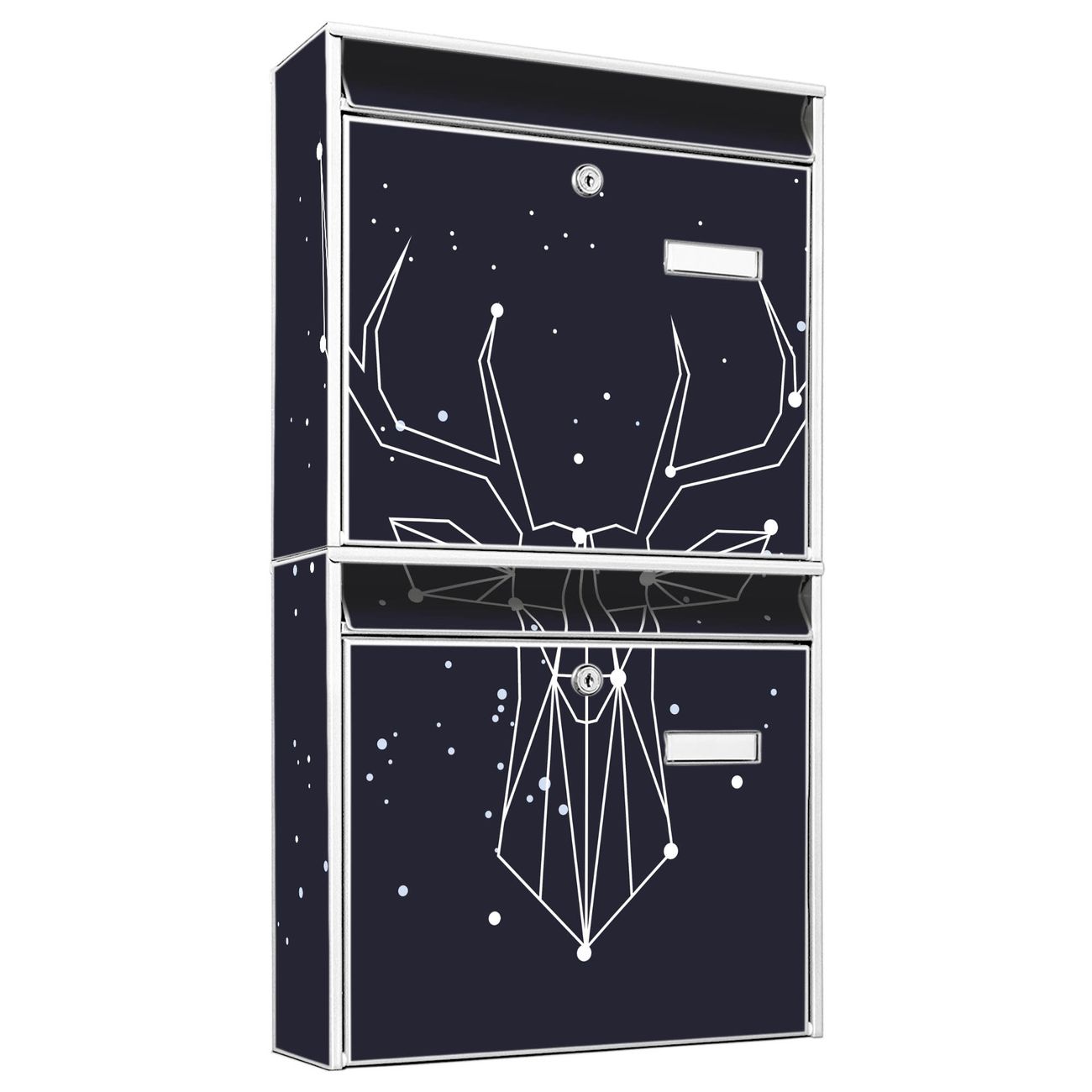 FUNKTION: Die Burg-Wächter Briefkastenanlage mit Motiv Sternbild Hirsch bietet Ihnen ausreichend Fassungsvermögen um auch A4 und C4 Sendungen zu empfangen. Das integrierte Namensschild lässt sich individuell beschriften. Wählen Sie aus den Grundfarben weiß, silber und schwarz. DESIGN: Die 2 Briefkästen haben ein ansprechendes und zeitloses Design, ohne dabei auf Funktionalität zu verzichten. Das Material ist sehr stabil, wetterfest und rostfrei. Durch das Motiv Sternbild Hirsch werden die Postkästen zu einem Blickfang. DETAILS: Die Postkästen bestehen aus verzinktem Stahl der zusätzlich mit Klarlack versiegelt wurde. Die Kästen sind gesamt 64,5cm hoch, 36,2cm breit und 10cm tief. Das Motiv besteht aus einer wetter- und UV-festen Folie, die Ihren Briefkasten zusätzlich vor Kratzern schützt. Die Postkästen werden mit Montagematerial, je einem Namensschild und je zwei Schlüsseln geliefert. NUTZEN: Das Briefkastenset eignet sich für die Wandmontage, die Größe bietet genügend Platz für Sendungen aller Art. Das zeitlose Design sowie die stabile Bauart bieten Ihnen einen treuen Begleiter für Ihre Post. BANJADO: