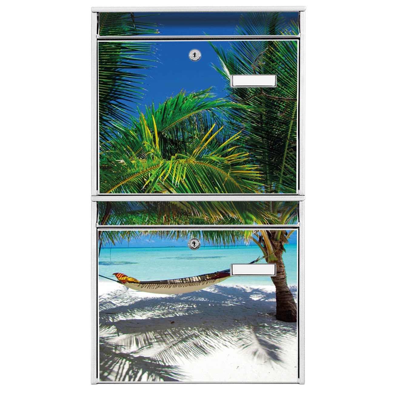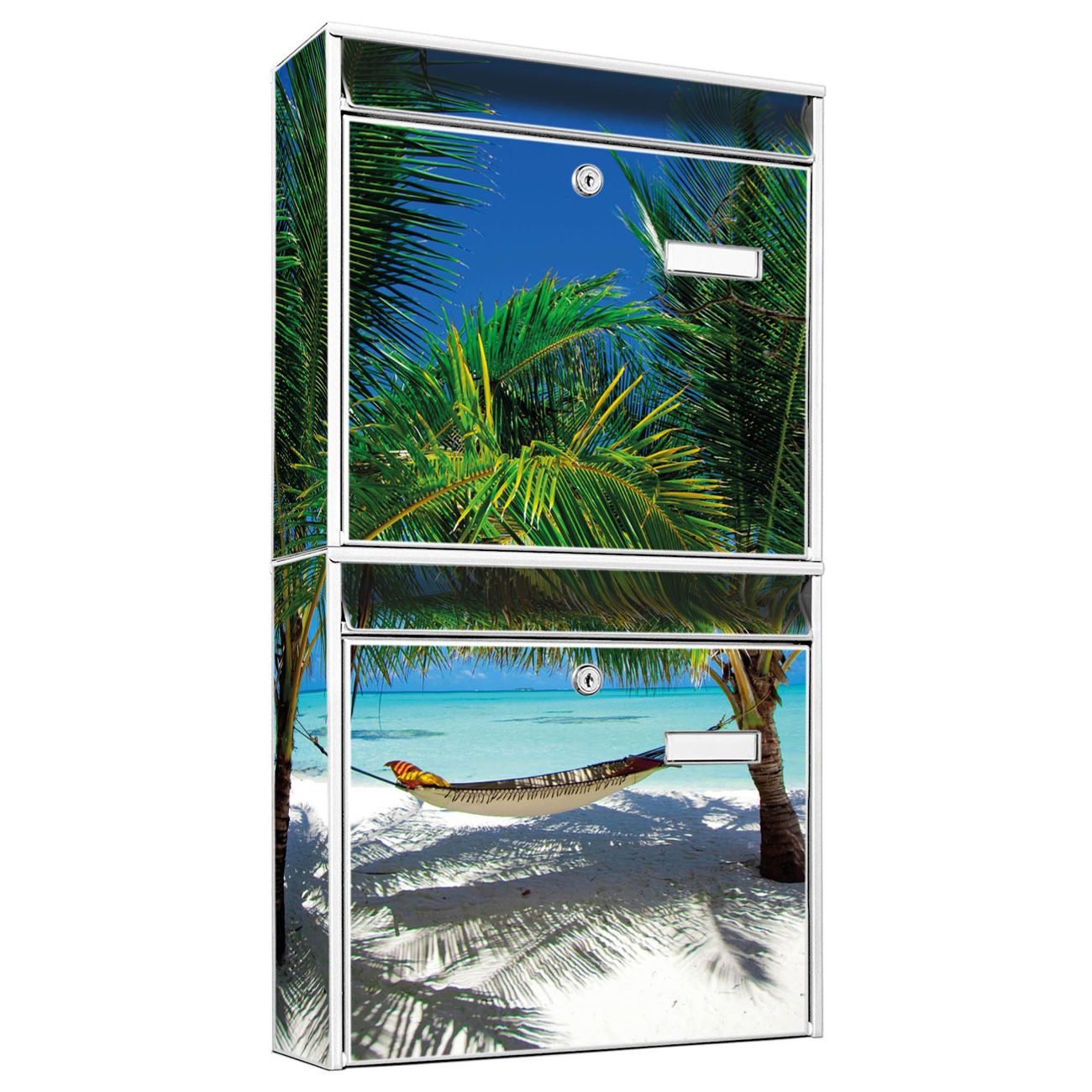 FUNKTION: Die Burg-Wächter Briefkastenanlage mit Motiv Strand bietet Ihnen ausreichend Fassungsvermögen um auch A4 und C4 Sendungen zu empfangen. Das integrierte Namensschild lässt sich individuell beschriften. Wählen Sie aus den Grundfarben weiß, silber und schwarz. DESIGN: Die 2 Briefkästen haben ein ansprechendes und zeitloses Design, ohne dabei auf Funktionalität zu verzichten. Das Material ist sehr stabil, wetterfest und rostfrei. Durch das Motiv Strand werden die Postkästen zu einem Blickfang. DETAILS: Die Postkästen bestehen aus verzinktem Stahl der zusätzlich mit Klarlack versiegelt wurde. Die Kästen sind gesamt 64,5cm hoch, 36,2cm breit und 10cm tief. Das Motiv besteht aus einer wetter- und UV-festen Folie, die Ihren Briefkasten zusätzlich vor Kratzern schützt. Die Postkästen werden mit Montagematerial, je einem Namensschild und je zwei Schlüsseln geliefert. NUTZEN: Das Briefkastenset eignet sich für die Wandmontage, die Größe bietet genügend Platz für Sendungen aller Art. Das zeitlose Design sowie die stabile Bauart bieten Ihnen einen treuen Begleiter für Ihre Post. BANJADO: