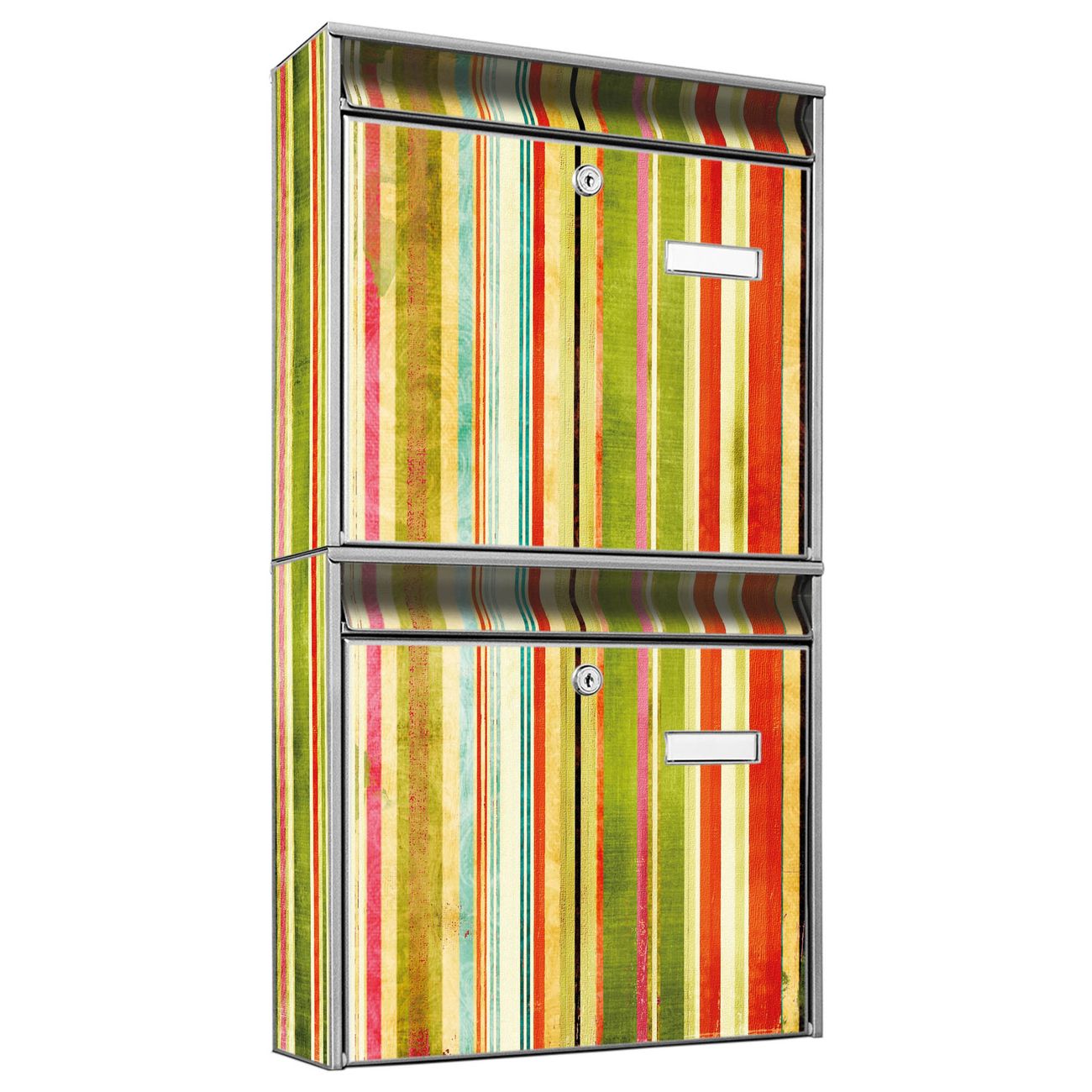 FUNKTION: Die Burg-Wächter Briefkastenanlage mit Motiv Streifen bietet Ihnen ausreichend Fassungsvermögen um auch A4 und C4 Sendungen zu empfangen. Das integrierte Namensschild lässt sich individuell beschriften. Wählen Sie aus den Grundfarben weiß, silber und schwarz. DESIGN: Die 2 Briefkästen haben ein ansprechendes und zeitloses Design, ohne dabei auf Funktionalität zu verzichten. Das Material ist sehr stabil, wetterfest und rostfrei. Durch das Motiv Streifen werden die Postkästen zu einem Blickfang. DETAILS: Die Postkästen bestehen aus verzinktem Stahl der zusätzlich mit Klarlack versiegelt wurde. Die Kästen sind gesamt 64,5cm hoch, 36,2cm breit und 10cm tief. Das Motiv besteht aus einer wetter- und UV-festen Folie, die Ihren Briefkasten zusätzlich vor Kratzern schützt. Die Postkästen werden mit Montagematerial, je einem Namensschild und je zwei Schlüsseln geliefert. NUTZEN: Das Briefkastenset eignet sich für die Wandmontage, die Größe bietet genügend Platz für Sendungen aller Art. Das zeitlose Design sowie die stabile Bauart bieten Ihnen einen treuen Begleiter für Ihre Post. BANJADO:
