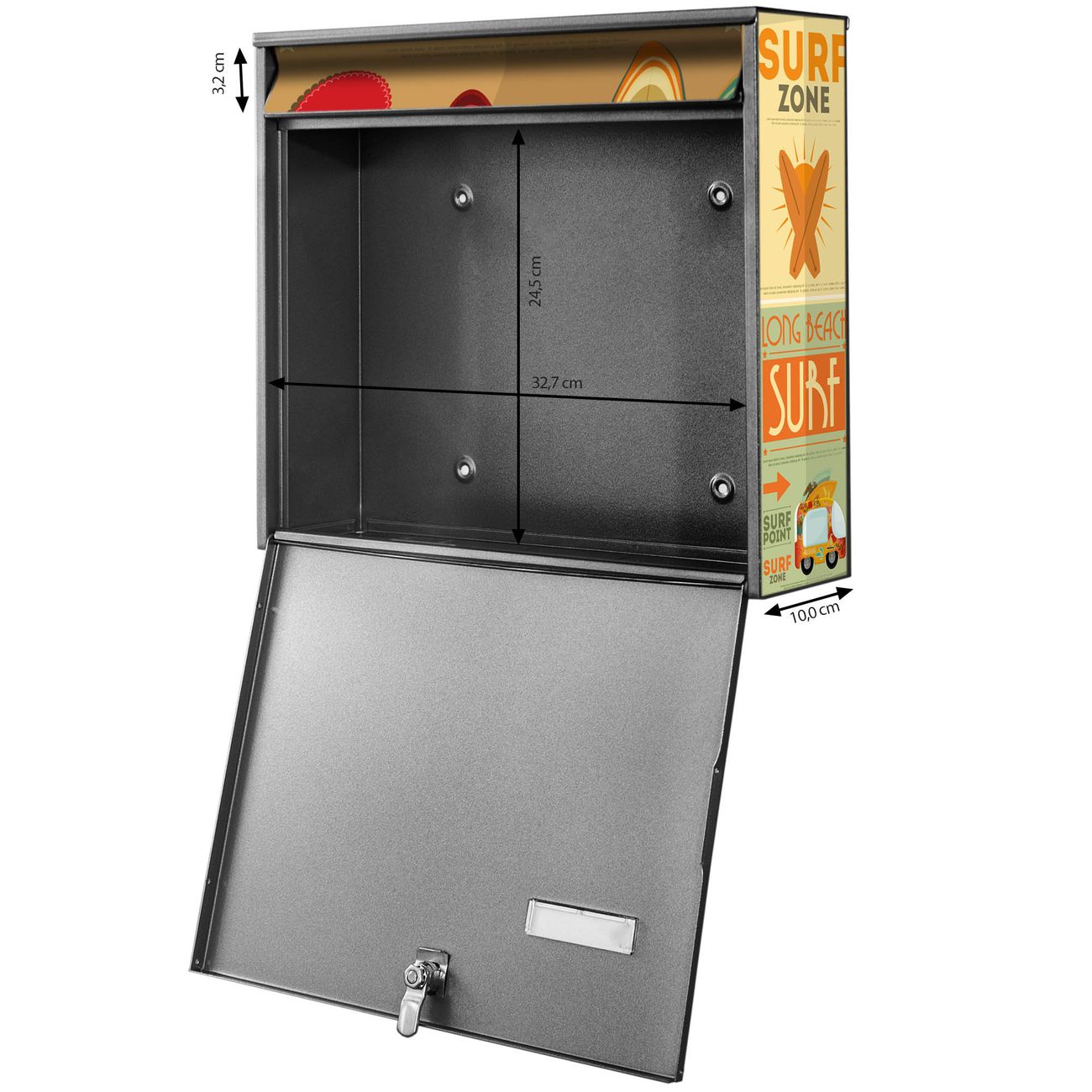 FUNKTION: Die Burg-Wächter Briefkastenanlage mit Motiv Surf Point bietet Ihnen ausreichend Fassungsvermögen um auch A4 und C4 Sendungen zu empfangen. Das integrierte Namensschild lässt sich individuell beschriften. Wählen Sie aus den Grundfarben weiß, silber und schwarz. DESIGN: Die 2 Briefkästen haben ein ansprechendes und zeitloses Design, ohne dabei auf Funktionalität zu verzichten. Das Material ist sehr stabil, wetterfest und rostfrei. Durch das Motiv Surf Point werden die Postkästen zu einem Blickfang. DETAILS: Die Postkästen bestehen aus verzinktem Stahl der zusätzlich mit Klarlack versiegelt wurde. Die Kästen sind gesamt 64,5cm hoch, 36,2cm breit und 10cm tief. Das Motiv besteht aus einer wetter- und UV-festen Folie, die Ihren Briefkasten zusätzlich vor Kratzern schützt. Die Postkästen werden mit Montagematerial, je einem Namensschild und je zwei Schlüsseln geliefert. NUTZEN: Das Briefkastenset eignet sich für die Wandmontage, die Größe bietet genügend Platz für Sendungen aller Art. Das zeitlose Design sowie die stabile Bauart bieten Ihnen einen treuen Begleiter für Ihre Post. BANJADO:
