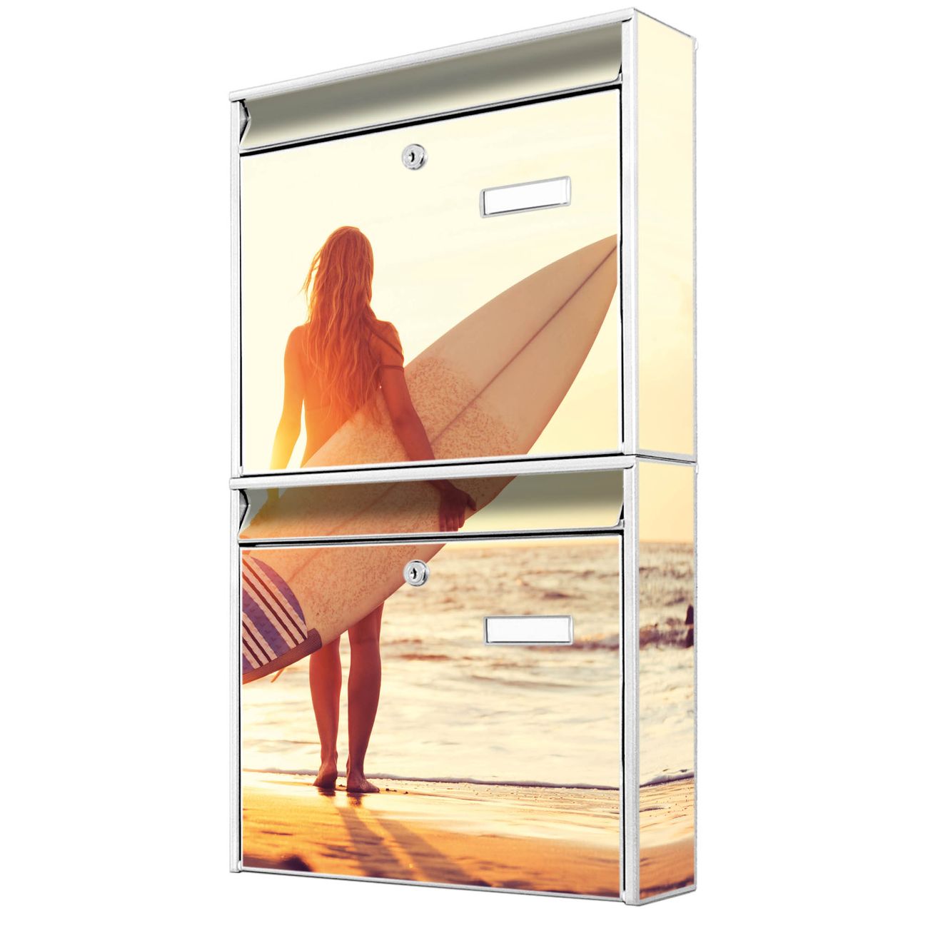 FUNKTION: Die Burg-Wächter Briefkastenanlage mit Motiv Surfer Girl bietet Ihnen ausreichend Fassungsvermögen um auch A4 und C4 Sendungen zu empfangen. Das integrierte Namensschild lässt sich individuell beschriften. Wählen Sie aus den Grundfarben weiß, silber und schwarz. DESIGN: Die 2 Briefkästen haben ein ansprechendes und zeitloses Design, ohne dabei auf Funktionalität zu verzichten. Das Material ist sehr stabil, wetterfest und rostfrei. Durch das Motiv Surfer Girl werden die Postkästen zu einem Blickfang. DETAILS: Die Postkästen bestehen aus verzinktem Stahl der zusätzlich mit Klarlack versiegelt wurde. Die Kästen sind gesamt 64,5cm hoch, 36,2cm breit und 10cm tief. Das Motiv besteht aus einer wetter- und UV-festen Folie, die Ihren Briefkasten zusätzlich vor Kratzern schützt. Die Postkästen werden mit Montagematerial, je einem Namensschild und je zwei Schlüsseln geliefert. NUTZEN: Das Briefkastenset eignet sich für die Wandmontage, die Größe bietet genügend Platz für Sendungen aller Art. Das zeitlose Design sowie die stabile Bauart bieten Ihnen einen treuen Begleiter für Ihre Post. BANJADO: