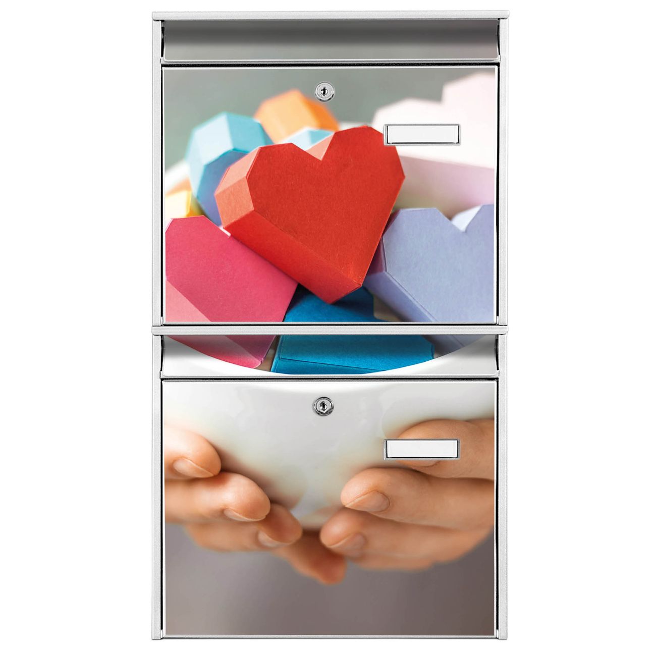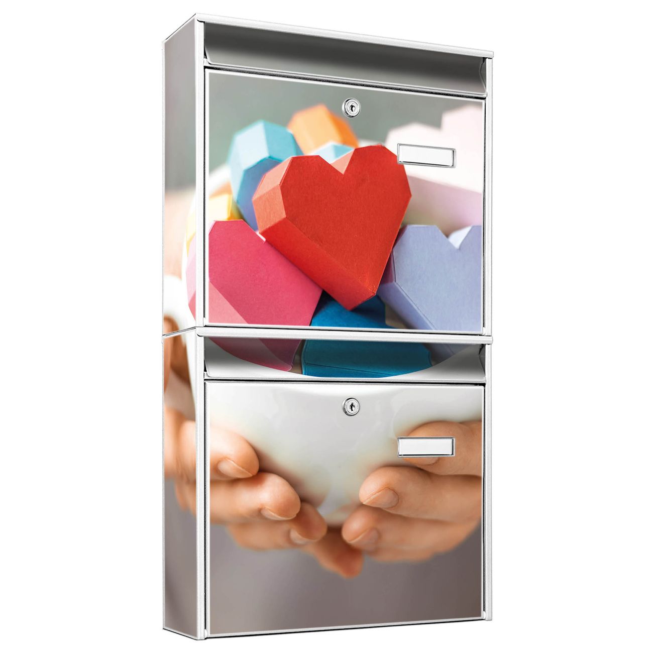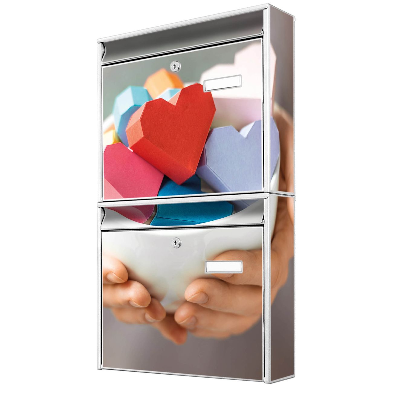 FUNKTION: Die Burg-Wächter Briefkastenanlage mit Motiv Tasse voller Herzen bietet Ihnen ausreichend Fassungsvermögen um auch A4 und C4 Sendungen zu empfangen. Das integrierte Namensschild lässt sich individuell beschriften. Wählen Sie aus den Grundfarben weiß, silber und schwarz. DESIGN: Die 2 Briefkästen haben ein ansprechendes und zeitloses Design, ohne dabei auf Funktionalität zu verzichten. Das Material ist sehr stabil, wetterfest und rostfrei. Durch das Motiv Tasse voller Herzen werden die Postkästen zu einem Blickfang. DETAILS: Die Postkästen bestehen aus verzinktem Stahl der zusätzlich mit Klarlack versiegelt wurde. Die Kästen sind gesamt 64,5cm hoch, 36,2cm breit und 10cm tief. Das Motiv besteht aus einer wetter- und UV-festen Folie, die Ihren Briefkasten zusätzlich vor Kratzern schützt. Die Postkästen werden mit Montagematerial, je einem Namensschild und je zwei Schlüsseln geliefert. NUTZEN: Das Briefkastenset eignet sich für die Wandmontage, die Größe bietet genügend Platz für Sendungen aller Art. Das zeitlose Design sowie die stabile Bauart bieten Ihnen einen treuen Begleiter für Ihre Post. BANJADO: