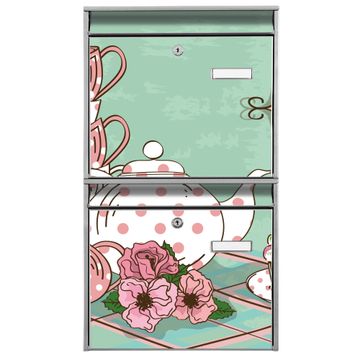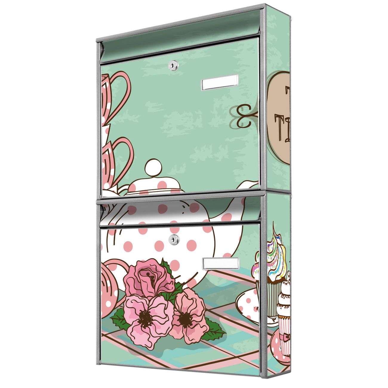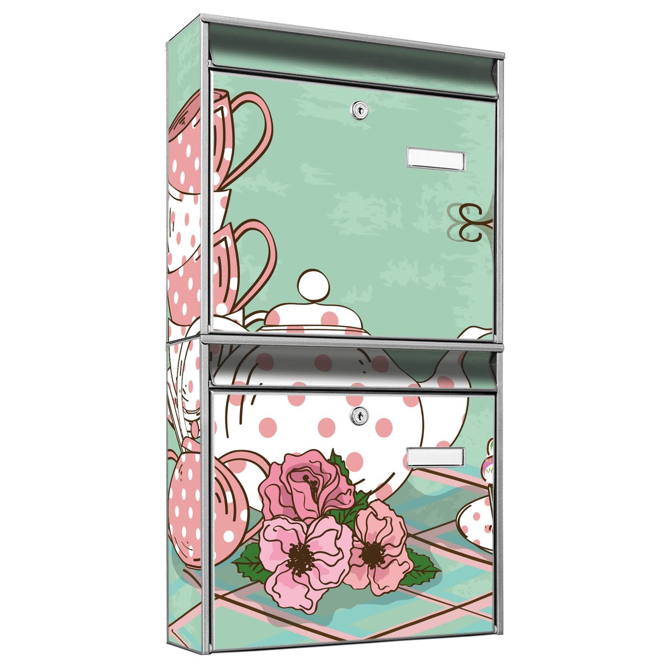 FUNKTION: Die Burg-Wächter Briefkastenanlage mit Motiv Tea Time bietet Ihnen ausreichend Fassungsvermögen um auch A4 und C4 Sendungen zu empfangen. Das integrierte Namensschild lässt sich individuell beschriften. Wählen Sie aus den Grundfarben weiß, silber und schwarz. DESIGN: Die 2 Briefkästen haben ein ansprechendes und zeitloses Design, ohne dabei auf Funktionalität zu verzichten. Das Material ist sehr stabil, wetterfest und rostfrei. Durch das Motiv Tea Time werden die Postkästen zu einem Blickfang. DETAILS: Die Postkästen bestehen aus verzinktem Stahl der zusätzlich mit Klarlack versiegelt wurde. Die Kästen sind gesamt 64,5cm hoch, 36,2cm breit und 10cm tief. Das Motiv besteht aus einer wetter- und UV-festen Folie, die Ihren Briefkasten zusätzlich vor Kratzern schützt. Die Postkästen werden mit Montagematerial, je einem Namensschild und je zwei Schlüsseln geliefert. NUTZEN: Das Briefkastenset eignet sich für die Wandmontage, die Größe bietet genügend Platz für Sendungen aller Art. Das zeitlose Design sowie die stabile Bauart bieten Ihnen einen treuen Begleiter für Ihre Post. BANJADO: