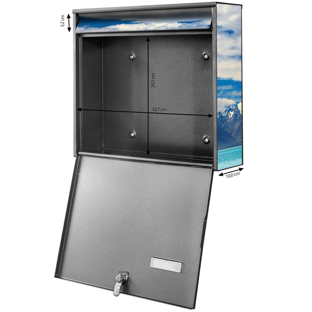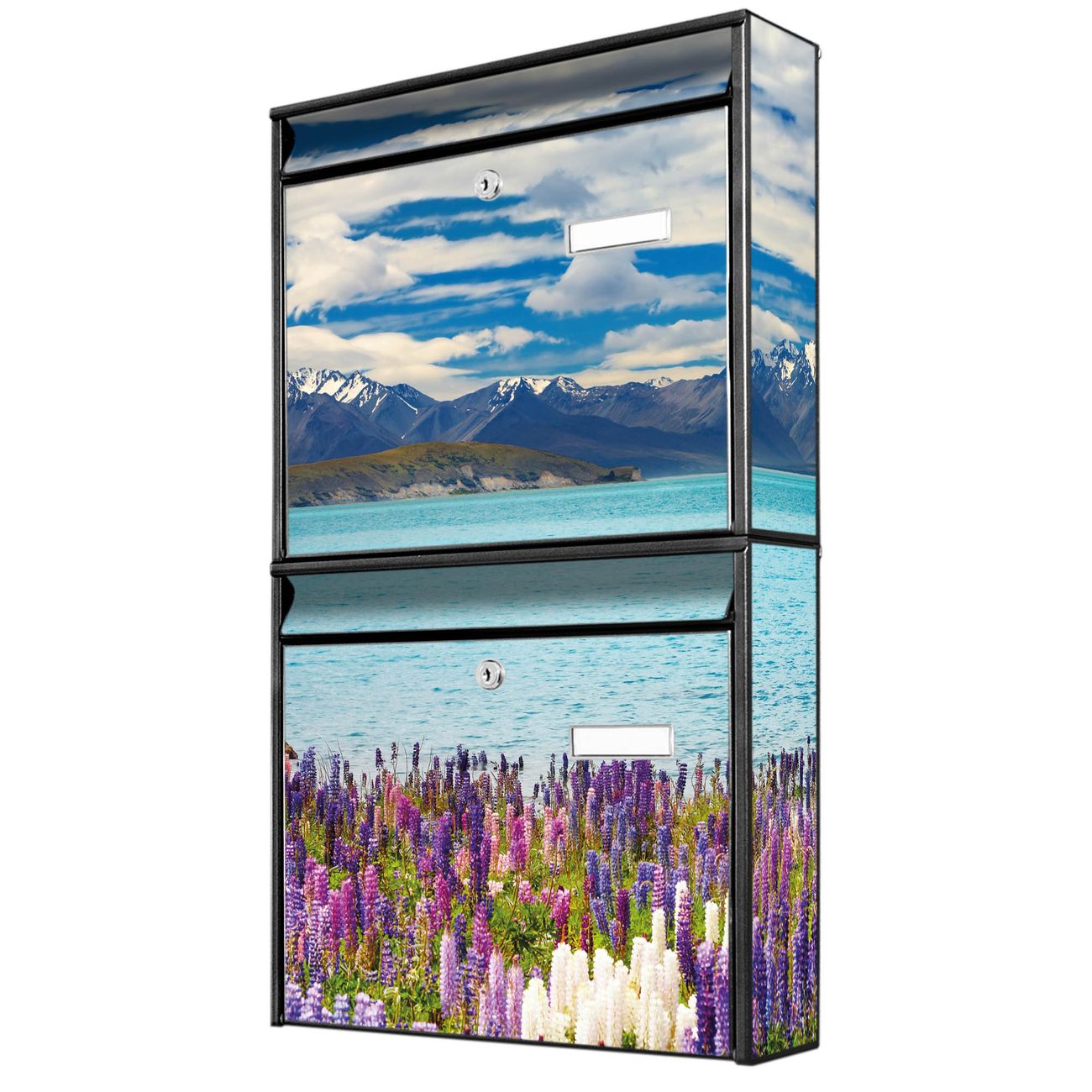 FUNKTION: Die Burg-Wächter Briefkastenanlage mit Motiv Tekapo See bietet Ihnen ausreichend Fassungsvermögen um auch A4 und C4 Sendungen zu empfangen. Das integrierte Namensschild lässt sich individuell beschriften. Wählen Sie aus den Grundfarben weiß, silber und schwarz. DESIGN: Die 2 Briefkästen haben ein ansprechendes und zeitloses Design, ohne dabei auf Funktionalität zu verzichten. Das Material ist sehr stabil, wetterfest und rostfrei. Durch das Motiv Tekapo See werden die Postkästen zu einem Blickfang. DETAILS: Die Postkästen bestehen aus verzinktem Stahl der zusätzlich mit Klarlack versiegelt wurde. Die Kästen sind gesamt 64,5cm hoch, 36,2cm breit und 10cm tief. Das Motiv besteht aus einer wetter- und UV-festen Folie, die Ihren Briefkasten zusätzlich vor Kratzern schützt. Die Postkästen werden mit Montagematerial, je einem Namensschild und je zwei Schlüsseln geliefert. NUTZEN: Das Briefkastenset eignet sich für die Wandmontage, die Größe bietet genügend Platz für Sendungen aller Art. Das zeitlose Design sowie die stabile Bauart bieten Ihnen einen treuen Begleiter für Ihre Post. BANJADO: