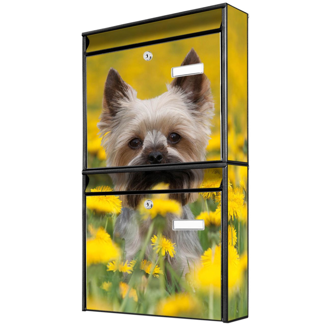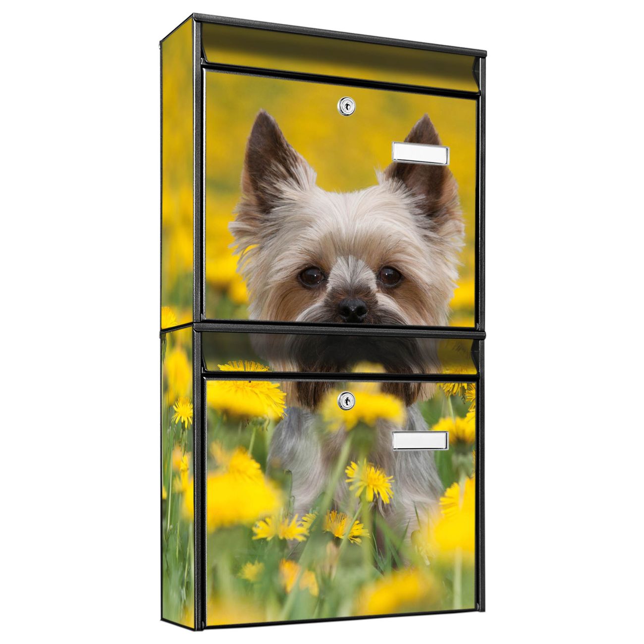 FUNKTION: Die Burg-Wächter Briefkastenanlage mit Motiv Tiffy bietet Ihnen ausreichend Fassungsvermögen um auch A4 und C4 Sendungen zu empfangen. Das integrierte Namensschild lässt sich individuell beschriften. Wählen Sie aus den Grundfarben weiß, silber und schwarz. DESIGN: Die 2 Briefkästen haben ein ansprechendes und zeitloses Design, ohne dabei auf Funktionalität zu verzichten. Das Material ist sehr stabil, wetterfest und rostfrei. Durch das Motiv Tiffy werden die Postkästen zu einem Blickfang. DETAILS: Die Postkästen bestehen aus verzinktem Stahl der zusätzlich mit Klarlack versiegelt wurde. Die Kästen sind gesamt 64,5cm hoch, 36,2cm breit und 10cm tief. Das Motiv besteht aus einer wetter- und UV-festen Folie, die Ihren Briefkasten zusätzlich vor Kratzern schützt. Die Postkästen werden mit Montagematerial, je einem Namensschild und je zwei Schlüsseln geliefert. NUTZEN: Das Briefkastenset eignet sich für die Wandmontage, die Größe bietet genügend Platz für Sendungen aller Art. Das zeitlose Design sowie die stabile Bauart bieten Ihnen einen treuen Begleiter für Ihre Post. BANJADO: