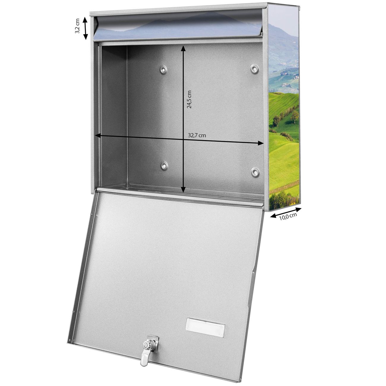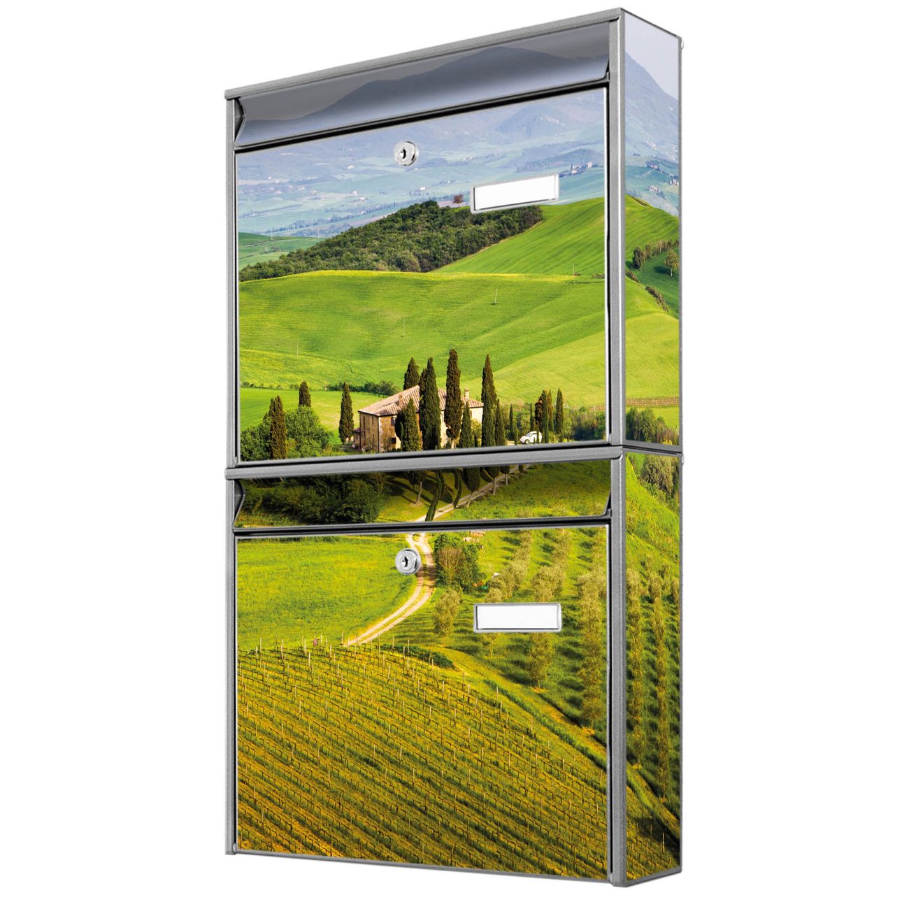FUNKTION: Die Burg-Wächter Briefkastenanlage mit Motiv Toskana bietet Ihnen ausreichend Fassungsvermögen um auch A4 und C4 Sendungen zu empfangen. Das integrierte Namensschild lässt sich individuell beschriften. Wählen Sie aus den Grundfarben weiß, silber und schwarz. DESIGN: Die 2 Briefkästen haben ein ansprechendes und zeitloses Design, ohne dabei auf Funktionalität zu verzichten. Das Material ist sehr stabil, wetterfest und rostfrei. Durch das Motiv Toskana werden die Postkästen zu einem Blickfang. DETAILS: Die Postkästen bestehen aus verzinktem Stahl der zusätzlich mit Klarlack versiegelt wurde. Die Kästen sind gesamt 64,5cm hoch, 36,2cm breit und 10cm tief. Das Motiv besteht aus einer wetter- und UV-festen Folie, die Ihren Briefkasten zusätzlich vor Kratzern schützt. Die Postkästen werden mit Montagematerial, je einem Namensschild und je zwei Schlüsseln geliefert. NUTZEN: Das Briefkastenset eignet sich für die Wandmontage, die Größe bietet genügend Platz für Sendungen aller Art. Das zeitlose Design sowie die stabile Bauart bieten Ihnen einen treuen Begleiter für Ihre Post. BANJADO: