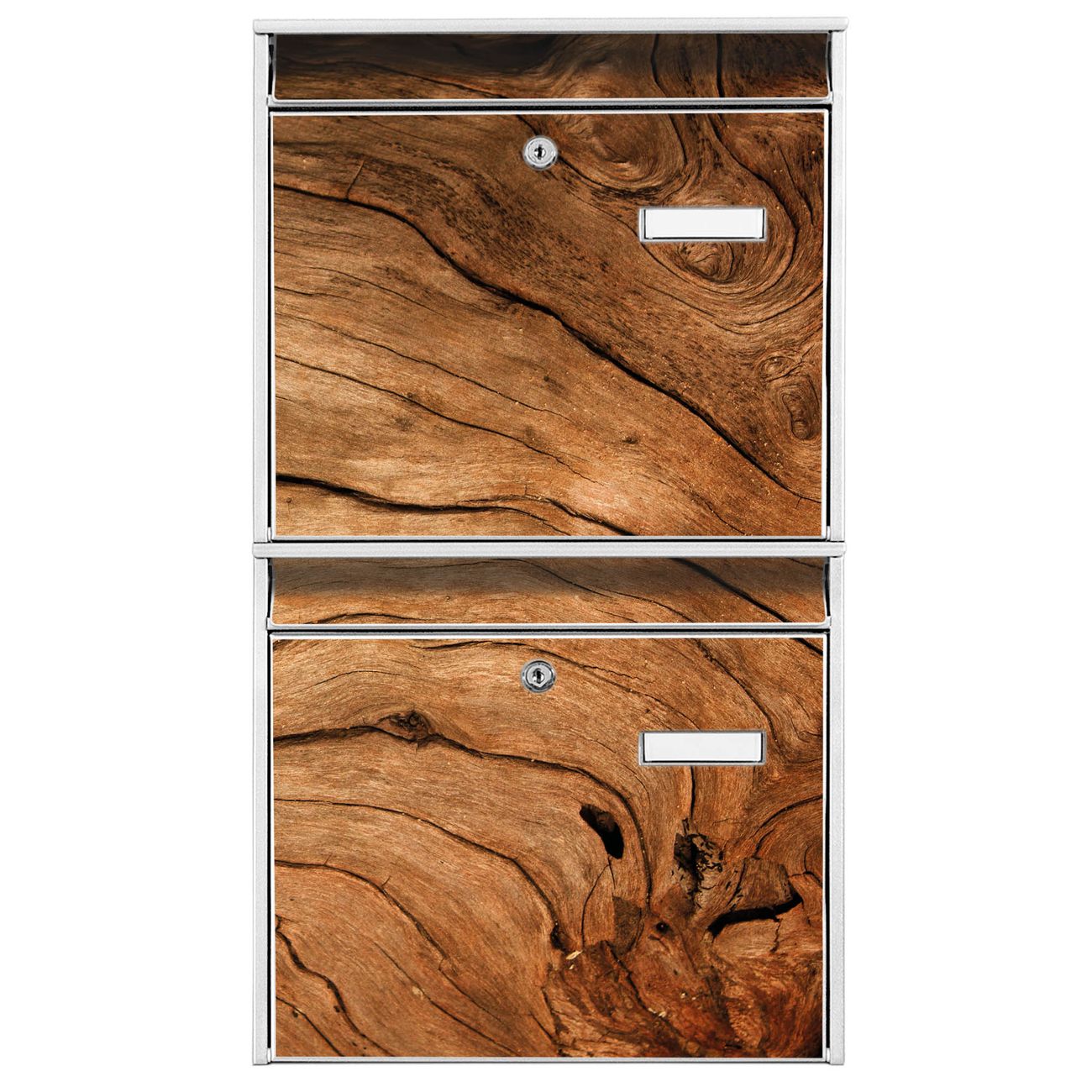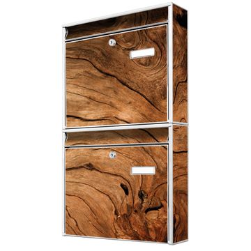 FUNKTION: Die Burg-Wächter Briefkastenanlage mit Motiv Trockenes Holz bietet Ihnen ausreichend Fassungsvermögen um auch A4 und C4 Sendungen zu empfangen. Das integrierte Namensschild lässt sich individuell beschriften. Wählen Sie aus den Grundfarben weiß, silber und schwarz. DESIGN: Die 2 Briefkästen haben ein ansprechendes und zeitloses Design, ohne dabei auf Funktionalität zu verzichten. Das Material ist sehr stabil, wetterfest und rostfrei. Durch das Motiv Trockenes Holz werden die Postkästen zu einem Blickfang. DETAILS: Die Postkästen bestehen aus verzinktem Stahl der zusätzlich mit Klarlack versiegelt wurde. Die Kästen sind gesamt 64,5cm hoch, 36,2cm breit und 10cm tief. Das Motiv besteht aus einer wetter- und UV-festen Folie, die Ihren Briefkasten zusätzlich vor Kratzern schützt. Die Postkästen werden mit Montagematerial, je einem Namensschild und je zwei Schlüsseln geliefert. NUTZEN: Das Briefkastenset eignet sich für die Wandmontage, die Größe bietet genügend Platz für Sendungen aller Art. Das zeitlose Design sowie die stabile Bauart bieten Ihnen einen treuen Begleiter für Ihre Post. BANJADO: