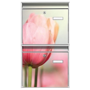 FUNKTION: Die Burg-Wächter Briefkastenanlage mit Motiv Tulpen bietet Ihnen ausreichend Fassungsvermögen um auch A4 und C4 Sendungen zu empfangen. Das integrierte Namensschild lässt sich individuell beschriften. Wählen Sie aus den Grundfarben weiß, silber und schwarz. DESIGN: Die 2 Briefkästen haben ein ansprechendes und zeitloses Design, ohne dabei auf Funktionalität zu verzichten. Das Material ist sehr stabil, wetterfest und rostfrei. Durch das Motiv Tulpen werden die Postkästen zu einem Blickfang. DETAILS: Die Postkästen bestehen aus verzinktem Stahl der zusätzlich mit Klarlack versiegelt wurde. Die Kästen sind gesamt 64,5cm hoch, 36,2cm breit und 10cm tief. Das Motiv besteht aus einer wetter- und UV-festen Folie, die Ihren Briefkasten zusätzlich vor Kratzern schützt. Die Postkästen werden mit Montagematerial, je einem Namensschild und je zwei Schlüsseln geliefert. NUTZEN: Das Briefkastenset eignet sich für die Wandmontage, die Größe bietet genügend Platz für Sendungen aller Art. Das zeitlose Design sowie die stabile Bauart bieten Ihnen einen treuen Begleiter für Ihre Post. BANJADO: