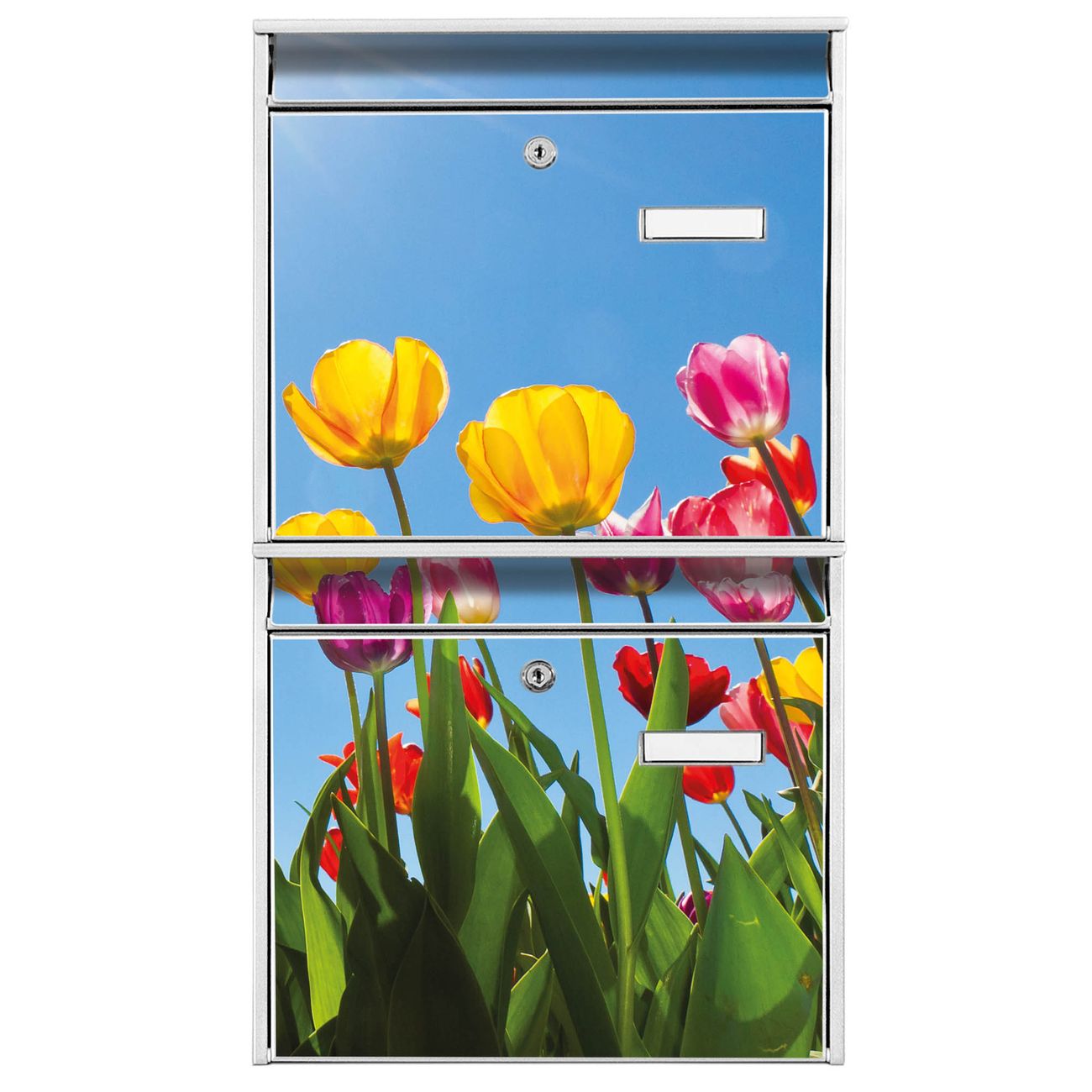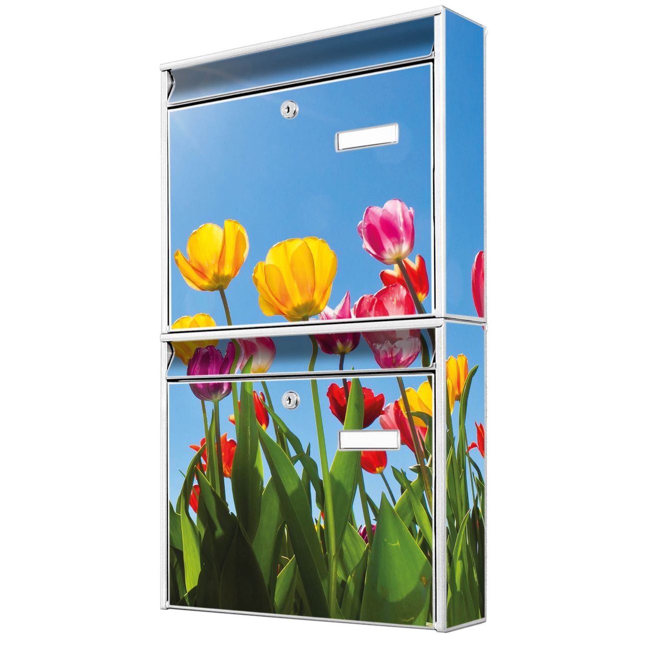 FUNKTION: Die Burg-Wächter Briefkastenanlage mit Motiv Tulpenmeer bietet Ihnen ausreichend Fassungsvermögen um auch A4 und C4 Sendungen zu empfangen. Das integrierte Namensschild lässt sich individuell beschriften. Wählen Sie aus den Grundfarben weiß, silber und schwarz. DESIGN: Die 2 Briefkästen haben ein ansprechendes und zeitloses Design, ohne dabei auf Funktionalität zu verzichten. Das Material ist sehr stabil, wetterfest und rostfrei. Durch das Motiv Tulpenmeer werden die Postkästen zu einem Blickfang. DETAILS: Die Postkästen bestehen aus verzinktem Stahl der zusätzlich mit Klarlack versiegelt wurde. Die Kästen sind gesamt 64,5cm hoch, 36,2cm breit und 10cm tief. Das Motiv besteht aus einer wetter- und UV-festen Folie, die Ihren Briefkasten zusätzlich vor Kratzern schützt. Die Postkästen werden mit Montagematerial, je einem Namensschild und je zwei Schlüsseln geliefert. NUTZEN: Das Briefkastenset eignet sich für die Wandmontage, die Größe bietet genügend Platz für Sendungen aller Art. Das zeitlose Design sowie die stabile Bauart bieten Ihnen einen treuen Begleiter für Ihre Post. BANJADO: