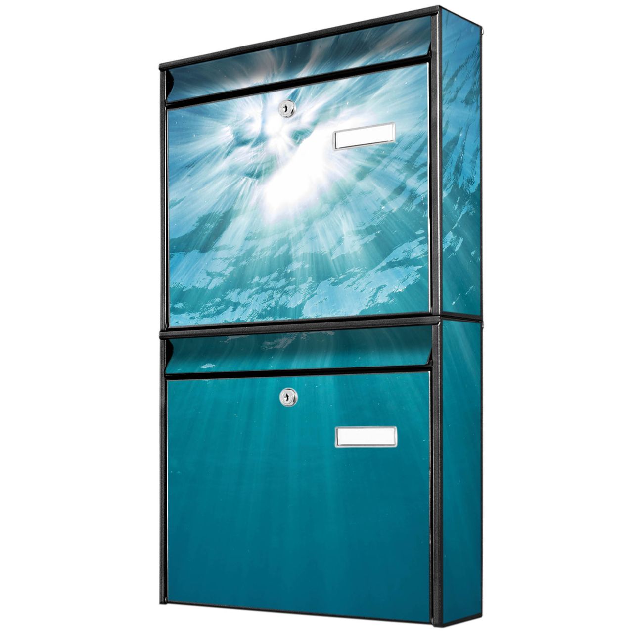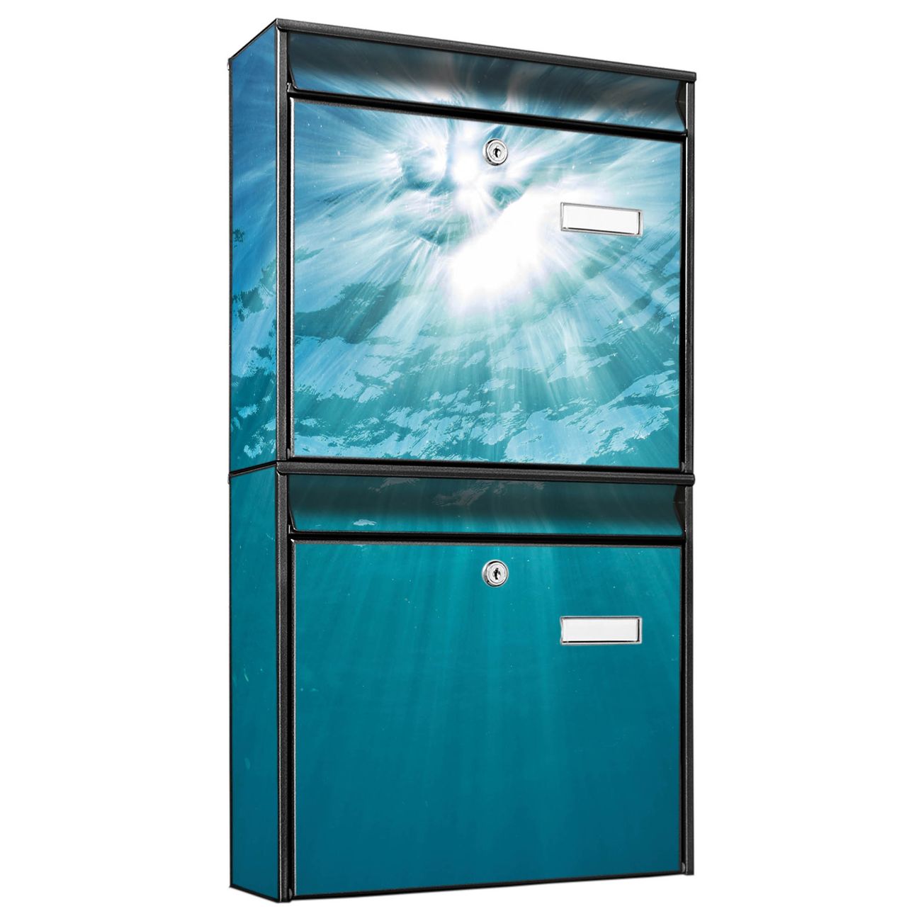 FUNKTION: Die Burg-Wächter Briefkastenanlage mit Motiv Unter der Oberfläche bietet Ihnen ausreichend Fassungsvermögen um auch A4 und C4 Sendungen zu empfangen. Das integrierte Namensschild lässt sich individuell beschriften. Wählen Sie aus den Grundfarben weiß, silber und schwarz. DESIGN: Die 2 Briefkästen haben ein ansprechendes und zeitloses Design, ohne dabei auf Funktionalität zu verzichten. Das Material ist sehr stabil, wetterfest und rostfrei. Durch das Motiv Unter der Oberfläche werden die Postkästen zu einem Blickfang. DETAILS: Die Postkästen bestehen aus verzinktem Stahl der zusätzlich mit Klarlack versiegelt wurde. Die Kästen sind gesamt 64,5cm hoch, 36,2cm breit und 10cm tief. Das Motiv besteht aus einer wetter- und UV-festen Folie, die Ihren Briefkasten zusätzlich vor Kratzern schützt. Die Postkästen werden mit Montagematerial, je einem Namensschild und je zwei Schlüsseln geliefert. NUTZEN: Das Briefkastenset eignet sich für die Wandmontage, die Größe bietet genügend Platz für Sendungen aller Art. Das zeitlose Design sowie die stabile Bauart bieten Ihnen einen treuen Begleiter für Ihre Post. BANJADO: