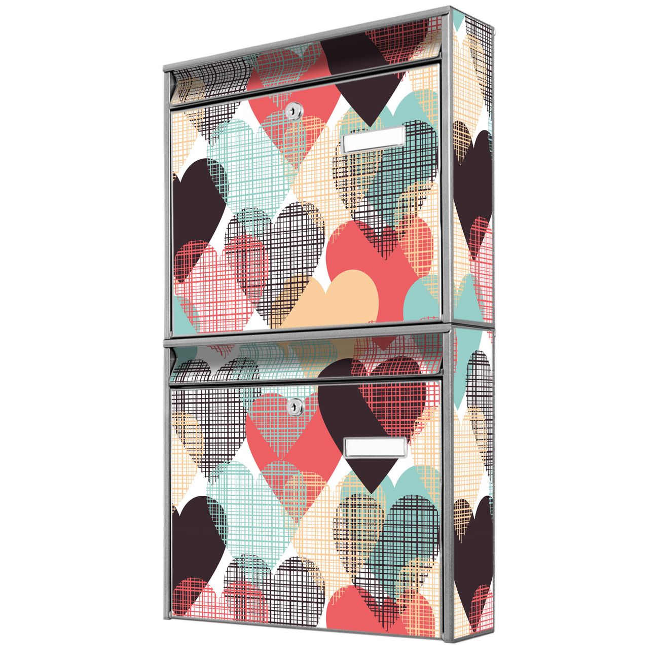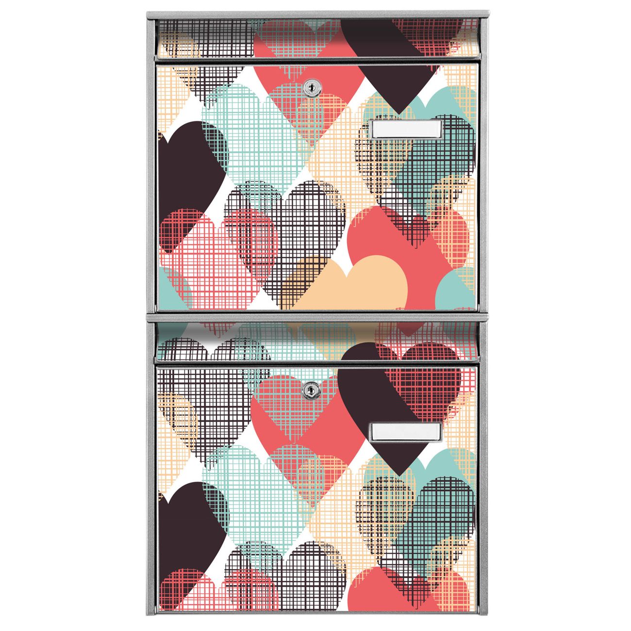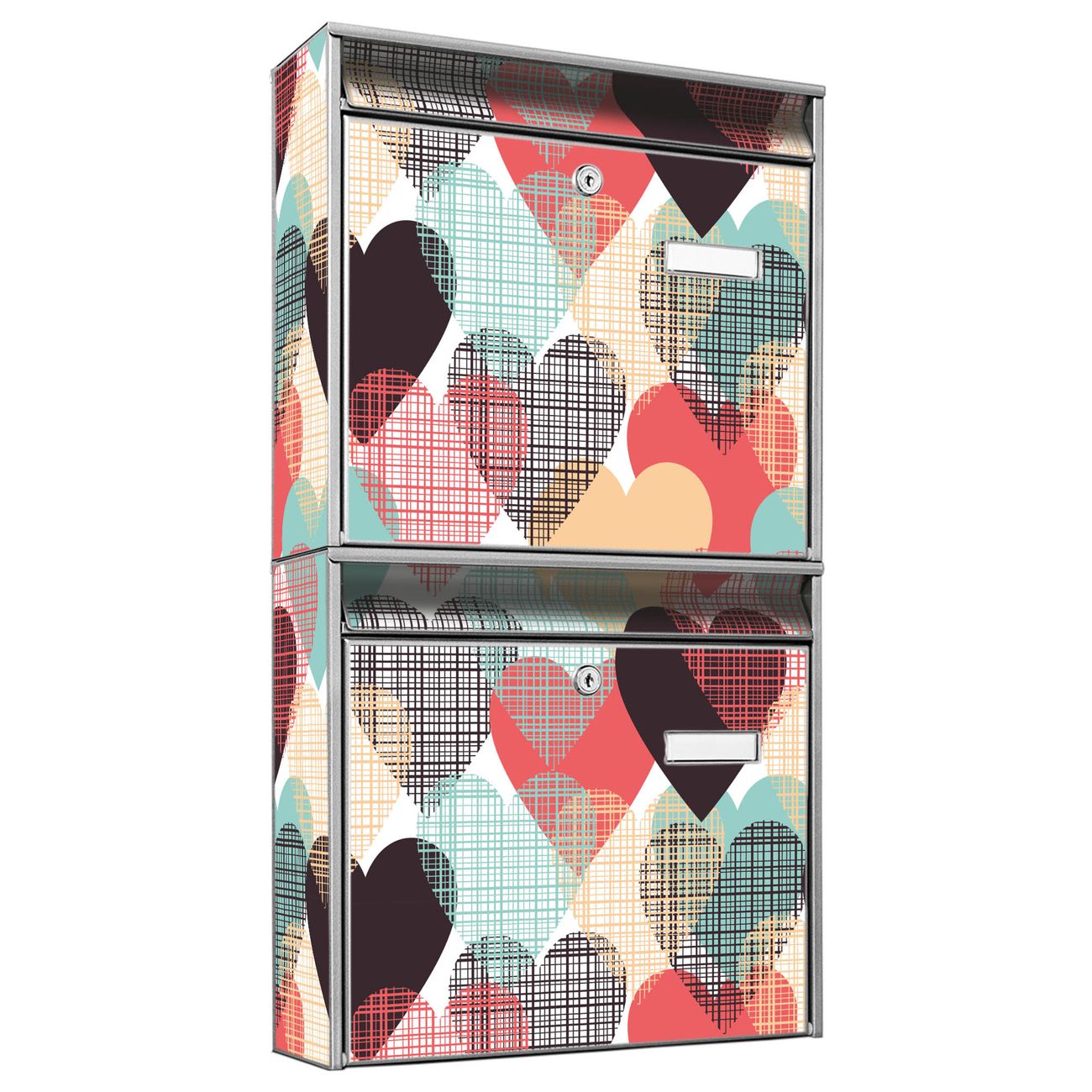 FUNKTION: Die Burg-Wächter Briefkastenanlage mit Motiv Unter Herzen bietet Ihnen ausreichend Fassungsvermögen um auch A4 und C4 Sendungen zu empfangen. Das integrierte Namensschild lässt sich individuell beschriften. Wählen Sie aus den Grundfarben weiß, silber und schwarz. DESIGN: Die 2 Briefkästen haben ein ansprechendes und zeitloses Design, ohne dabei auf Funktionalität zu verzichten. Das Material ist sehr stabil, wetterfest und rostfrei. Durch das Motiv Unter Herzen werden die Postkästen zu einem Blickfang. DETAILS: Die Postkästen bestehen aus verzinktem Stahl der zusätzlich mit Klarlack versiegelt wurde. Die Kästen sind gesamt 64,5cm hoch, 36,2cm breit und 10cm tief. Das Motiv besteht aus einer wetter- und UV-festen Folie, die Ihren Briefkasten zusätzlich vor Kratzern schützt. Die Postkästen werden mit Montagematerial, je einem Namensschild und je zwei Schlüsseln geliefert. NUTZEN: Das Briefkastenset eignet sich für die Wandmontage, die Größe bietet genügend Platz für Sendungen aller Art. Das zeitlose Design sowie die stabile Bauart bieten Ihnen einen treuen Begleiter für Ihre Post. BANJADO: