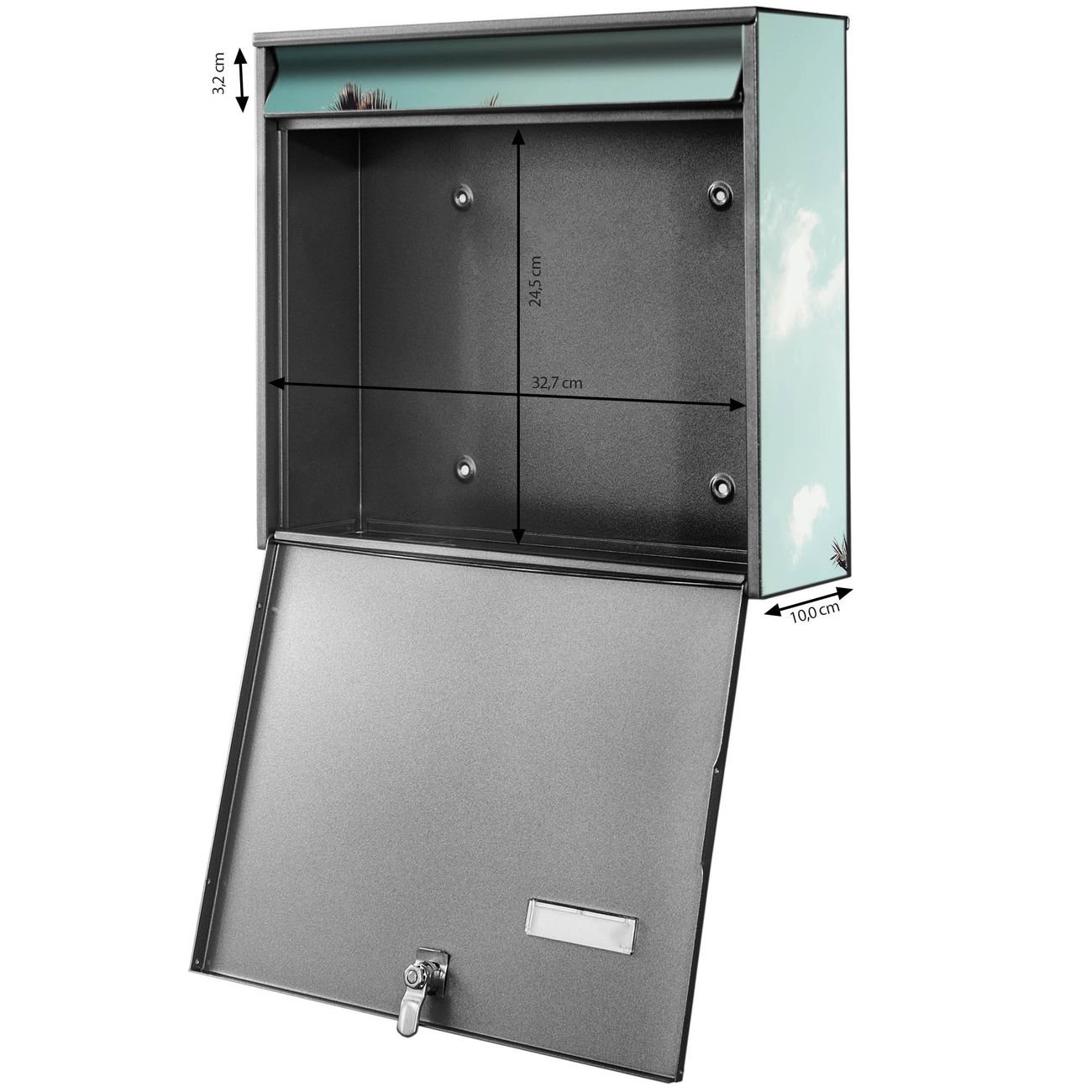 FUNKTION: Die Burg-Wächter Briefkastenanlage mit Motiv Unter Palmen bietet Ihnen ausreichend Fassungsvermögen um auch A4 und C4 Sendungen zu empfangen. Das integrierte Namensschild lässt sich individuell beschriften. Wählen Sie aus den Grundfarben weiß, silber und schwarz. DESIGN: Die 2 Briefkästen haben ein ansprechendes und zeitloses Design, ohne dabei auf Funktionalität zu verzichten. Das Material ist sehr stabil, wetterfest und rostfrei. Durch das Motiv Unter Palmen werden die Postkästen zu einem Blickfang. DETAILS: Die Postkästen bestehen aus verzinktem Stahl der zusätzlich mit Klarlack versiegelt wurde. Die Kästen sind gesamt 64,5cm hoch, 36,2cm breit und 10cm tief. Das Motiv besteht aus einer wetter- und UV-festen Folie, die Ihren Briefkasten zusätzlich vor Kratzern schützt. Die Postkästen werden mit Montagematerial, je einem Namensschild und je zwei Schlüsseln geliefert. NUTZEN: Das Briefkastenset eignet sich für die Wandmontage, die Größe bietet genügend Platz für Sendungen aller Art. Das zeitlose Design sowie die stabile Bauart bieten Ihnen einen treuen Begleiter für Ihre Post. BANJADO: