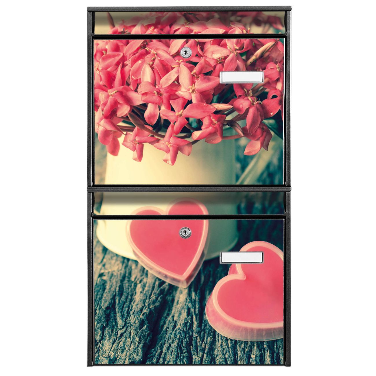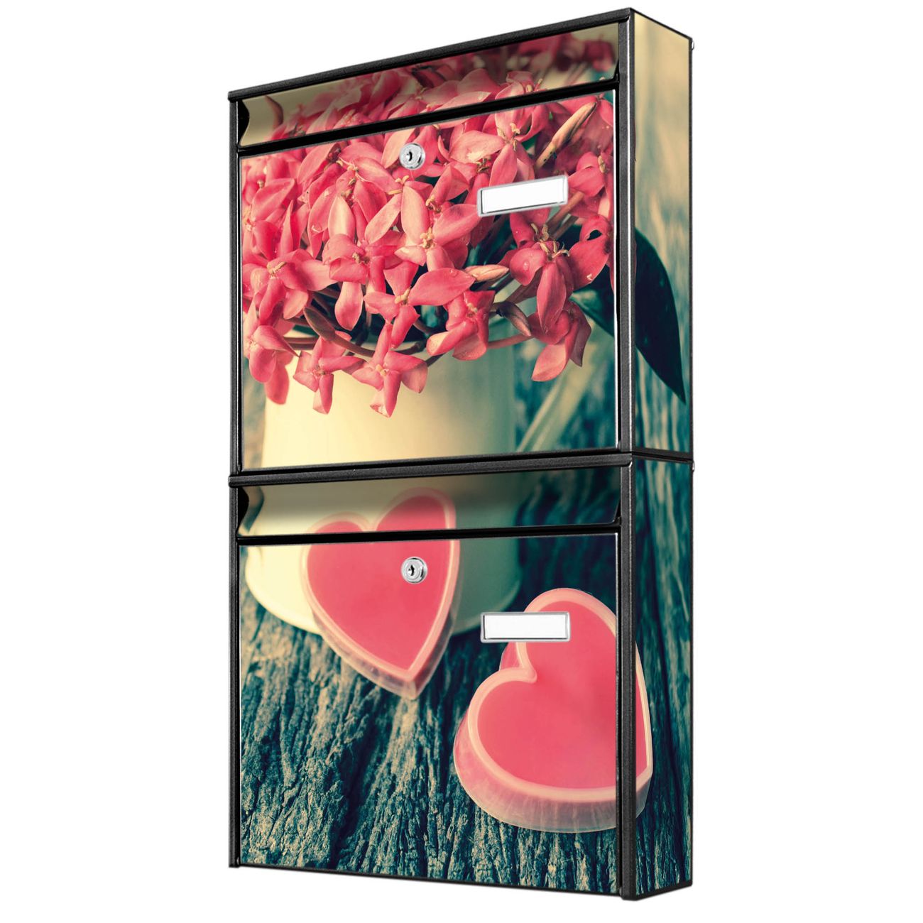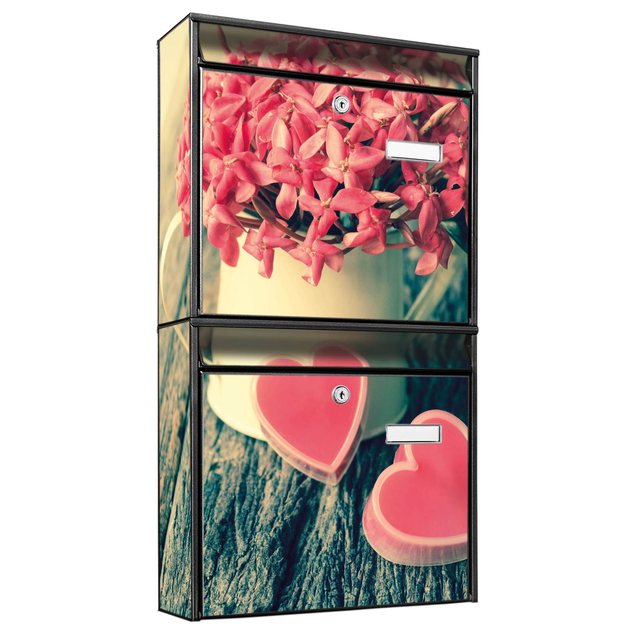 FUNKTION: Die Burg-Wächter Briefkastenanlage mit Motiv Valentin bietet Ihnen ausreichend Fassungsvermögen um auch A4 und C4 Sendungen zu empfangen. Das integrierte Namensschild lässt sich individuell beschriften. Wählen Sie aus den Grundfarben weiß, silber und schwarz. DESIGN: Die 2 Briefkästen haben ein ansprechendes und zeitloses Design, ohne dabei auf Funktionalität zu verzichten. Das Material ist sehr stabil, wetterfest und rostfrei. Durch das Motiv Valentin werden die Postkästen zu einem Blickfang. DETAILS: Die Postkästen bestehen aus verzinktem Stahl der zusätzlich mit Klarlack versiegelt wurde. Die Kästen sind gesamt 64,5cm hoch, 36,2cm breit und 10cm tief. Das Motiv besteht aus einer wetter- und UV-festen Folie, die Ihren Briefkasten zusätzlich vor Kratzern schützt. Die Postkästen werden mit Montagematerial, je einem Namensschild und je zwei Schlüsseln geliefert. NUTZEN: Das Briefkastenset eignet sich für die Wandmontage, die Größe bietet genügend Platz für Sendungen aller Art. Das zeitlose Design sowie die stabile Bauart bieten Ihnen einen treuen Begleiter für Ihre Post. BANJADO: