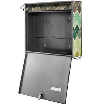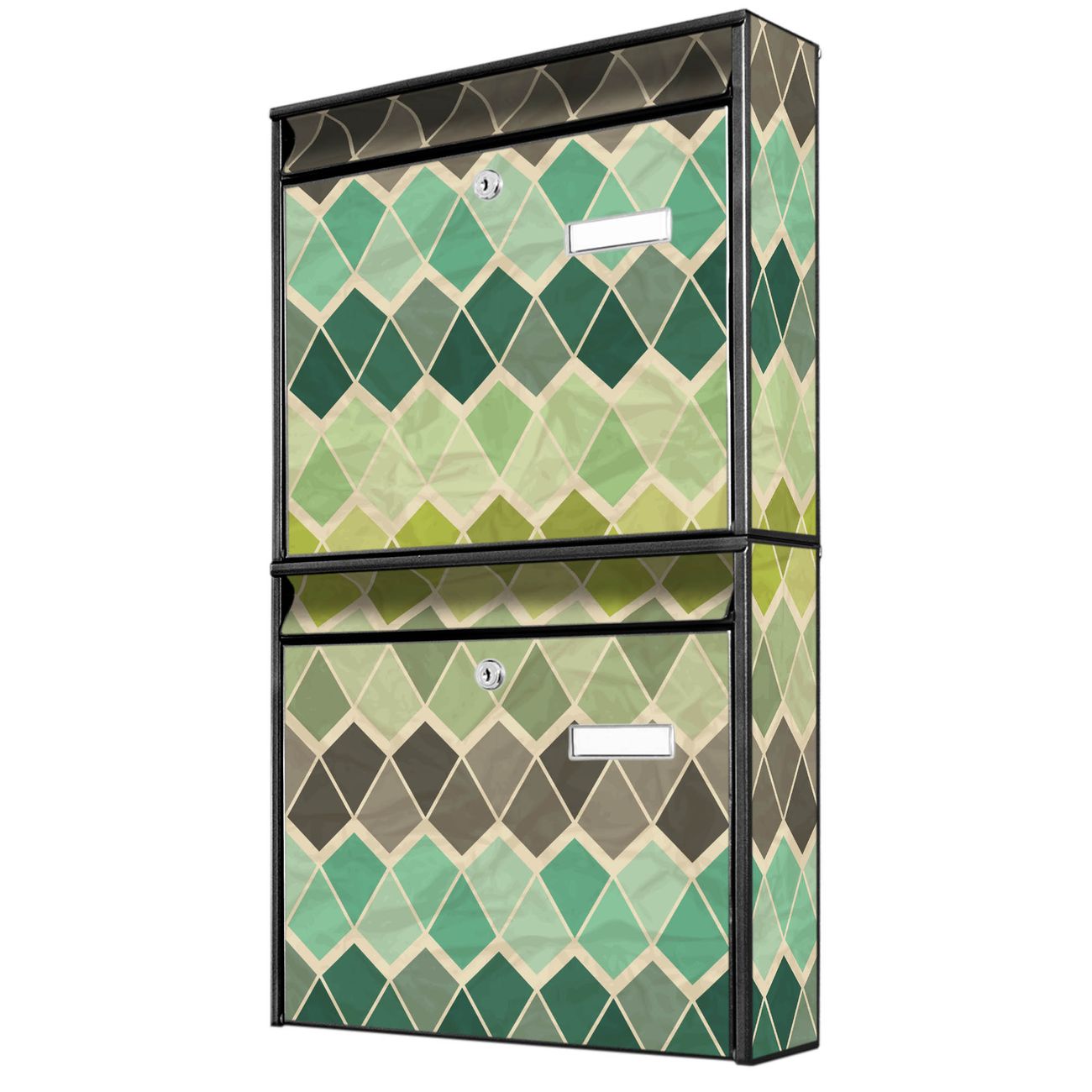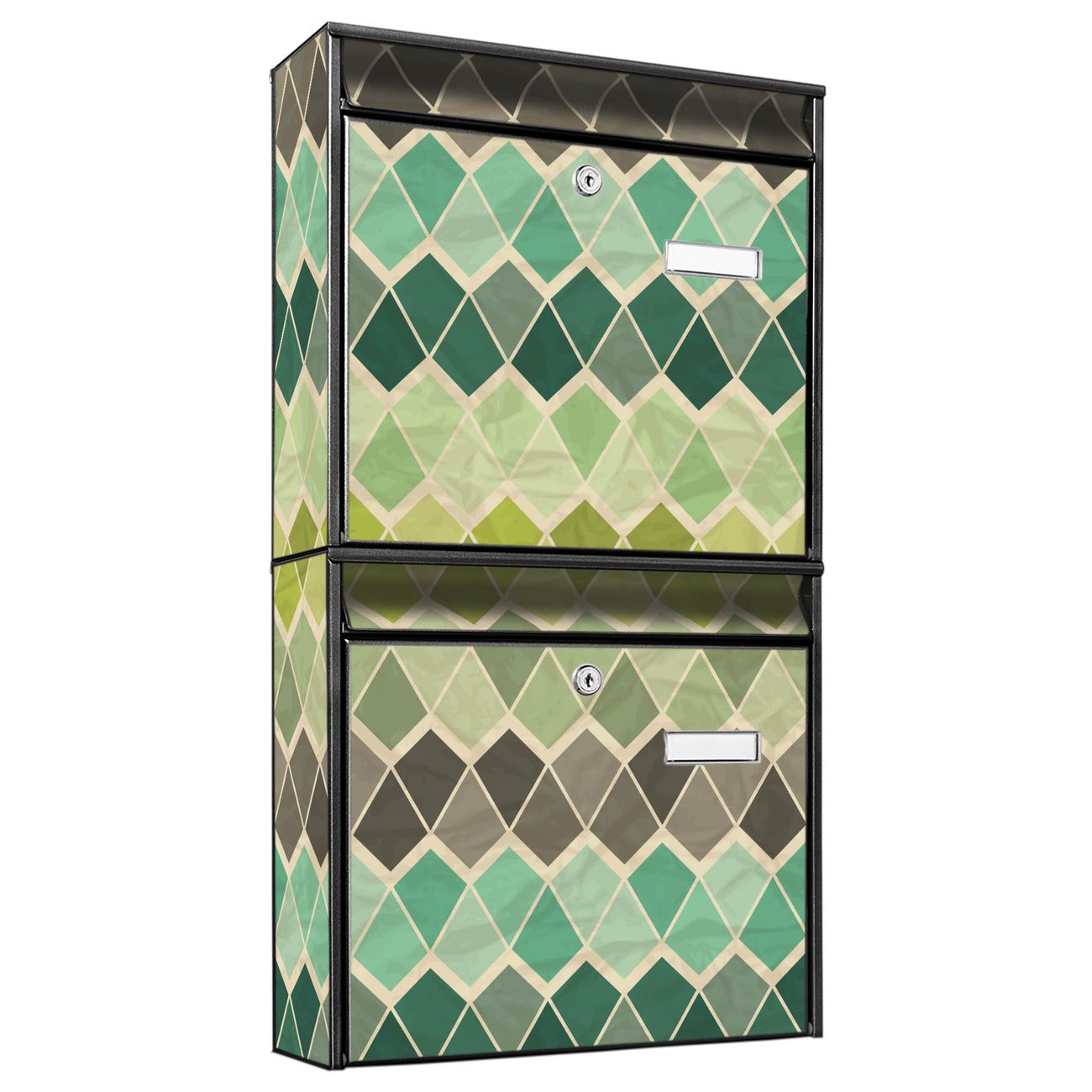 FUNKTION: Die Burg-Wächter Briefkastenanlage mit Motiv Vier Farben Grün bietet Ihnen ausreichend Fassungsvermögen um auch A4 und C4 Sendungen zu empfangen. Das integrierte Namensschild lässt sich individuell beschriften. Wählen Sie aus den Grundfarben weiß, silber und schwarz. DESIGN: Die 2 Briefkästen haben ein ansprechendes und zeitloses Design, ohne dabei auf Funktionalität zu verzichten. Das Material ist sehr stabil, wetterfest und rostfrei. Durch das Motiv Vier Farben Grün werden die Postkästen zu einem Blickfang. DETAILS: Die Postkästen bestehen aus verzinktem Stahl der zusätzlich mit Klarlack versiegelt wurde. Die Kästen sind gesamt 64,5cm hoch, 36,2cm breit und 10cm tief. Das Motiv besteht aus einer wetter- und UV-festen Folie, die Ihren Briefkasten zusätzlich vor Kratzern schützt. Die Postkästen werden mit Montagematerial, je einem Namensschild und je zwei Schlüsseln geliefert. NUTZEN: Das Briefkastenset eignet sich für die Wandmontage, die Größe bietet genügend Platz für Sendungen aller Art. Das zeitlose Design sowie die stabile Bauart bieten Ihnen einen treuen Begleiter für Ihre Post. BANJADO:
