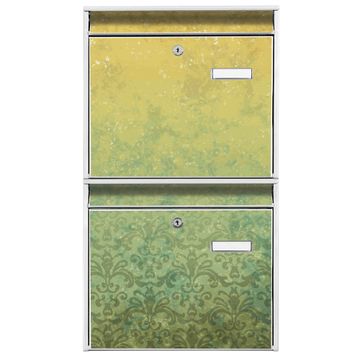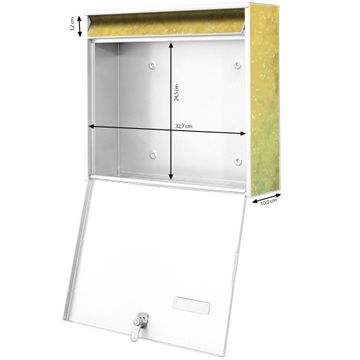 FUNKTION: Die Burg-Wächter Briefkastenanlage mit Motiv Vintage Messing bietet Ihnen ausreichend Fassungsvermögen um auch A4 und C4 Sendungen zu empfangen. Das integrierte Namensschild lässt sich individuell beschriften. Wählen Sie aus den Grundfarben weiß, silber und schwarz. DESIGN: Die 2 Briefkästen haben ein ansprechendes und zeitloses Design, ohne dabei auf Funktionalität zu verzichten. Das Material ist sehr stabil, wetterfest und rostfrei. Durch das Motiv Vintage Messing werden die Postkästen zu einem Blickfang. DETAILS: Die Postkästen bestehen aus verzinktem Stahl der zusätzlich mit Klarlack versiegelt wurde. Die Kästen sind gesamt 64,5cm hoch, 36,2cm breit und 10cm tief. Das Motiv besteht aus einer wetter- und UV-festen Folie, die Ihren Briefkasten zusätzlich vor Kratzern schützt. Die Postkästen werden mit Montagematerial, je einem Namensschild und je zwei Schlüsseln geliefert. NUTZEN: Das Briefkastenset eignet sich für die Wandmontage, die Größe bietet genügend Platz für Sendungen aller Art. Das zeitlose Design sowie die stabile Bauart bieten Ihnen einen treuen Begleiter für Ihre Post. BANJADO: