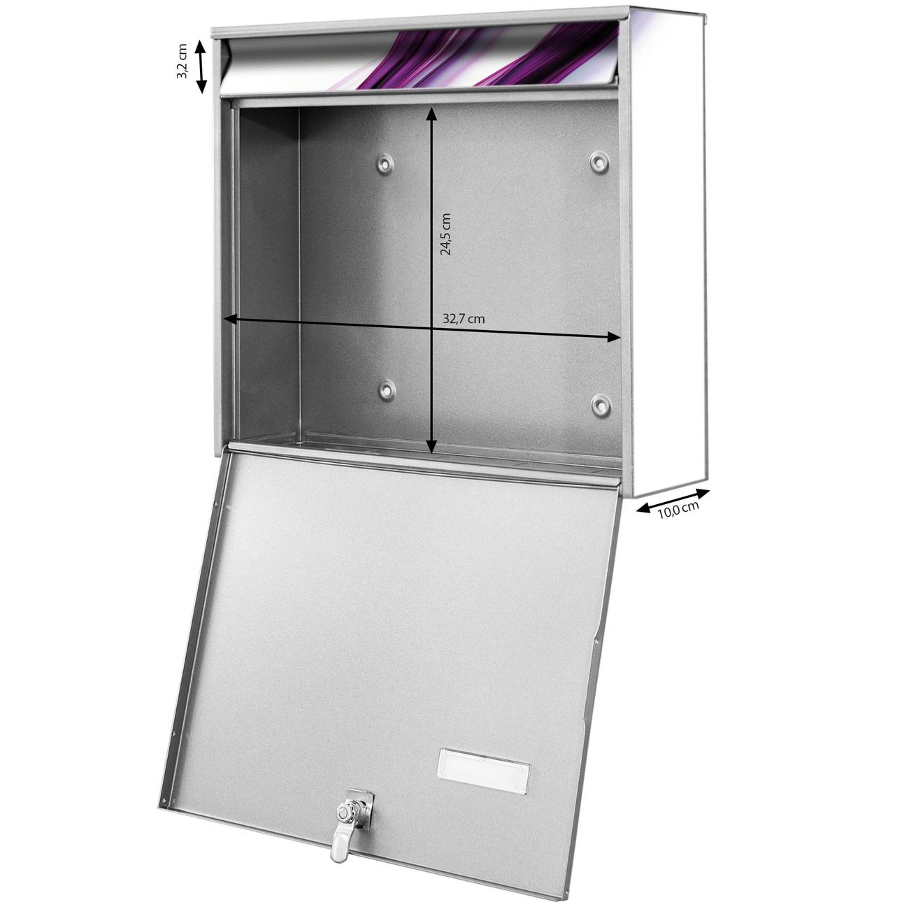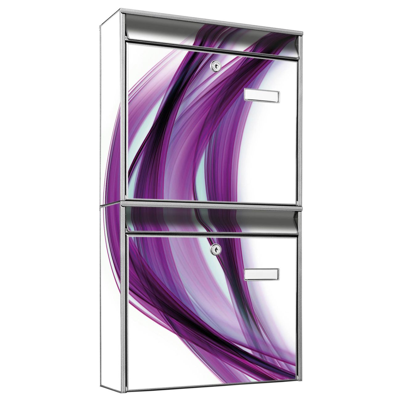 FUNKTION: Die Burg-Wächter Briefkastenanlage mit Motiv Violet Element bietet Ihnen ausreichend Fassungsvermögen um auch A4 und C4 Sendungen zu empfangen. Das integrierte Namensschild lässt sich individuell beschriften. Wählen Sie aus den Grundfarben weiß, silber und schwarz. DESIGN: Die 2 Briefkästen haben ein ansprechendes und zeitloses Design, ohne dabei auf Funktionalität zu verzichten. Das Material ist sehr stabil, wetterfest und rostfrei. Durch das Motiv Violet Element werden die Postkästen zu einem Blickfang. DETAILS: Die Postkästen bestehen aus verzinktem Stahl der zusätzlich mit Klarlack versiegelt wurde. Die Kästen sind gesamt 64,5cm hoch, 36,2cm breit und 10cm tief. Das Motiv besteht aus einer wetter- und UV-festen Folie, die Ihren Briefkasten zusätzlich vor Kratzern schützt. Die Postkästen werden mit Montagematerial, je einem Namensschild und je zwei Schlüsseln geliefert. NUTZEN: Das Briefkastenset eignet sich für die Wandmontage, die Größe bietet genügend Platz für Sendungen aller Art. Das zeitlose Design sowie die stabile Bauart bieten Ihnen einen treuen Begleiter für Ihre Post. BANJADO: