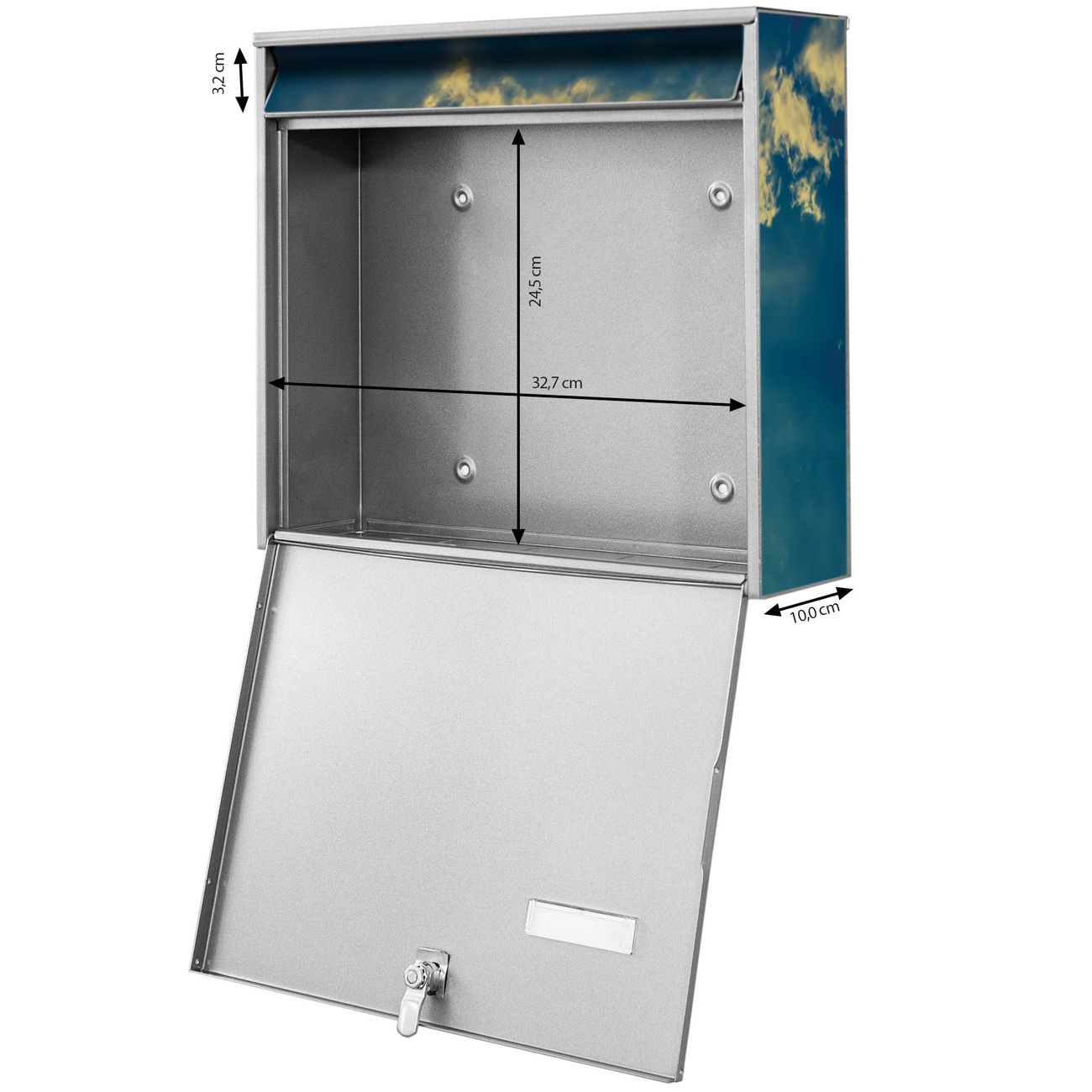 FUNKTION: Die Burg-Wächter Briefkastenanlage mit Motiv Vollmond 2 bietet Ihnen ausreichend Fassungsvermögen um auch A4 und C4 Sendungen zu empfangen. Das integrierte Namensschild lässt sich individuell beschriften. Wählen Sie aus den Grundfarben weiß, silber und schwarz. DESIGN: Die 2 Briefkästen haben ein ansprechendes und zeitloses Design, ohne dabei auf Funktionalität zu verzichten. Das Material ist sehr stabil, wetterfest und rostfrei. Durch das Motiv Vollmond 2 werden die Postkästen zu einem Blickfang. DETAILS: Die Postkästen bestehen aus verzinktem Stahl der zusätzlich mit Klarlack versiegelt wurde. Die Kästen sind gesamt 64,5cm hoch, 36,2cm breit und 10cm tief. Das Motiv besteht aus einer wetter- und UV-festen Folie, die Ihren Briefkasten zusätzlich vor Kratzern schützt. Die Postkästen werden mit Montagematerial, je einem Namensschild und je zwei Schlüsseln geliefert. NUTZEN: Das Briefkastenset eignet sich für die Wandmontage, die Größe bietet genügend Platz für Sendungen aller Art. Das zeitlose Design sowie die stabile Bauart bieten Ihnen einen treuen Begleiter für Ihre Post. BANJADO: