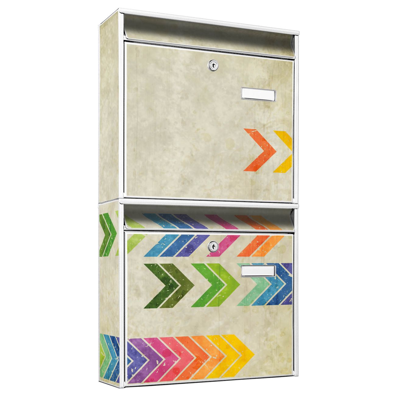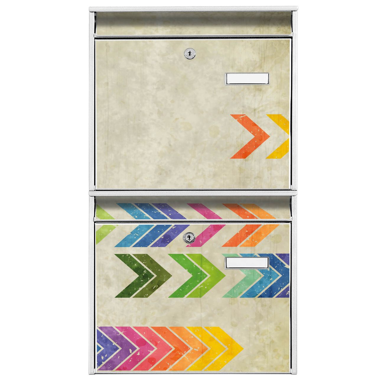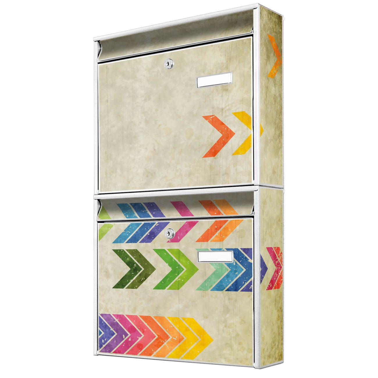FUNKTION: Die Burg-Wächter Briefkastenanlage mit Motiv Vorspulen bietet Ihnen ausreichend Fassungsvermögen um auch A4 und C4 Sendungen zu empfangen. Das integrierte Namensschild lässt sich individuell beschriften. Wählen Sie aus den Grundfarben weiß, silber und schwarz. DESIGN: Die 2 Briefkästen haben ein ansprechendes und zeitloses Design, ohne dabei auf Funktionalität zu verzichten. Das Material ist sehr stabil, wetterfest und rostfrei. Durch das Motiv Vorspulen werden die Postkästen zu einem Blickfang. DETAILS: Die Postkästen bestehen aus verzinktem Stahl der zusätzlich mit Klarlack versiegelt wurde. Die Kästen sind gesamt 64,5cm hoch, 36,2cm breit und 10cm tief. Das Motiv besteht aus einer wetter- und UV-festen Folie, die Ihren Briefkasten zusätzlich vor Kratzern schützt. Die Postkästen werden mit Montagematerial, je einem Namensschild und je zwei Schlüsseln geliefert. NUTZEN: Das Briefkastenset eignet sich für die Wandmontage, die Größe bietet genügend Platz für Sendungen aller Art. Das zeitlose Design sowie die stabile Bauart bieten Ihnen einen treuen Begleiter für Ihre Post. BANJADO: