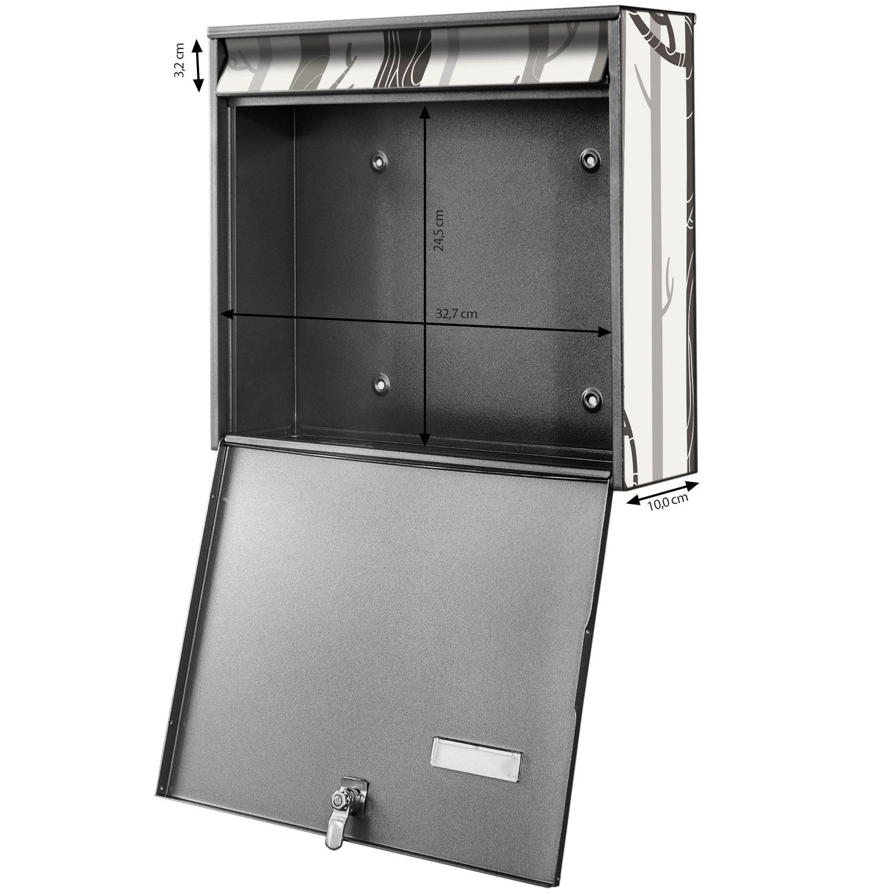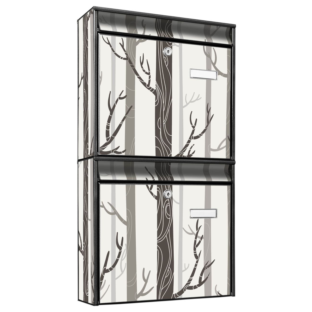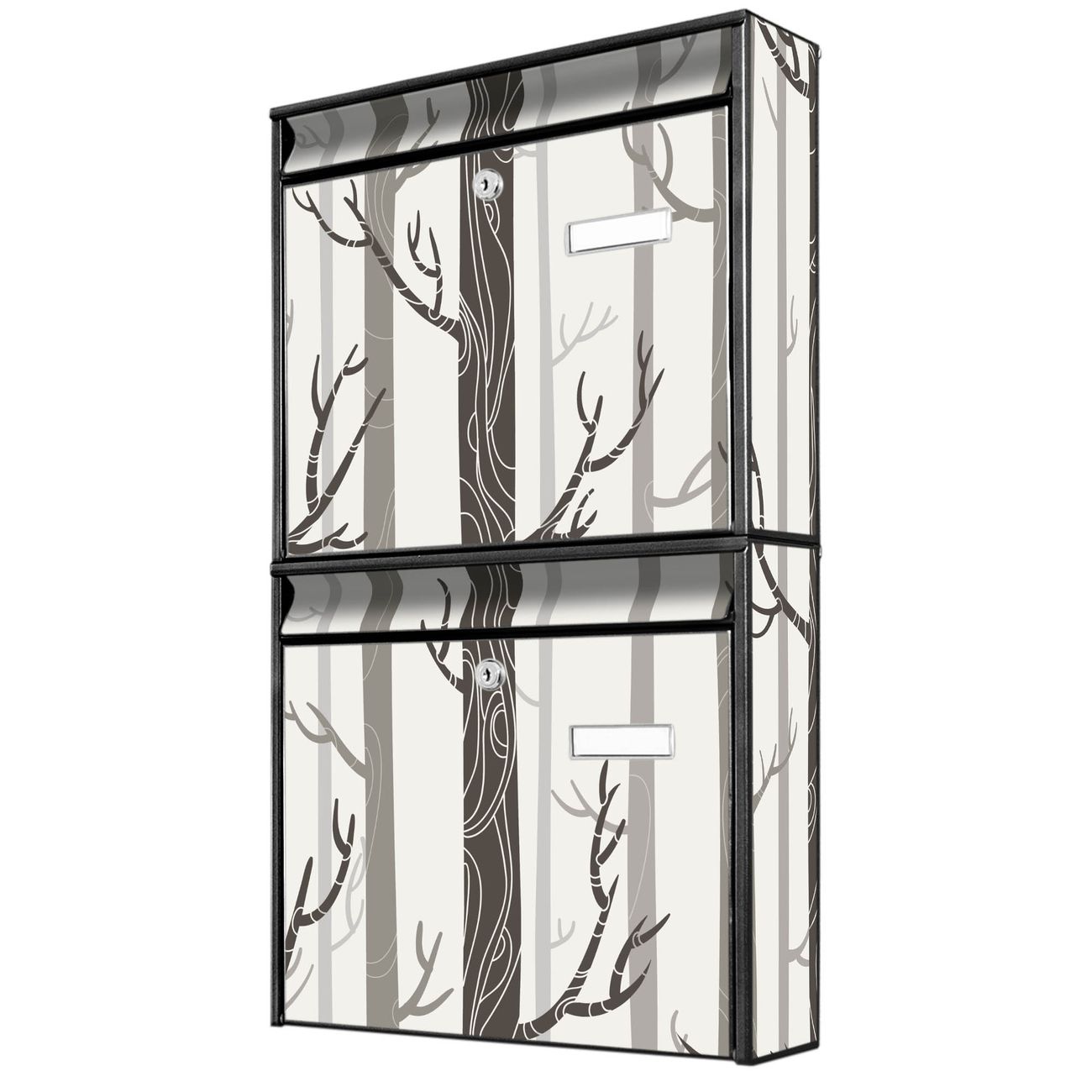 FUNKTION: Die Burg-Wächter Briefkastenanlage mit Motiv Wald bietet Ihnen ausreichend Fassungsvermögen um auch A4 und C4 Sendungen zu empfangen. Das integrierte Namensschild lässt sich individuell beschriften. Wählen Sie aus den Grundfarben weiß, silber und schwarz. DESIGN: Die 2 Briefkästen haben ein ansprechendes und zeitloses Design, ohne dabei auf Funktionalität zu verzichten. Das Material ist sehr stabil, wetterfest und rostfrei. Durch das Motiv Wald werden die Postkästen zu einem Blickfang. DETAILS: Die Postkästen bestehen aus verzinktem Stahl der zusätzlich mit Klarlack versiegelt wurde. Die Kästen sind gesamt 64,5cm hoch, 36,2cm breit und 10cm tief. Das Motiv besteht aus einer wetter- und UV-festen Folie, die Ihren Briefkasten zusätzlich vor Kratzern schützt. Die Postkästen werden mit Montagematerial, je einem Namensschild und je zwei Schlüsseln geliefert. NUTZEN: Das Briefkastenset eignet sich für die Wandmontage, die Größe bietet genügend Platz für Sendungen aller Art. Das zeitlose Design sowie die stabile Bauart bieten Ihnen einen treuen Begleiter für Ihre Post. BANJADO: