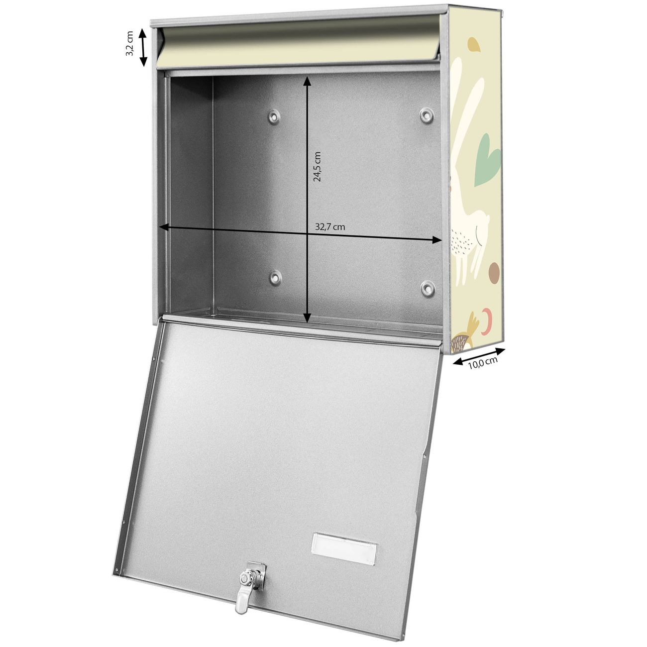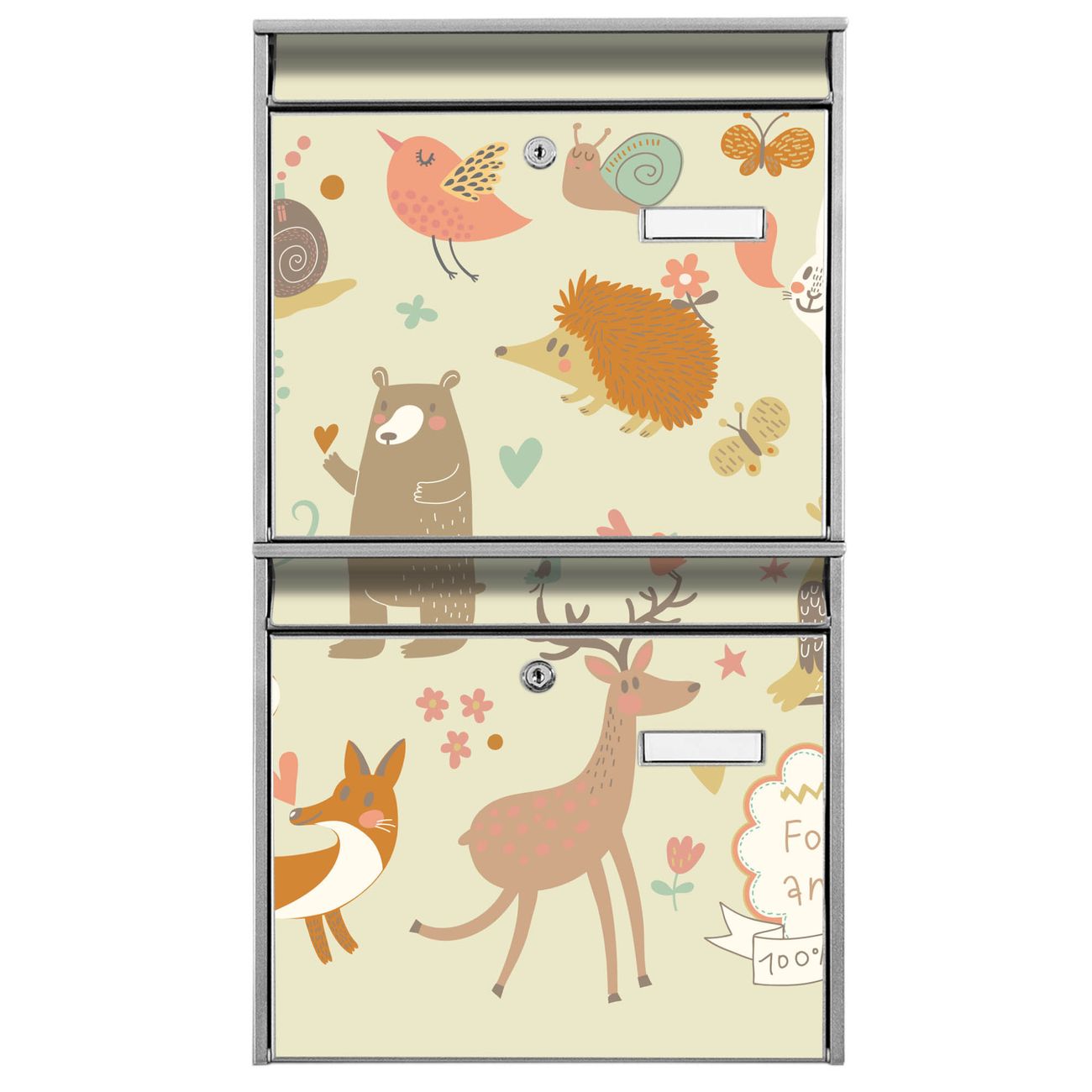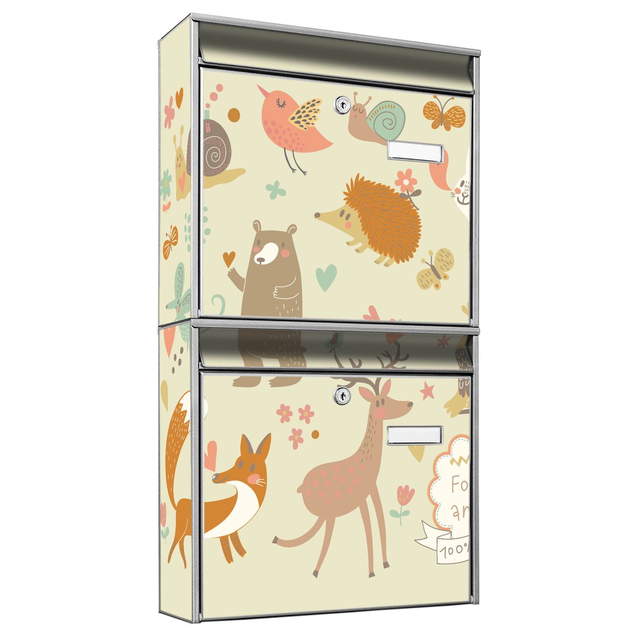 FUNKTION: Die Burg-Wächter Briefkastenanlage mit Motiv Waldtiere bietet Ihnen ausreichend Fassungsvermögen um auch A4 und C4 Sendungen zu empfangen. Das integrierte Namensschild lässt sich individuell beschriften. Wählen Sie aus den Grundfarben weiß, silber und schwarz. DESIGN: Die 2 Briefkästen haben ein ansprechendes und zeitloses Design, ohne dabei auf Funktionalität zu verzichten. Das Material ist sehr stabil, wetterfest und rostfrei. Durch das Motiv Waldtiere werden die Postkästen zu einem Blickfang. DETAILS: Die Postkästen bestehen aus verzinktem Stahl der zusätzlich mit Klarlack versiegelt wurde. Die Kästen sind gesamt 64,5cm hoch, 36,2cm breit und 10cm tief. Das Motiv besteht aus einer wetter- und UV-festen Folie, die Ihren Briefkasten zusätzlich vor Kratzern schützt. Die Postkästen werden mit Montagematerial, je einem Namensschild und je zwei Schlüsseln geliefert. NUTZEN: Das Briefkastenset eignet sich für die Wandmontage, die Größe bietet genügend Platz für Sendungen aller Art. Das zeitlose Design sowie die stabile Bauart bieten Ihnen einen treuen Begleiter für Ihre Post. BANJADO:
