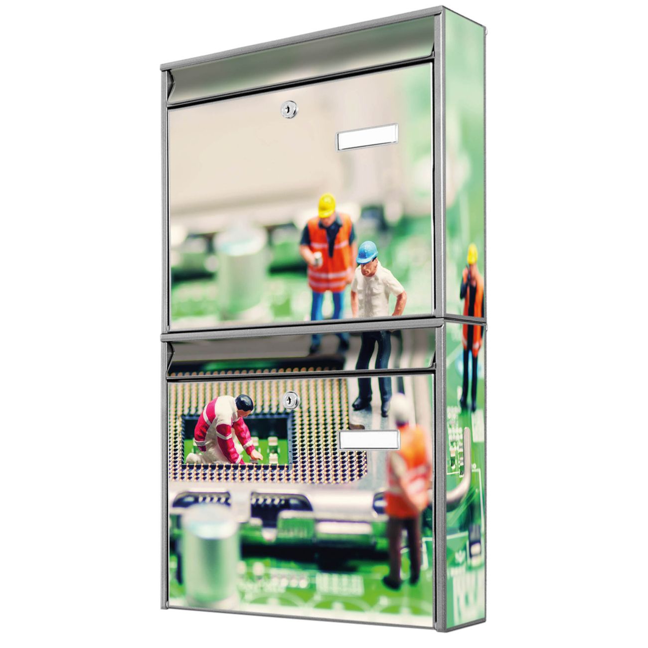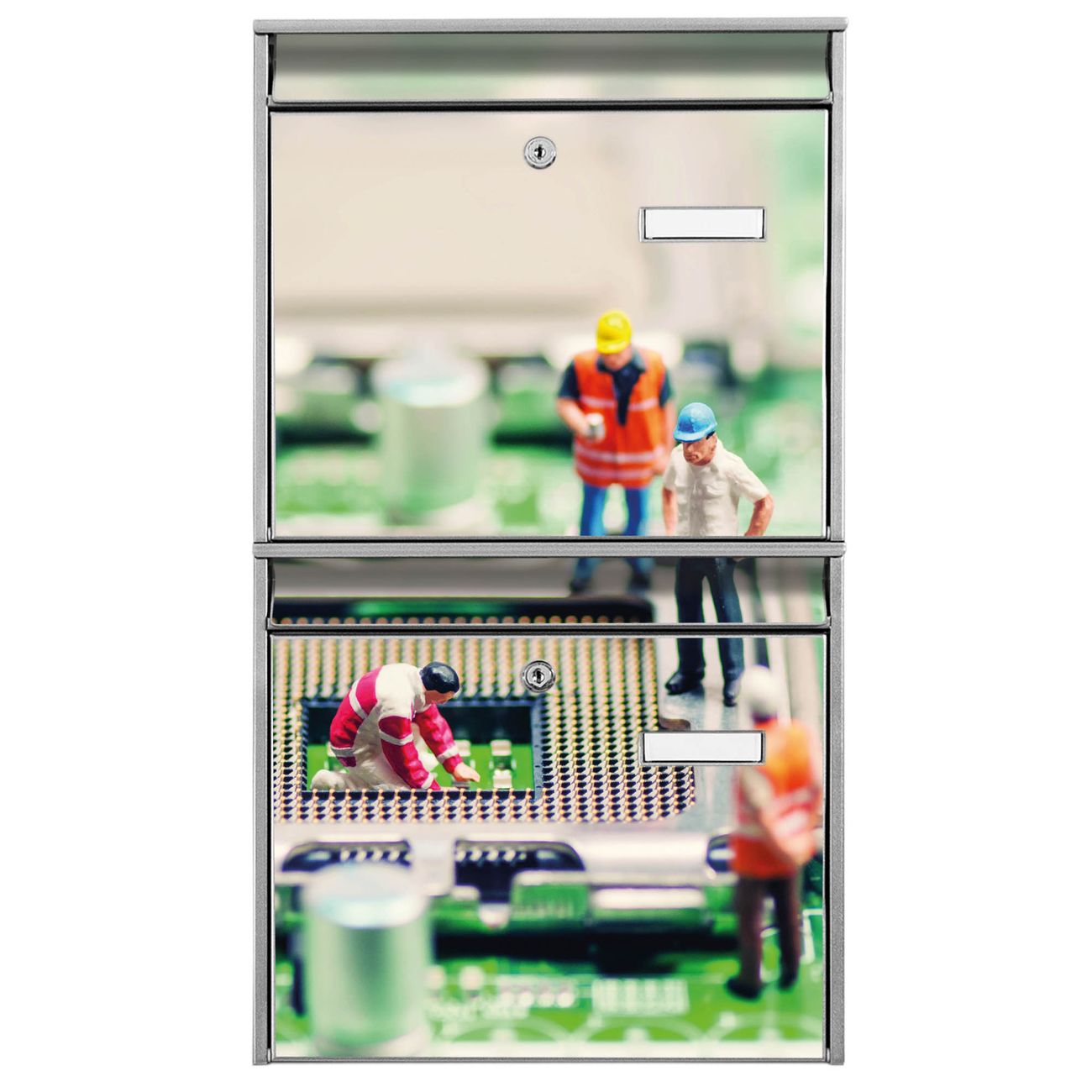 FUNKTION: Die Burg-Wächter Briefkastenanlage mit Motiv Wartungsarbeiten bietet Ihnen ausreichend Fassungsvermögen um auch A4 und C4 Sendungen zu empfangen. Das integrierte Namensschild lässt sich individuell beschriften. Wählen Sie aus den Grundfarben weiß, silber und schwarz. DESIGN: Die 2 Briefkästen haben ein ansprechendes und zeitloses Design, ohne dabei auf Funktionalität zu verzichten. Das Material ist sehr stabil, wetterfest und rostfrei. Durch das Motiv Wartungsarbeiten werden die Postkästen zu einem Blickfang. DETAILS: Die Postkästen bestehen aus verzinktem Stahl der zusätzlich mit Klarlack versiegelt wurde. Die Kästen sind gesamt 64,5cm hoch, 36,2cm breit und 10cm tief. Das Motiv besteht aus einer wetter- und UV-festen Folie, die Ihren Briefkasten zusätzlich vor Kratzern schützt. Die Postkästen werden mit Montagematerial, je einem Namensschild und je zwei Schlüsseln geliefert. NUTZEN: Das Briefkastenset eignet sich für die Wandmontage, die Größe bietet genügend Platz für Sendungen aller Art. Das zeitlose Design sowie die stabile Bauart bieten Ihnen einen treuen Begleiter für Ihre Post. BANJADO: