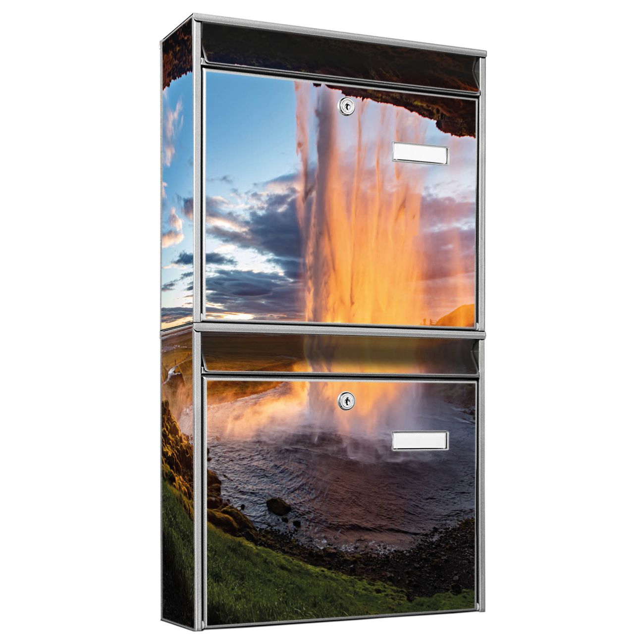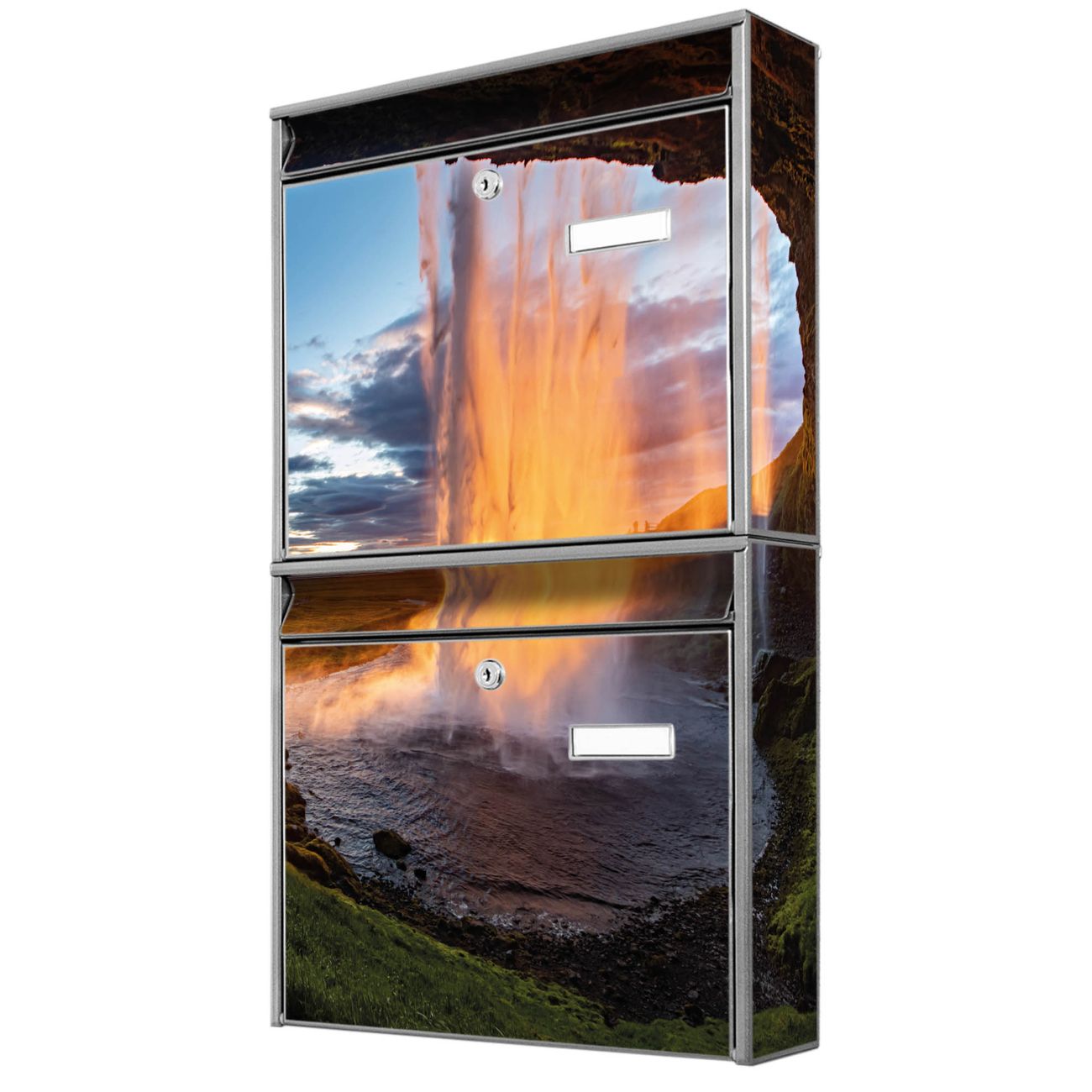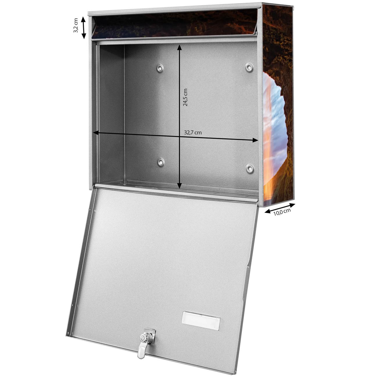 FUNKTION: Die Burg-Wächter Briefkastenanlage mit Motiv Wasserfall im Sonnenlicht bietet Ihnen ausreichend Fassungsvermögen um auch A4 und C4 Sendungen zu empfangen. Das integrierte Namensschild lässt sich individuell beschriften. Wählen Sie aus den Grundfarben weiß, silber und schwarz. DESIGN: Die 2 Briefkästen haben ein ansprechendes und zeitloses Design, ohne dabei auf Funktionalität zu verzichten. Das Material ist sehr stabil, wetterfest und rostfrei. Durch das Motiv Wasserfall im Sonnenlicht werden die Postkästen zu einem Blickfang. DETAILS: Die Postkästen bestehen aus verzinktem Stahl der zusätzlich mit Klarlack versiegelt wurde. Die Kästen sind gesamt 64,5cm hoch, 36,2cm breit und 10cm tief. Das Motiv besteht aus einer wetter- und UV-festen Folie, die Ihren Briefkasten zusätzlich vor Kratzern schützt. Die Postkästen werden mit Montagematerial, je einem Namensschild und je zwei Schlüsseln geliefert. NUTZEN: Das Briefkastenset eignet sich für die Wandmontage, die Größe bietet genügend Platz für Sendungen aller Art. Das zeitlose Design sowie die stabile Bauart bieten Ihnen einen treuen Begleiter für Ihre Post. BANJADO: