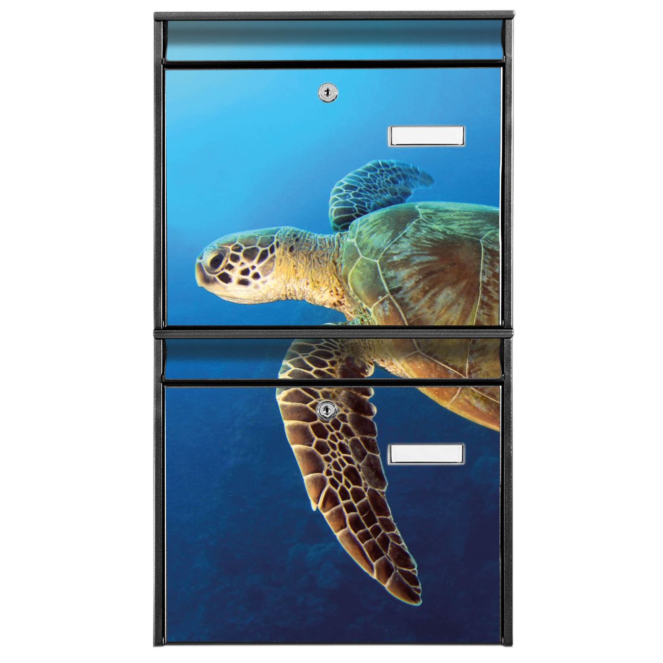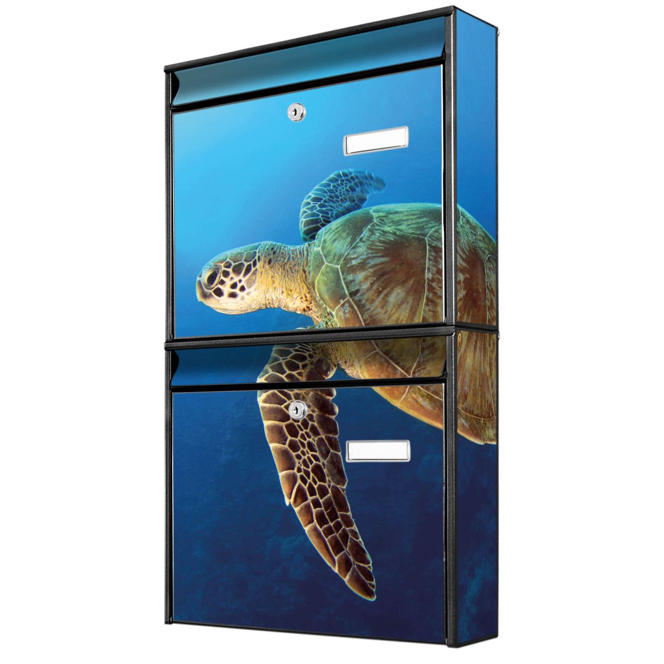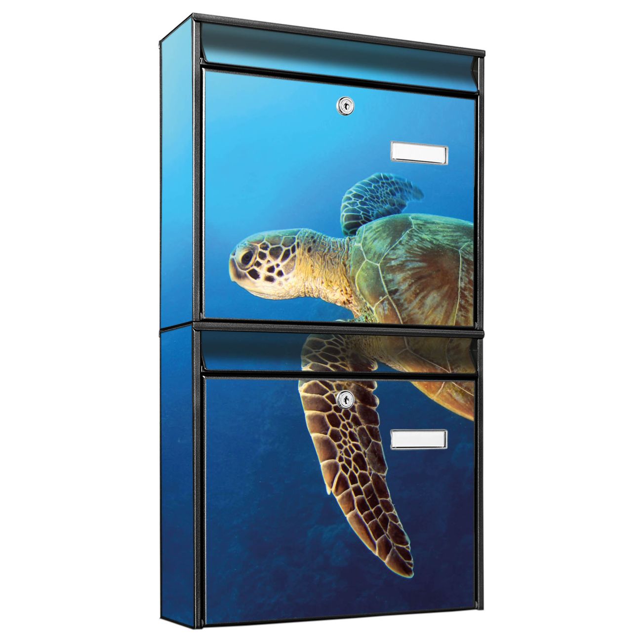 FUNKTION: Die Burg-Wächter Briefkastenanlage mit Motiv Wasserschildkröte bietet Ihnen ausreichend Fassungsvermögen um auch A4 und C4 Sendungen zu empfangen. Das integrierte Namensschild lässt sich individuell beschriften. Wählen Sie aus den Grundfarben weiß, silber und schwarz. DESIGN: Die 2 Briefkästen haben ein ansprechendes und zeitloses Design, ohne dabei auf Funktionalität zu verzichten. Das Material ist sehr stabil, wetterfest und rostfrei. Durch das Motiv Wasserschildkröte werden die Postkästen zu einem Blickfang. DETAILS: Die Postkästen bestehen aus verzinktem Stahl der zusätzlich mit Klarlack versiegelt wurde. Die Kästen sind gesamt 64,5cm hoch, 36,2cm breit und 10cm tief. Das Motiv besteht aus einer wetter- und UV-festen Folie, die Ihren Briefkasten zusätzlich vor Kratzern schützt. Die Postkästen werden mit Montagematerial, je einem Namensschild und je zwei Schlüsseln geliefert. NUTZEN: Das Briefkastenset eignet sich für die Wandmontage, die Größe bietet genügend Platz für Sendungen aller Art. Das zeitlose Design sowie die stabile Bauart bieten Ihnen einen treuen Begleiter für Ihre Post. BANJADO: