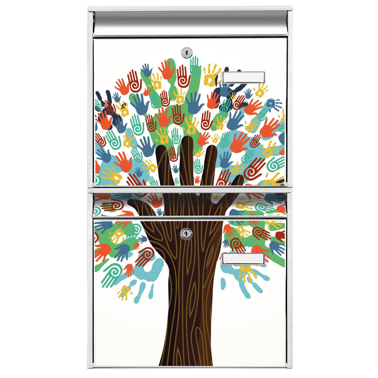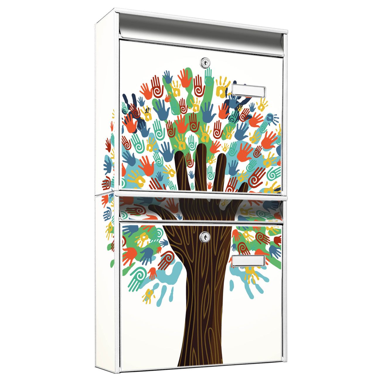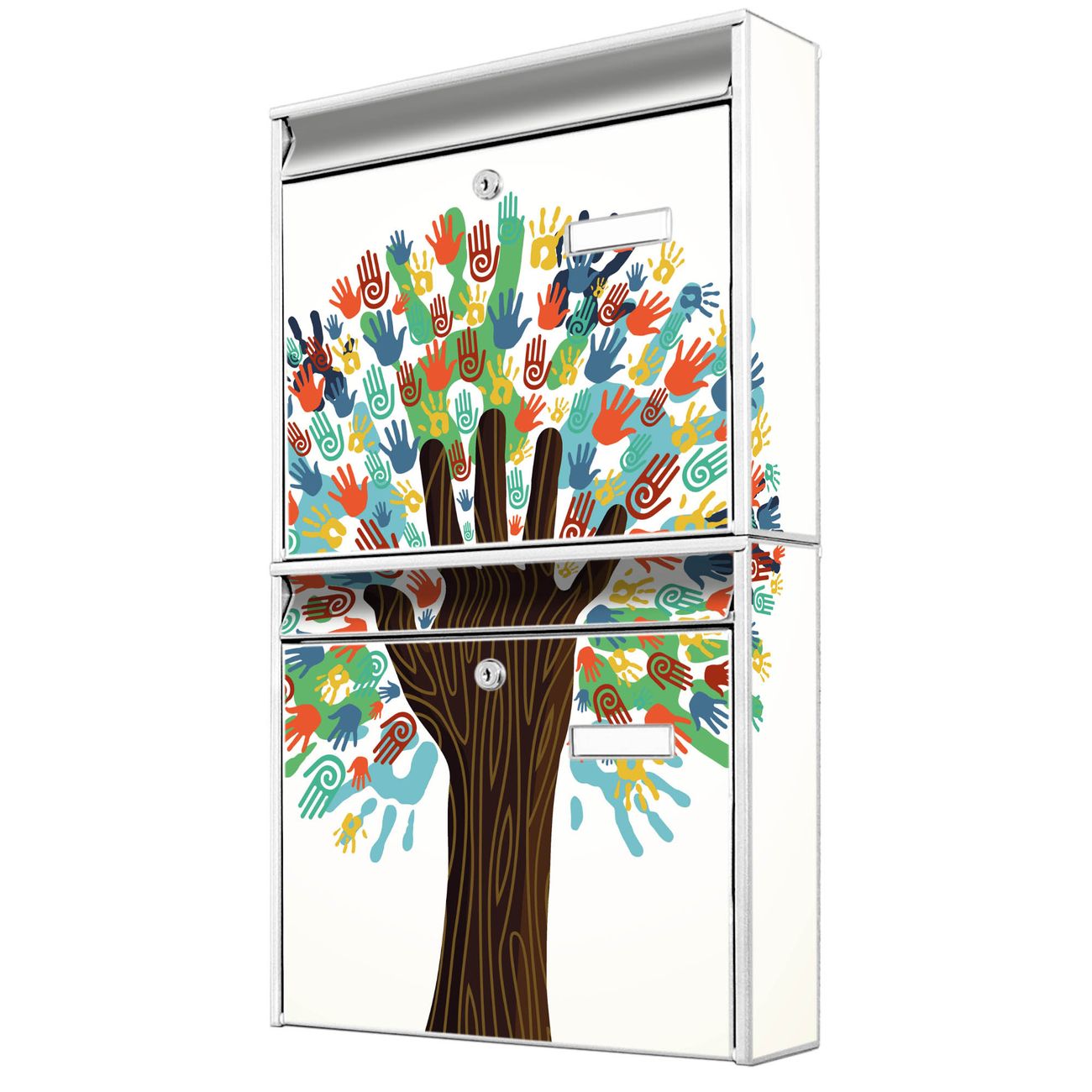 FUNKTION: Die Burg-Wächter Briefkastenanlage mit Motiv We are the World bietet Ihnen ausreichend Fassungsvermögen um auch A4 und C4 Sendungen zu empfangen. Das integrierte Namensschild lässt sich individuell beschriften. Wählen Sie aus den Grundfarben weiß, silber und schwarz. DESIGN: Die 2 Briefkästen haben ein ansprechendes und zeitloses Design, ohne dabei auf Funktionalität zu verzichten. Das Material ist sehr stabil, wetterfest und rostfrei. Durch das Motiv We are the World werden die Postkästen zu einem Blickfang. DETAILS: Die Postkästen bestehen aus verzinktem Stahl der zusätzlich mit Klarlack versiegelt wurde. Die Kästen sind gesamt 64,5cm hoch, 36,2cm breit und 10cm tief. Das Motiv besteht aus einer wetter- und UV-festen Folie, die Ihren Briefkasten zusätzlich vor Kratzern schützt. Die Postkästen werden mit Montagematerial, je einem Namensschild und je zwei Schlüsseln geliefert. NUTZEN: Das Briefkastenset eignet sich für die Wandmontage, die Größe bietet genügend Platz für Sendungen aller Art. Das zeitlose Design sowie die stabile Bauart bieten Ihnen einen treuen Begleiter für Ihre Post. BANJADO: