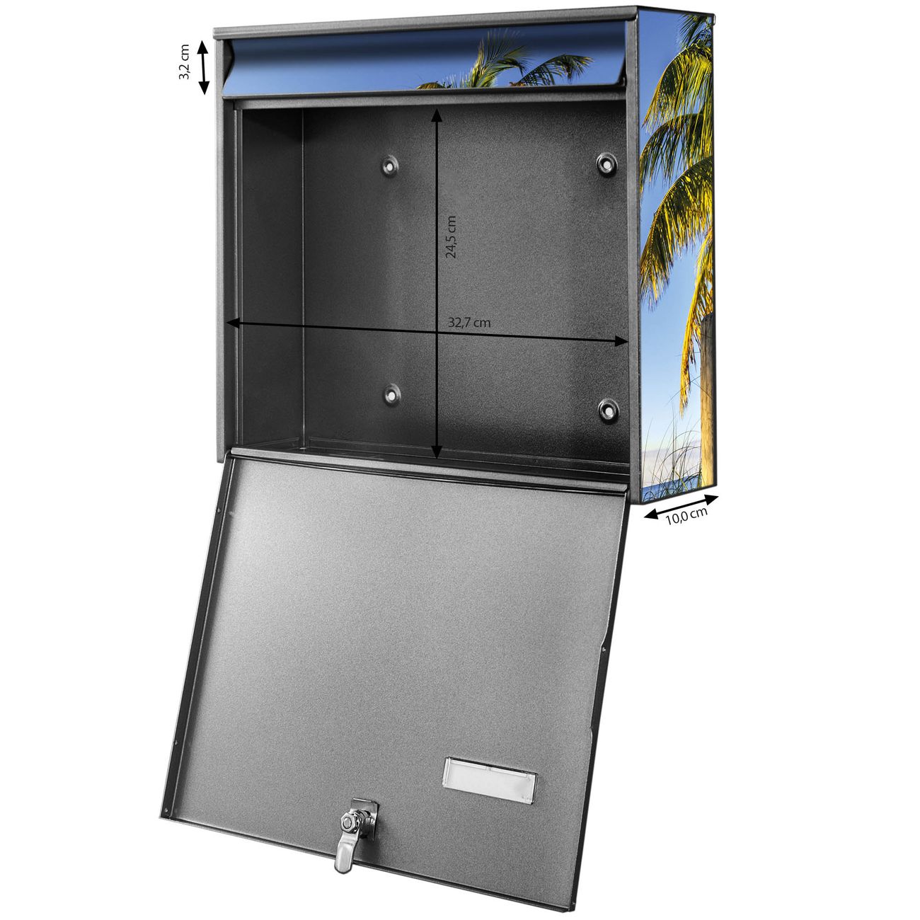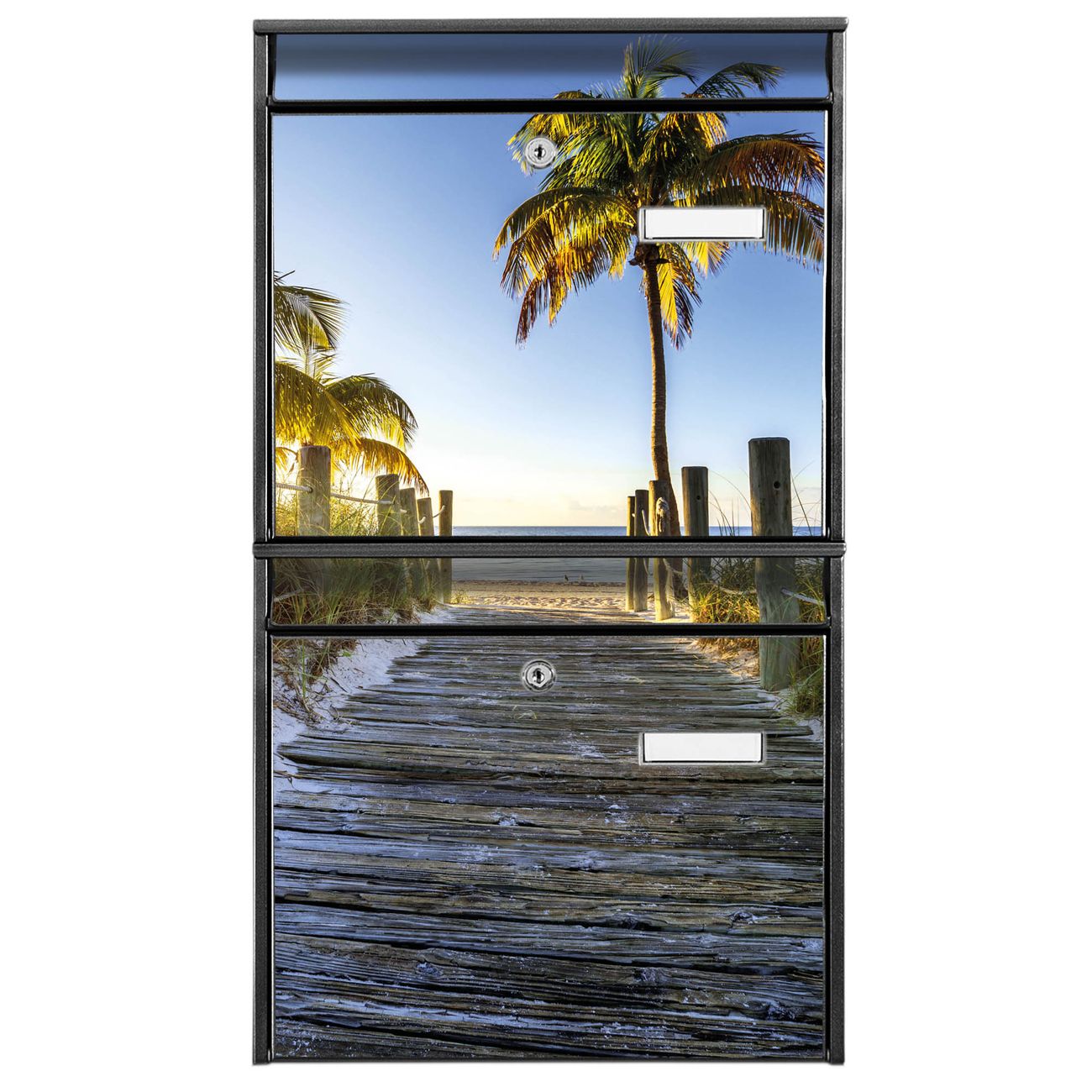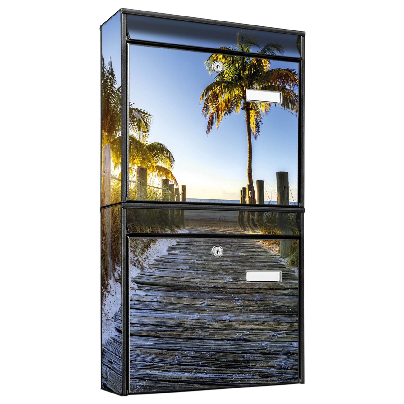 FUNKTION: Die Burg-Wächter Briefkastenanlage mit Motiv Weg zum Strand bietet Ihnen ausreichend Fassungsvermögen um auch A4 und C4 Sendungen zu empfangen. Das integrierte Namensschild lässt sich individuell beschriften. Wählen Sie aus den Grundfarben weiß, silber und schwarz. DESIGN: Die 2 Briefkästen haben ein ansprechendes und zeitloses Design, ohne dabei auf Funktionalität zu verzichten. Das Material ist sehr stabil, wetterfest und rostfrei. Durch das Motiv Weg zum Strand werden die Postkästen zu einem Blickfang. DETAILS: Die Postkästen bestehen aus verzinktem Stahl der zusätzlich mit Klarlack versiegelt wurde. Die Kästen sind gesamt 64,5cm hoch, 36,2cm breit und 10cm tief. Das Motiv besteht aus einer wetter- und UV-festen Folie, die Ihren Briefkasten zusätzlich vor Kratzern schützt. Die Postkästen werden mit Montagematerial, je einem Namensschild und je zwei Schlüsseln geliefert. NUTZEN: Das Briefkastenset eignet sich für die Wandmontage, die Größe bietet genügend Platz für Sendungen aller Art. Das zeitlose Design sowie die stabile Bauart bieten Ihnen einen treuen Begleiter für Ihre Post. BANJADO: