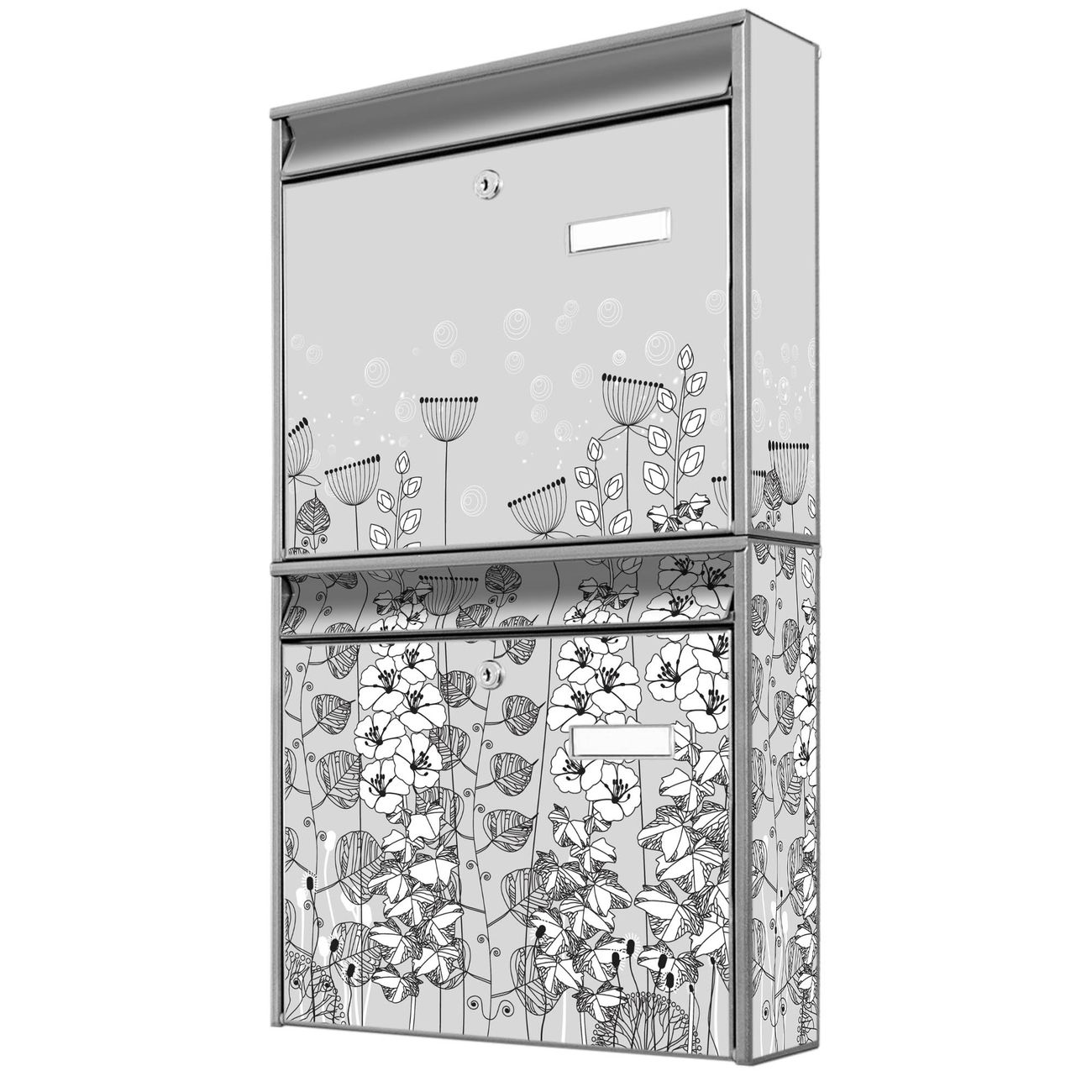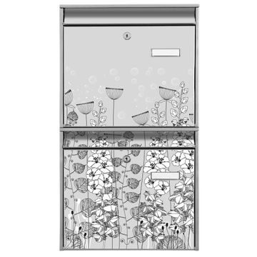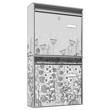 FUNKTION: Die Burg-Wächter Briefkastenanlage mit Motiv Wegesrand bietet Ihnen ausreichend Fassungsvermögen um auch A4 und C4 Sendungen zu empfangen. Das integrierte Namensschild lässt sich individuell beschriften. Wählen Sie aus den Grundfarben weiß, silber und schwarz. DESIGN: Die 2 Briefkästen haben ein ansprechendes und zeitloses Design, ohne dabei auf Funktionalität zu verzichten. Das Material ist sehr stabil, wetterfest und rostfrei. Durch das Motiv Wegesrand werden die Postkästen zu einem Blickfang. DETAILS: Die Postkästen bestehen aus verzinktem Stahl der zusätzlich mit Klarlack versiegelt wurde. Die Kästen sind gesamt 64,5cm hoch, 36,2cm breit und 10cm tief. Das Motiv besteht aus einer wetter- und UV-festen Folie, die Ihren Briefkasten zusätzlich vor Kratzern schützt. Die Postkästen werden mit Montagematerial, je einem Namensschild und je zwei Schlüsseln geliefert. NUTZEN: Das Briefkastenset eignet sich für die Wandmontage, die Größe bietet genügend Platz für Sendungen aller Art. Das zeitlose Design sowie die stabile Bauart bieten Ihnen einen treuen Begleiter für Ihre Post. BANJADO: