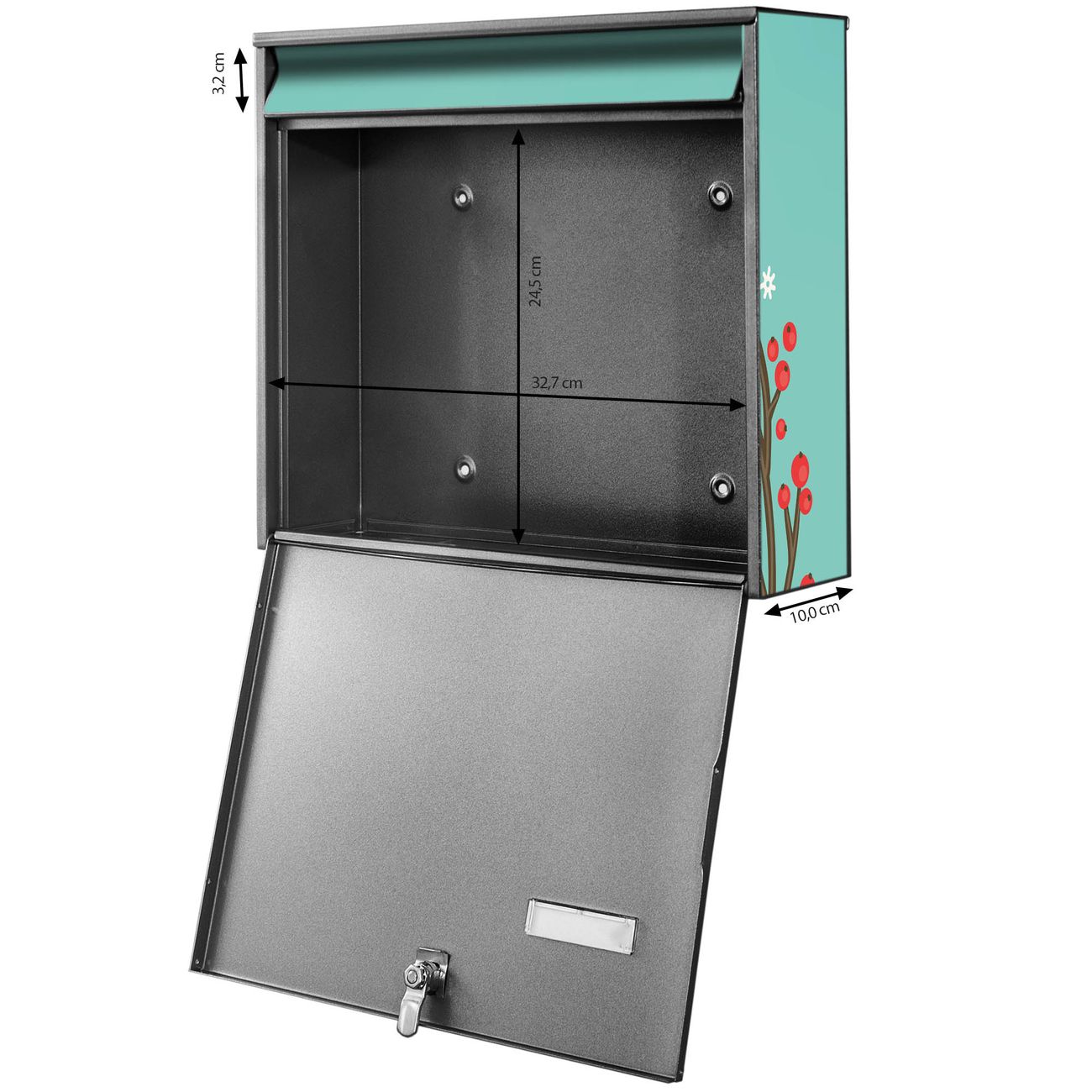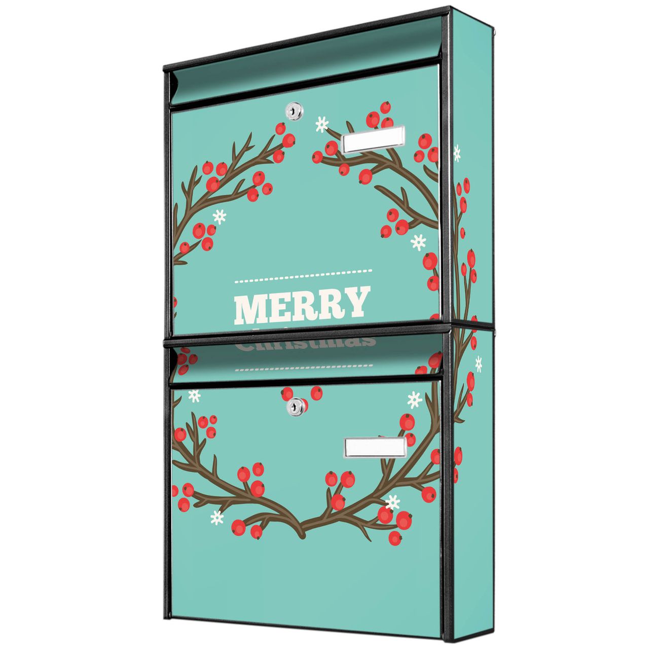 FUNKTION: Die Burg-Wächter Briefkastenanlage mit Motiv Weihnachtsranke bietet Ihnen ausreichend Fassungsvermögen um auch A4 und C4 Sendungen zu empfangen. Das integrierte Namensschild lässt sich individuell beschriften. Wählen Sie aus den Grundfarben weiß, silber und schwarz. DESIGN: Die 2 Briefkästen haben ein ansprechendes und zeitloses Design, ohne dabei auf Funktionalität zu verzichten. Das Material ist sehr stabil, wetterfest und rostfrei. Durch das Motiv Weihnachtsranke werden die Postkästen zu einem Blickfang. DETAILS: Die Postkästen bestehen aus verzinktem Stahl der zusätzlich mit Klarlack versiegelt wurde. Die Kästen sind gesamt 64,5cm hoch, 36,2cm breit und 10cm tief. Das Motiv besteht aus einer wetter- und UV-festen Folie, die Ihren Briefkasten zusätzlich vor Kratzern schützt. Die Postkästen werden mit Montagematerial, je einem Namensschild und je zwei Schlüsseln geliefert. NUTZEN: Das Briefkastenset eignet sich für die Wandmontage, die Größe bietet genügend Platz für Sendungen aller Art. Das zeitlose Design sowie die stabile Bauart bieten Ihnen einen treuen Begleiter für Ihre Post. BANJADO: