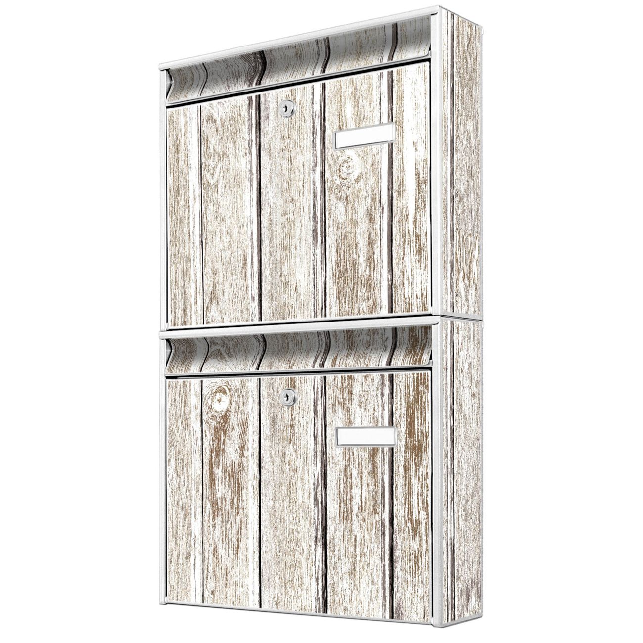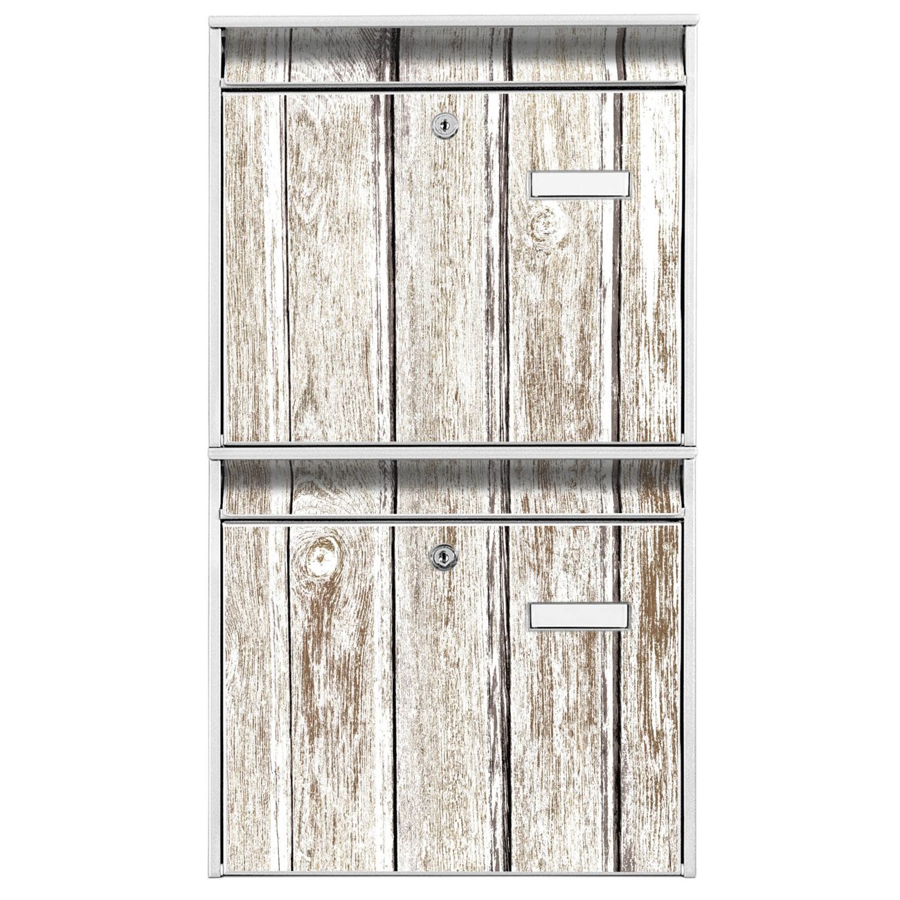 FUNKTION: Die Burg-Wächter Briefkastenanlage mit Motiv Weißes Holz bietet Ihnen ausreichend Fassungsvermögen um auch A4 und C4 Sendungen zu empfangen. Das integrierte Namensschild lässt sich individuell beschriften. Wählen Sie aus den Grundfarben weiß, silber und schwarz. DESIGN: Die 2 Briefkästen haben ein ansprechendes und zeitloses Design, ohne dabei auf Funktionalität zu verzichten. Das Material ist sehr stabil, wetterfest und rostfrei. Durch das Motiv Weißes Holz werden die Postkästen zu einem Blickfang. DETAILS: Die Postkästen bestehen aus verzinktem Stahl der zusätzlich mit Klarlack versiegelt wurde. Die Kästen sind gesamt 64,5cm hoch, 36,2cm breit und 10cm tief. Das Motiv besteht aus einer wetter- und UV-festen Folie, die Ihren Briefkasten zusätzlich vor Kratzern schützt. Die Postkästen werden mit Montagematerial, je einem Namensschild und je zwei Schlüsseln geliefert. NUTZEN: Das Briefkastenset eignet sich für die Wandmontage, die Größe bietet genügend Platz für Sendungen aller Art. Das zeitlose Design sowie die stabile Bauart bieten Ihnen einen treuen Begleiter für Ihre Post. BANJADO: